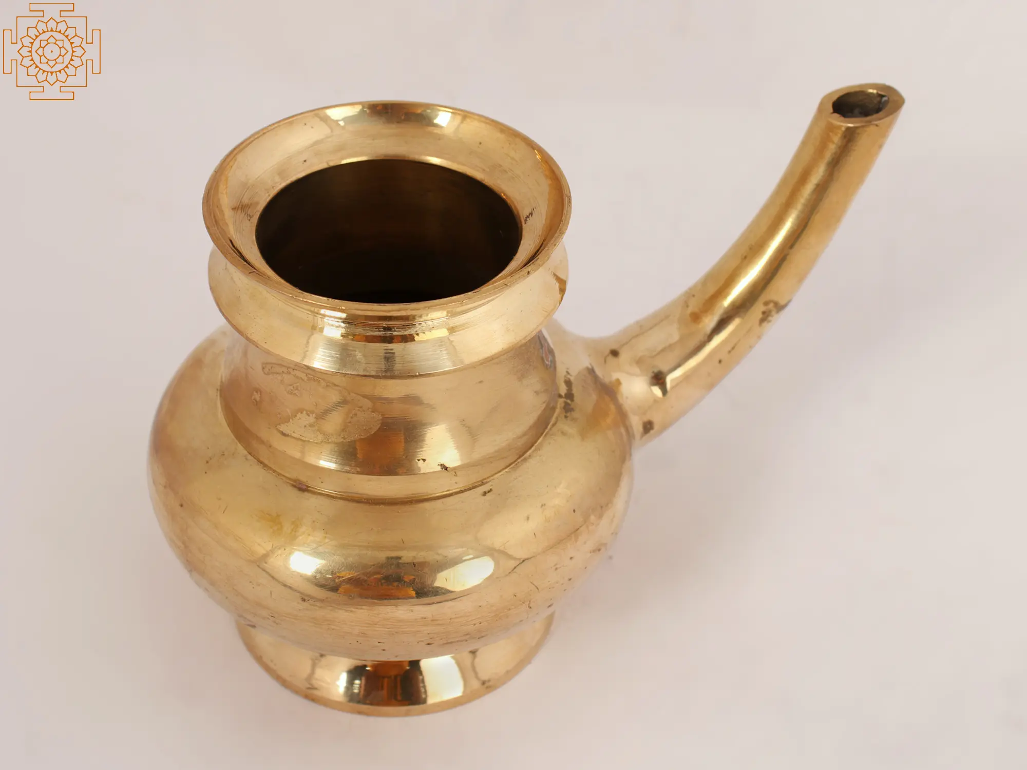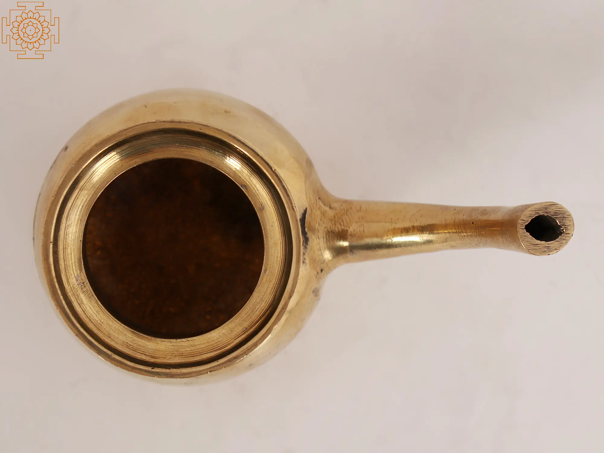 This brass Kindi is a traditional vessel to hold and pour water. These brass Kindis are used for both domestic and ritualistic purposes. The belly of the Kindi is globular growing into a gently grooved neck that is high and shapely. The most unique feature of this vessel is the upturned pouring spout attached to the belly. The spout is long and tapering. A channeled rim is present around the neck for ornamentation. There is also a flaring foot ring as the stand to balance the rather circular pot. This Kindi is a very important ritual item and is often seen carried by Sadhus during their expeditions.