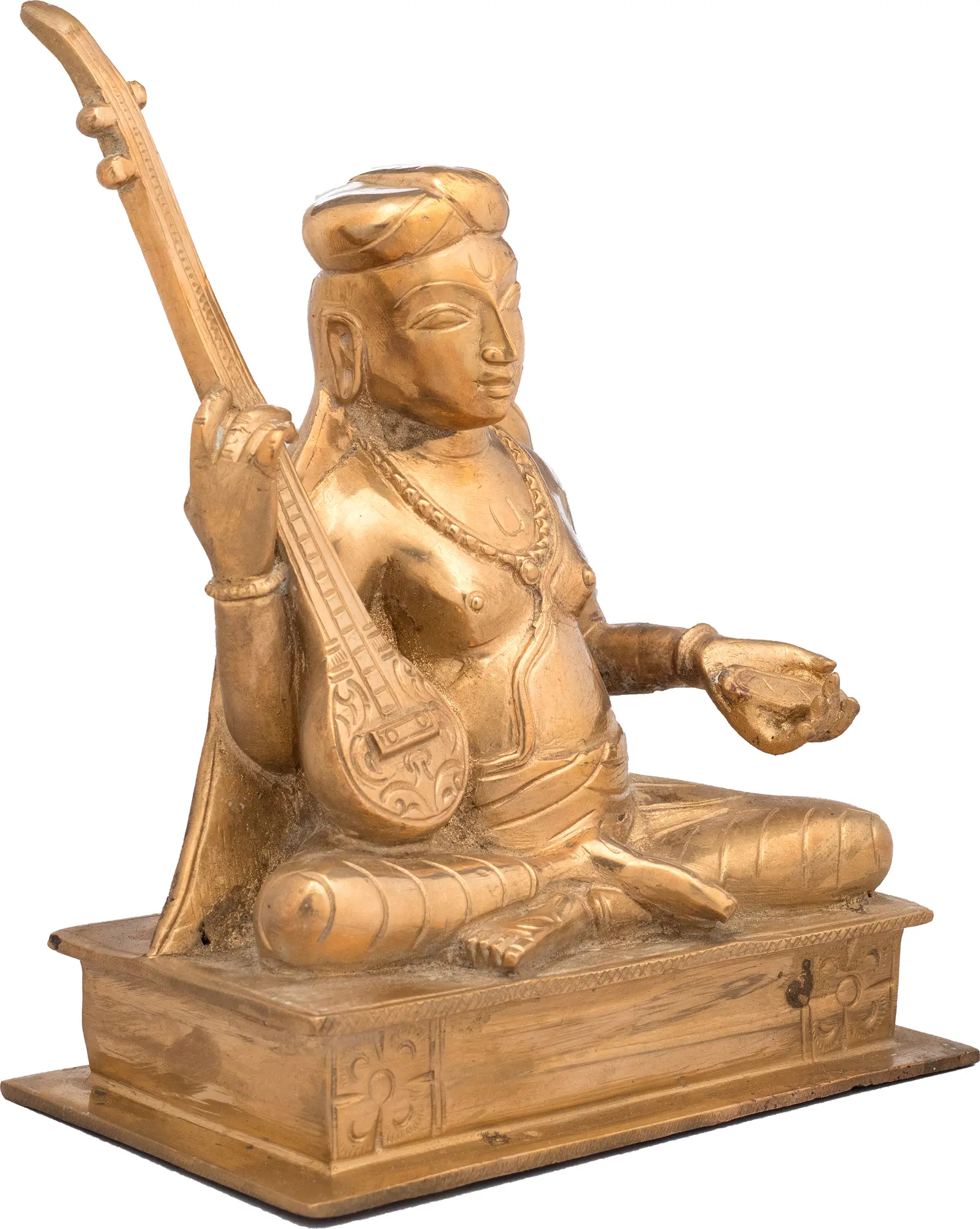 The choice of bronze as the medium further enhances the statue's timeless appeal. Bronze has been used for centuries in India to create sacred sculptures, valued for its durability and its ability to hold intricate details. This particular piece, with its warm patina and the subtle signs of its artisanal creation, carries a palpable sense of heritage. It is a tangible link to a rich cultural and artistic tradition, a reminder of the enduring power of devotion and the beauty of sacred art. This statue is more than just an object of art; it is an embodiment of faith, a testament to the spiritual heights that can be reached through the harmonious union of music and devotion. It is a piece that can grace any space, bringing with it an atmosphere of tranquility, inspiration, and timeless artistic beauty.
