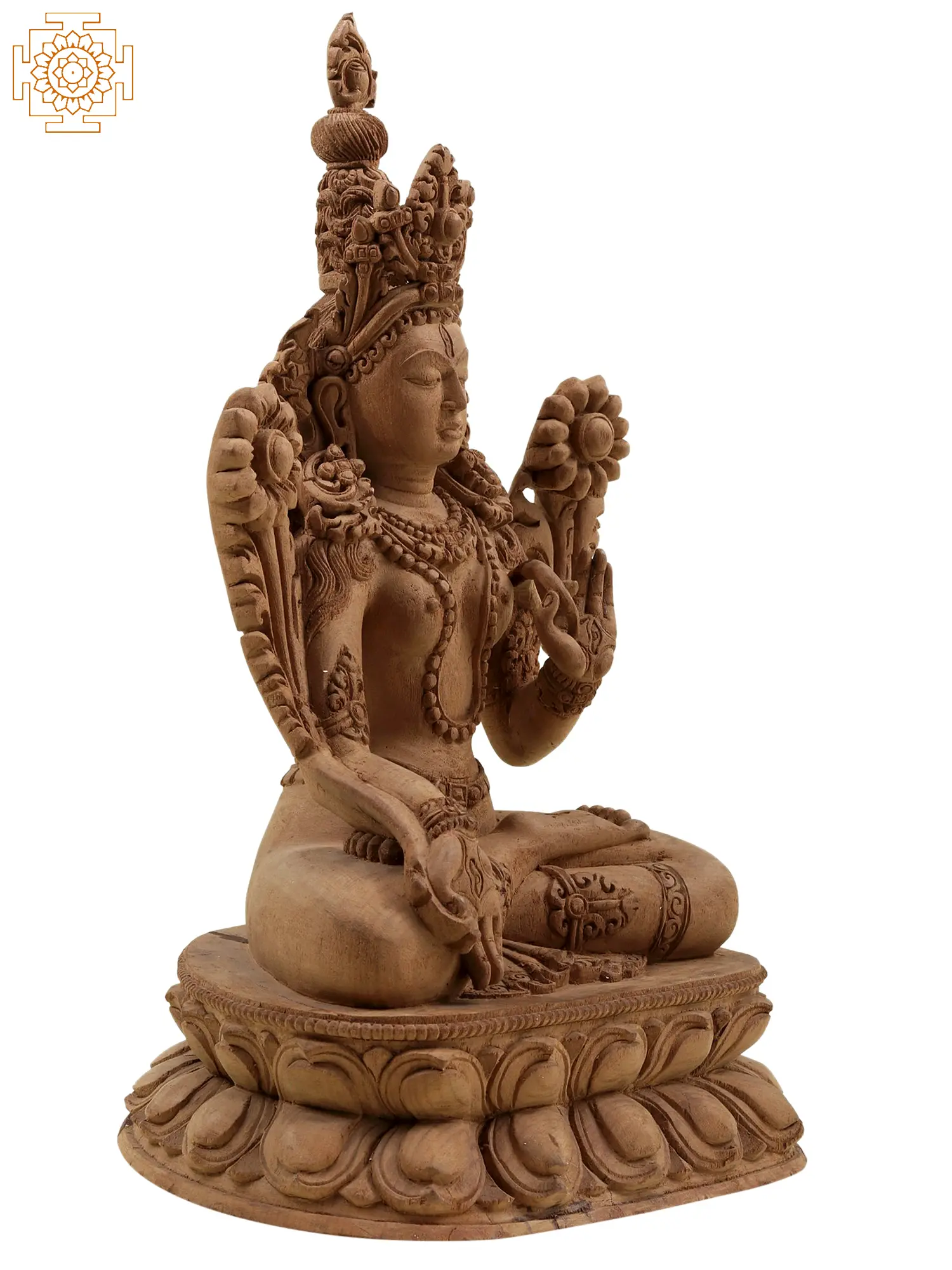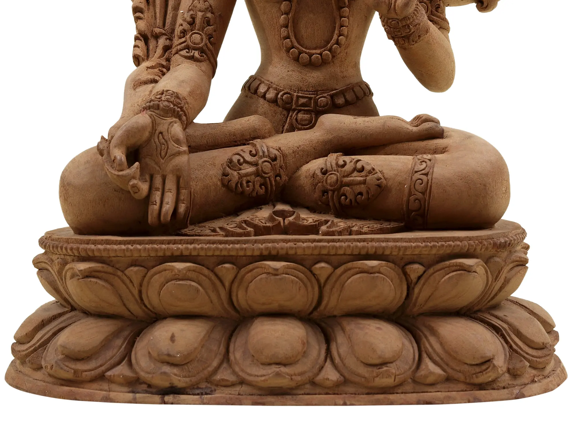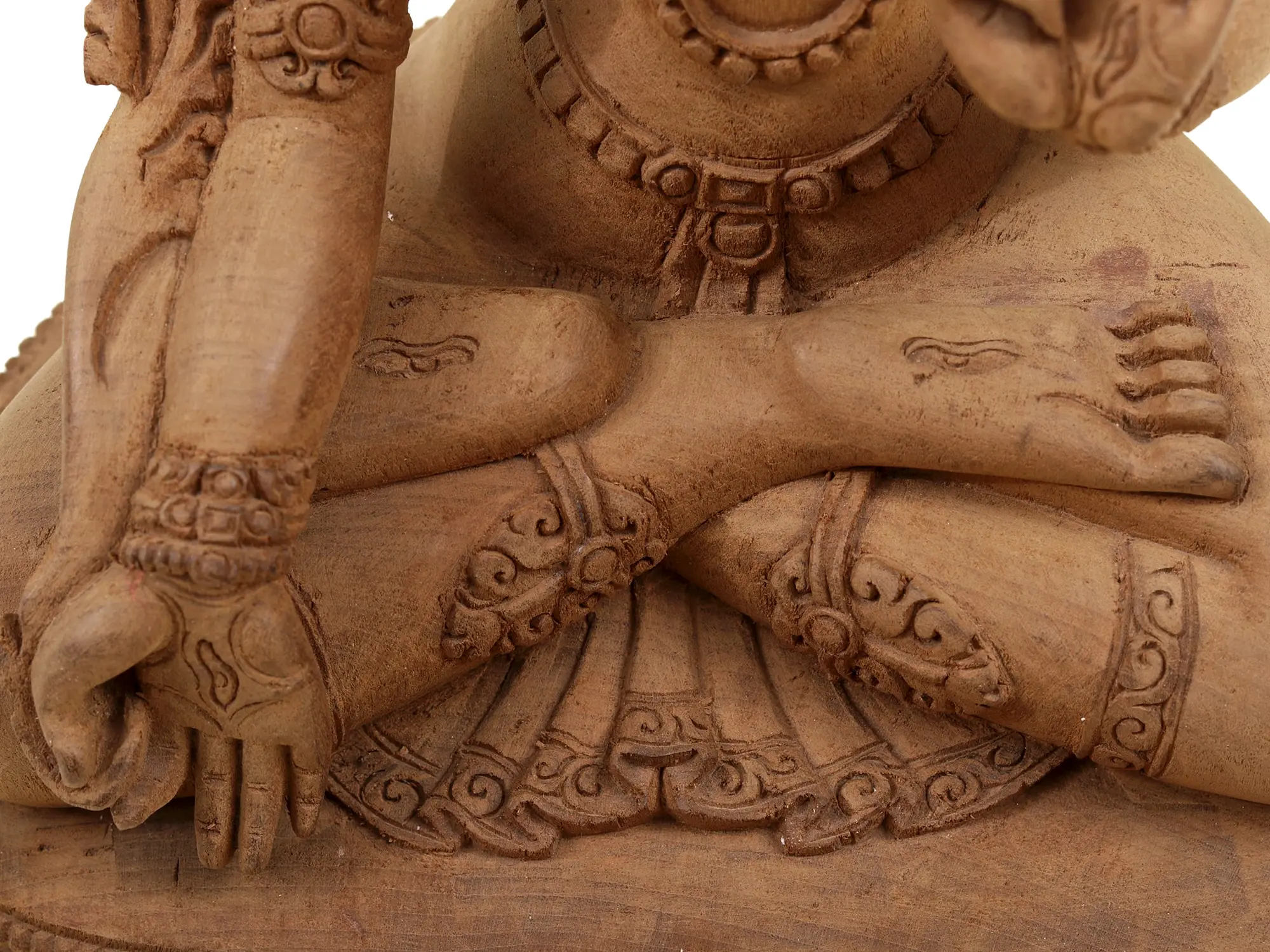 Saptalochani- seven-eyed one or Mrityuvanchana- she who alludes to death, are epithet for the Buddhist goddess White Tara, a powerful protectress for the seekers of enlightenment. In this wooden statue, White Tara appears in her divinely beautiful form, as a youthful female, seated on a lovely lotus throne. Her peaceful, meditative expressions are complemented by the ornate jewellery, carved in the idiom of Nepalese art.