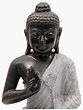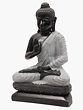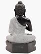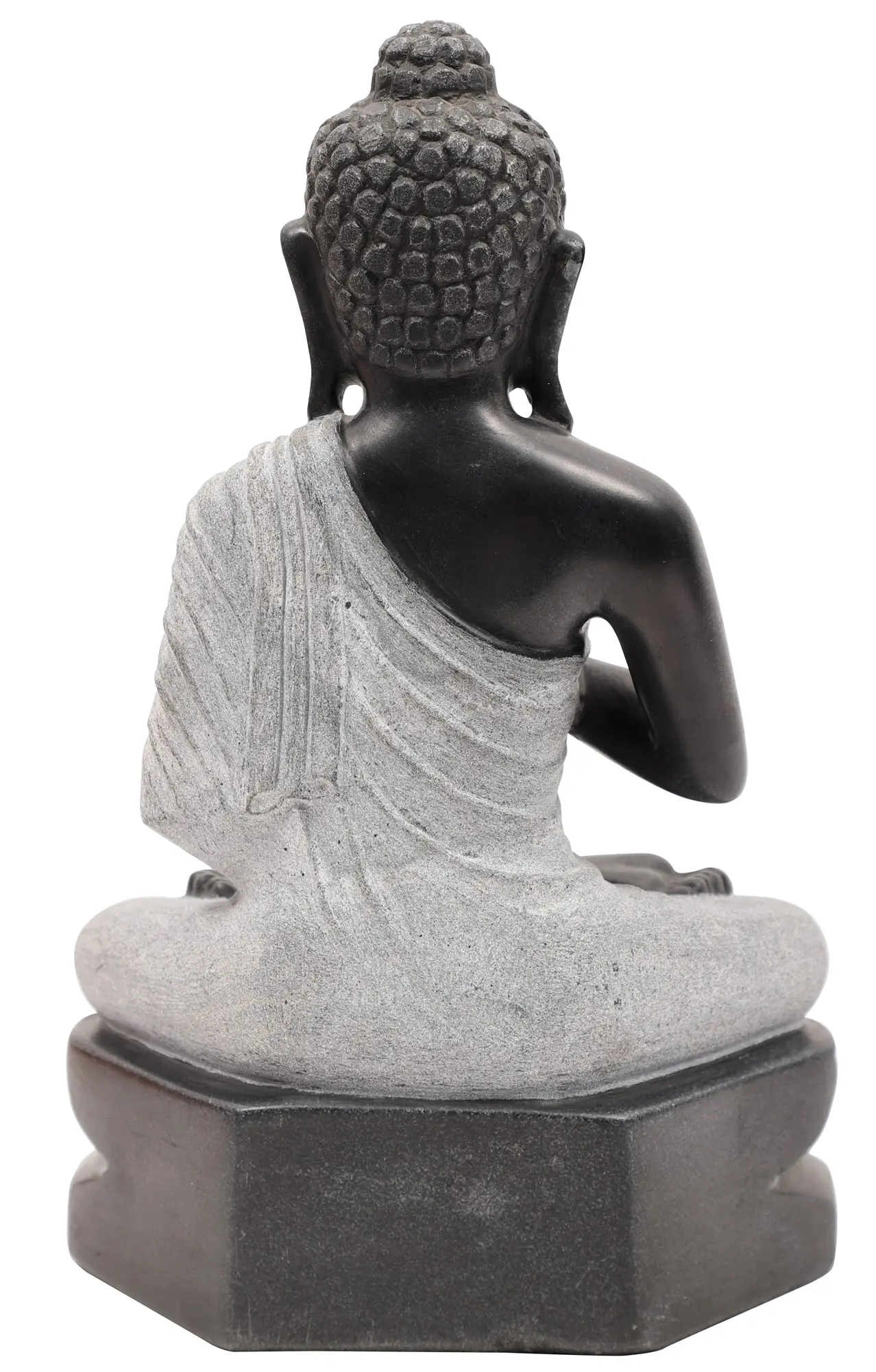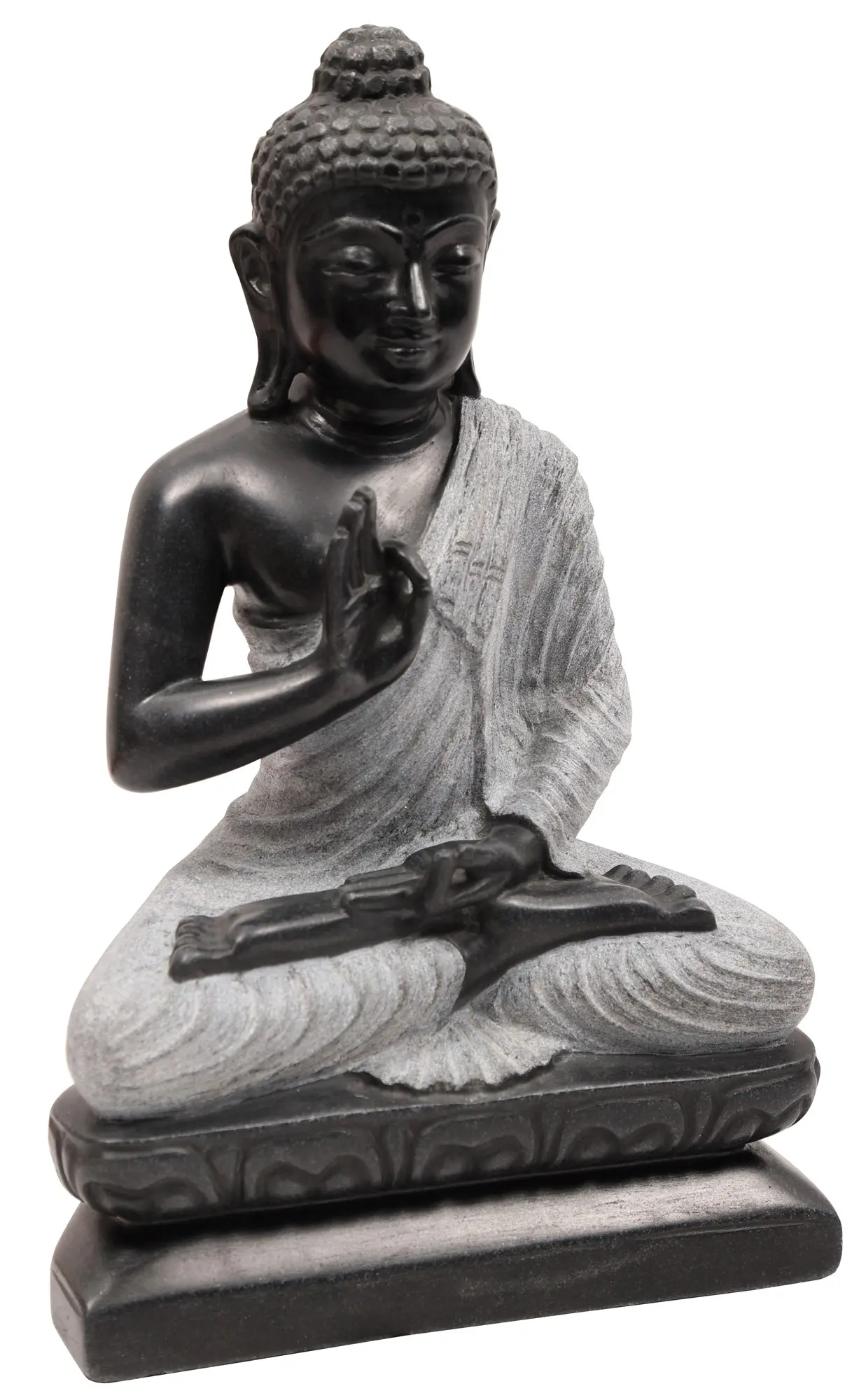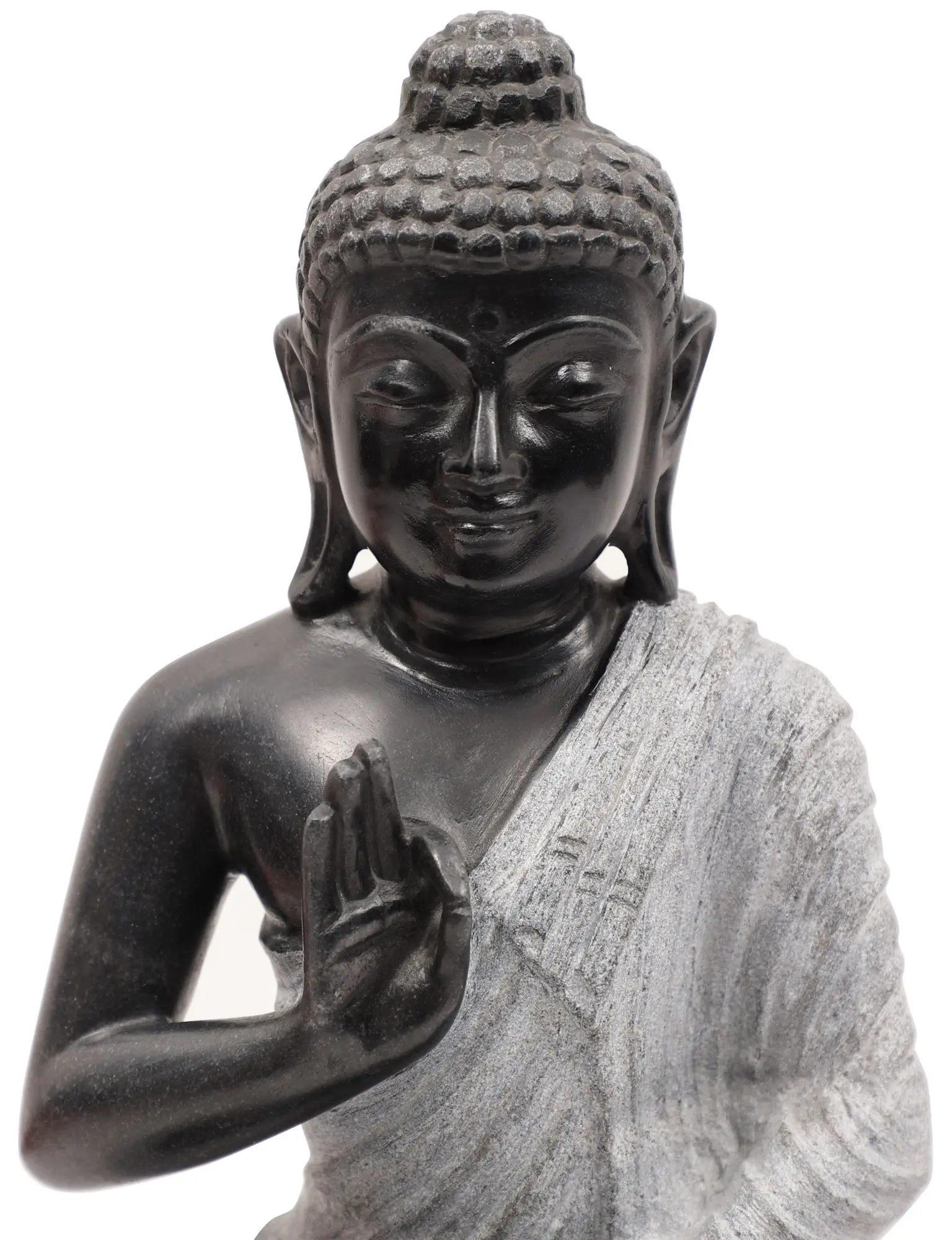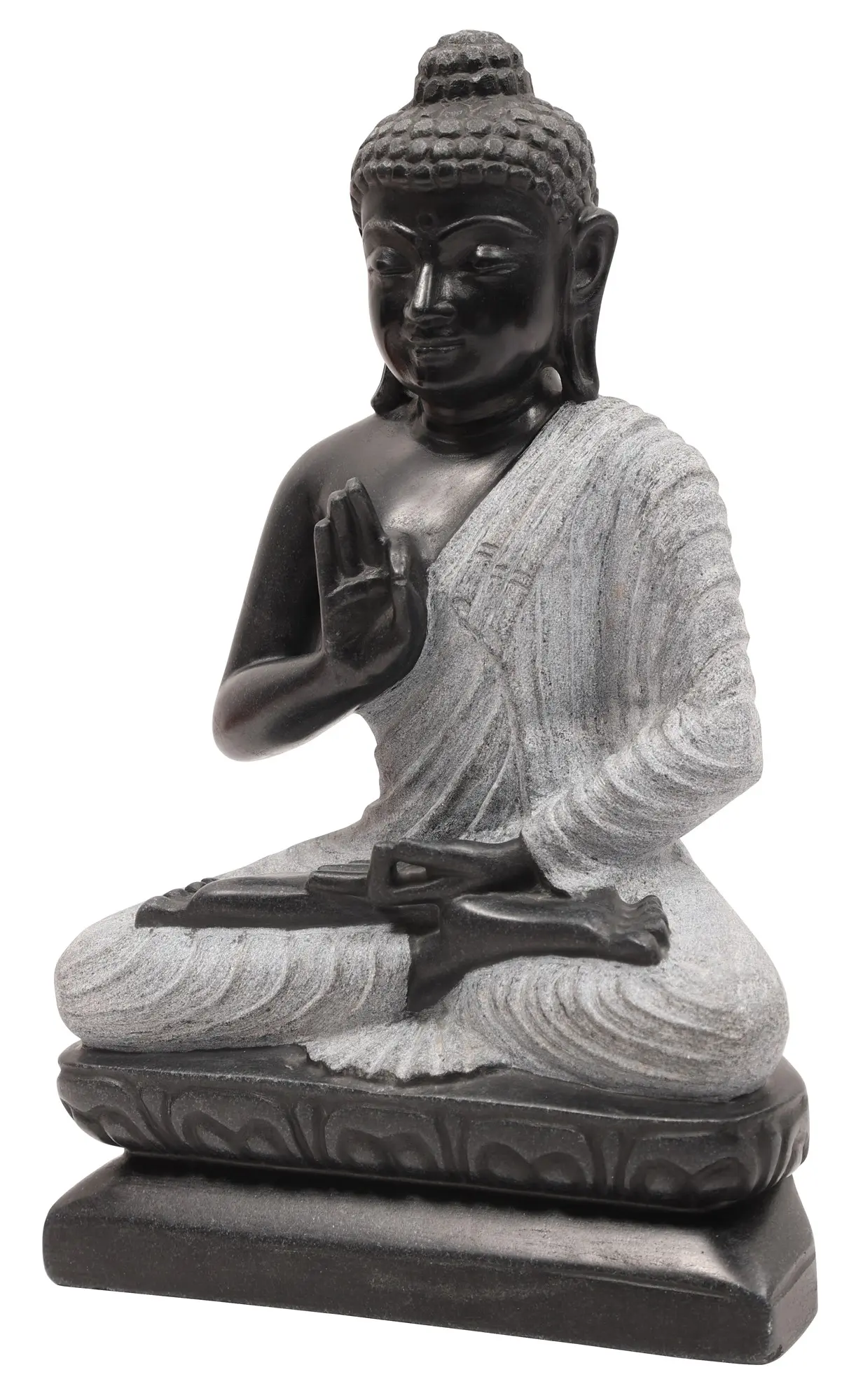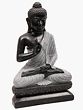 This is a strictly bitone composition. The charcoal coloured complexion of His body makes for a striking contrast with the colloidal white of His robe. Like it is the case with traditional seated Buddha depictions, it is draped over a single left shoulder. Zoom in on the silken folds of the robe, the lifelike fabric-like folds having been sculpted from pure marble. It is in this aspect of the work wherein the hallmark of superior handiwork lies. The long earlobes grazing the zenith of His clavicles, the delicate fingers gathered in the dharmachakra mudra, and the quiet composure of countenance are sure to make your visitors pause and take notice of such finesse.