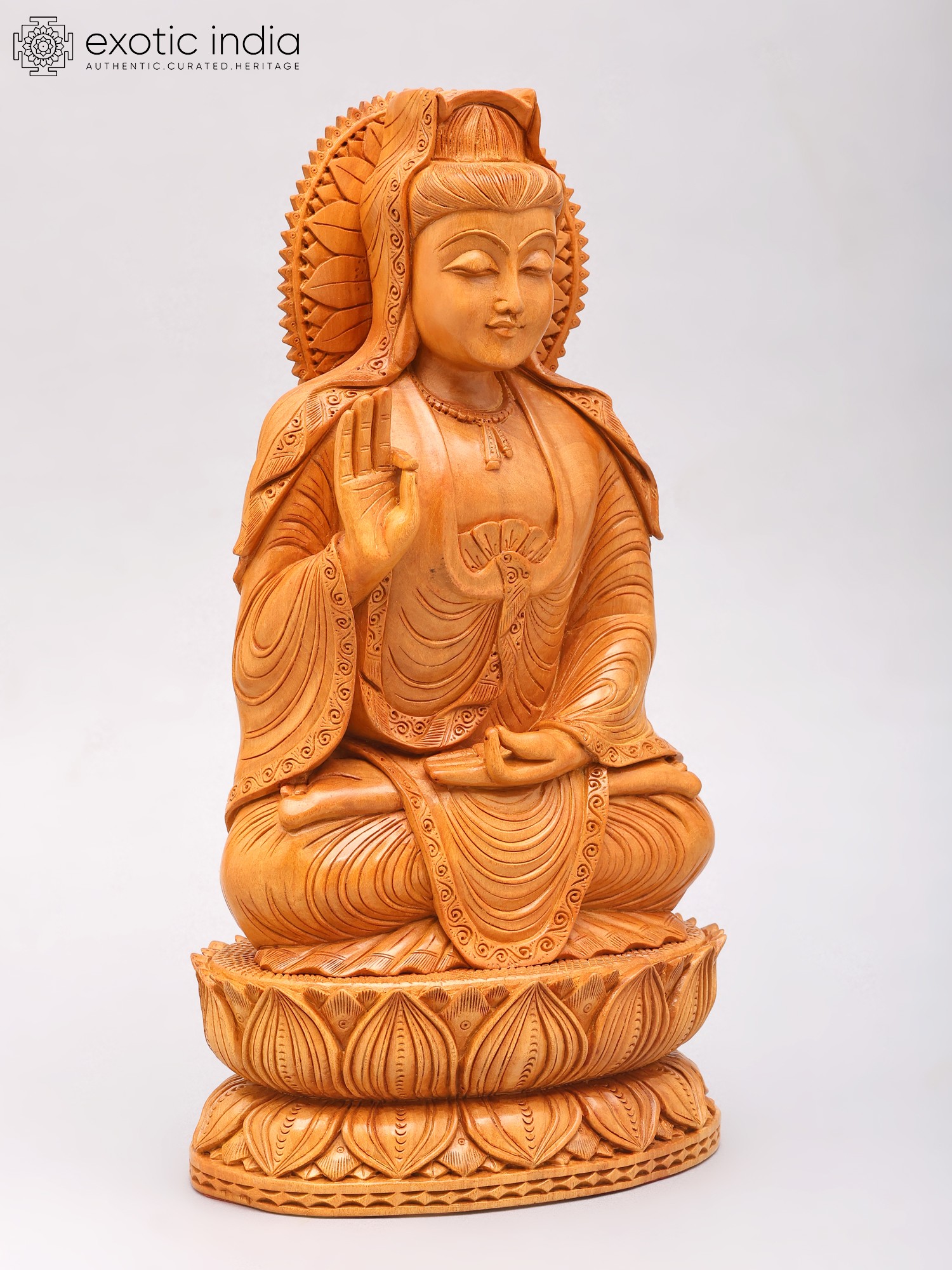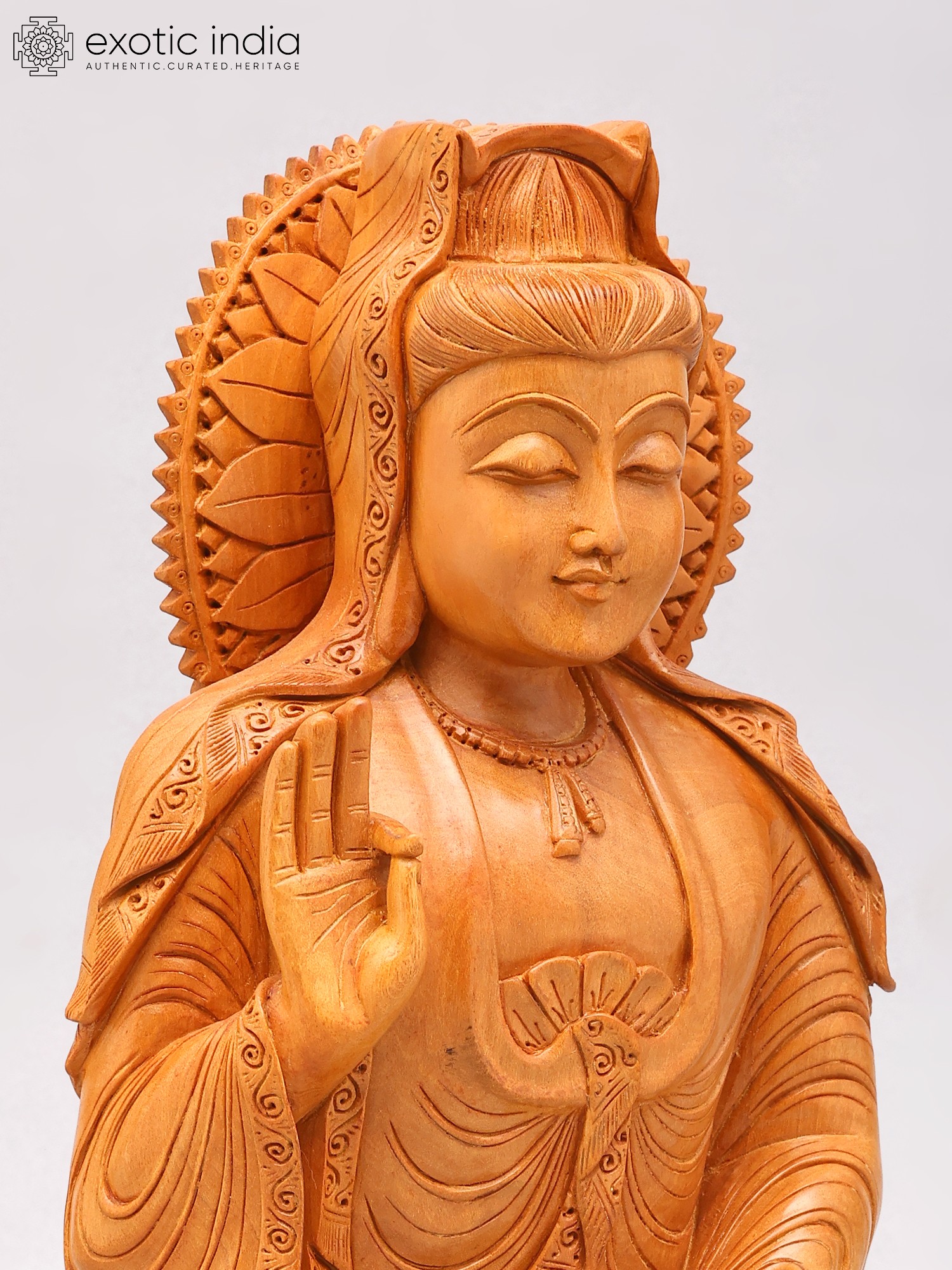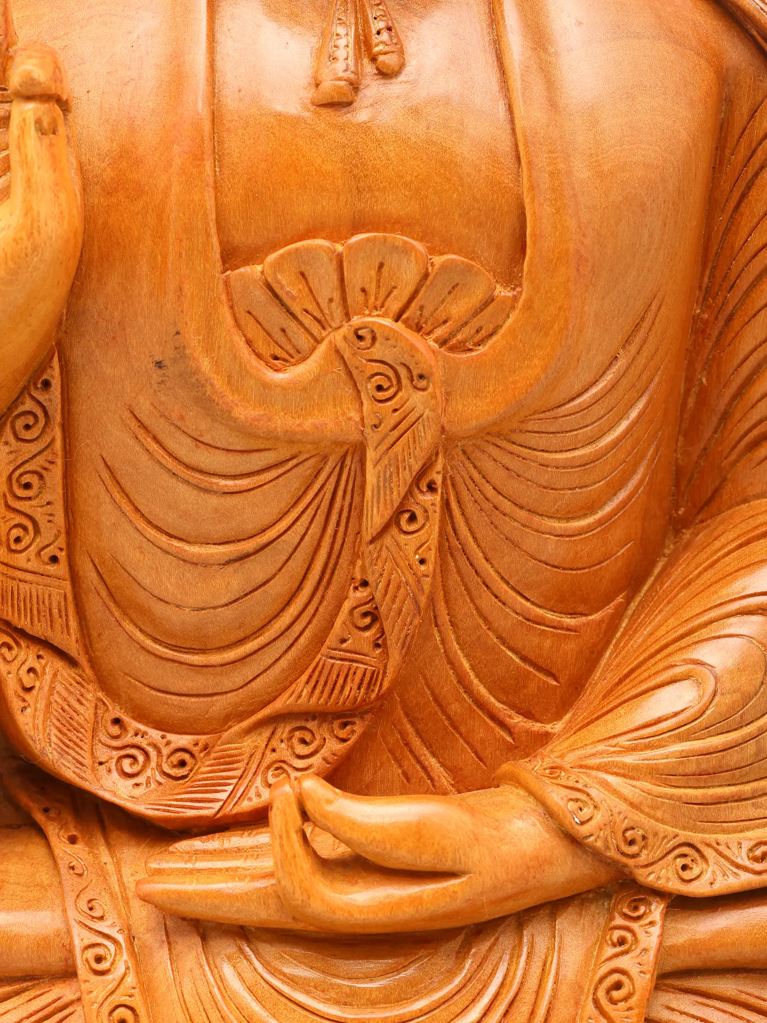 Crafted from premium wood with detailed hand-carving showcasing flowing robes and symbolic gestures.