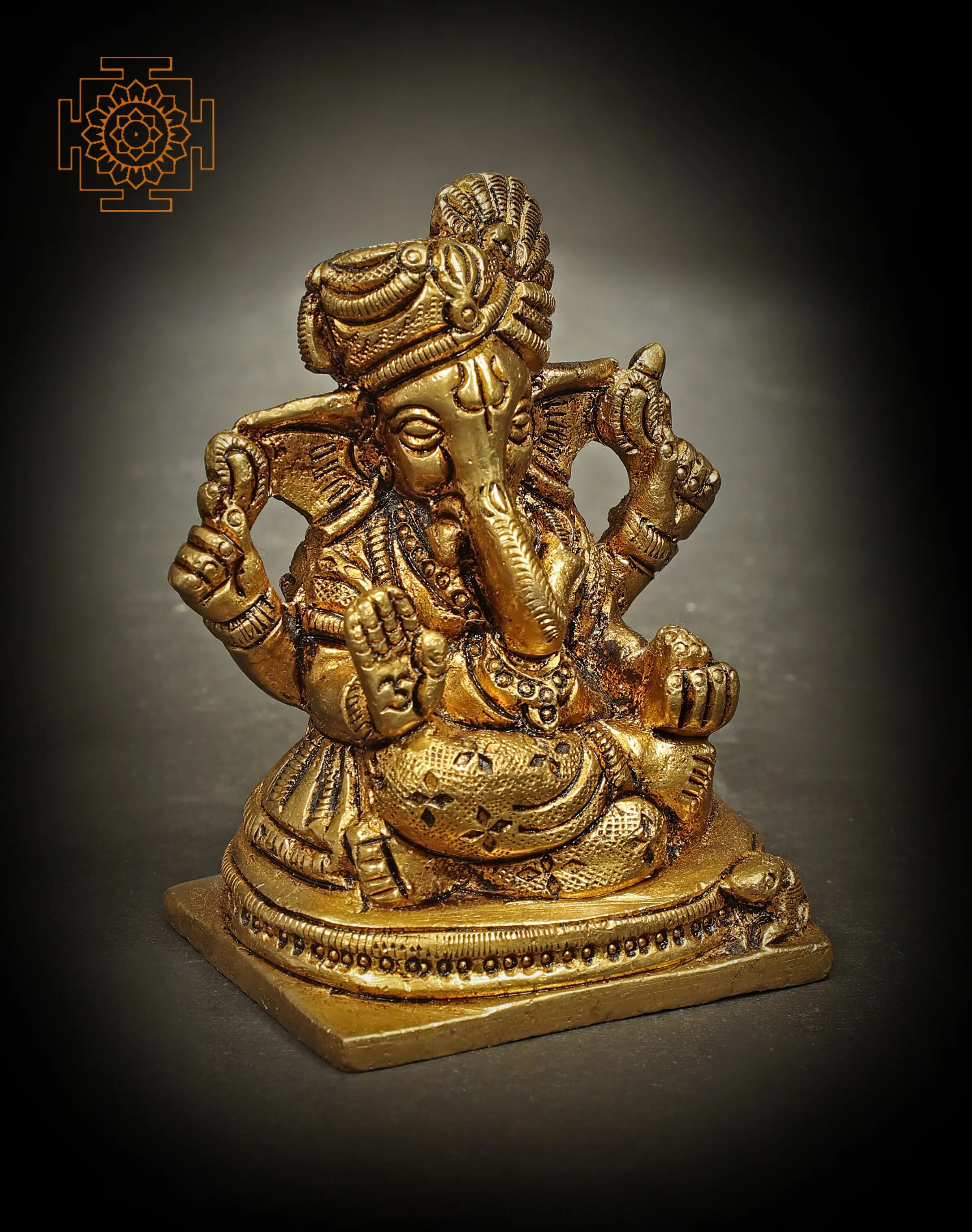In this brass rendition, Lord Ganesha, the provider of Success, exudes an enchanting aura. With a trident mark adorning his noble forehead, Ganesha embodies Lord Shiva’s divine connection. The turban (Pagri) crowning his head symbolises wisdom and sovereignty, accentuating his regal presence. His raised right hand extends heartfelt blessings, bestowing protection and guidance upon devotees. Cradling a Modak, the sweet delicacy, Ganesha epitomises the fusion of intellect and indulgence, teaching us to savour life’s sweetness while overcoming obstacles. This divine form inspires reverence, faith, and the pursuit of balance in life.