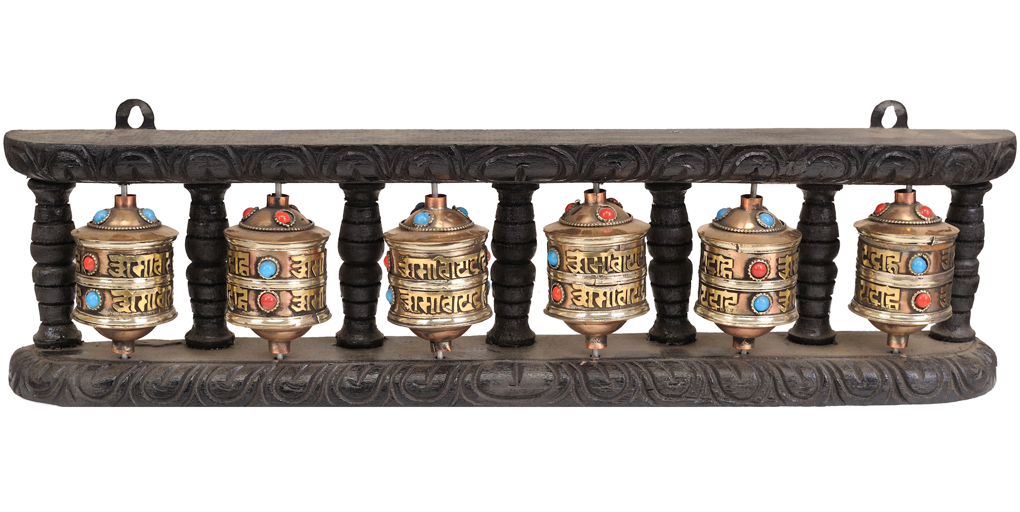 Invite serenity and spiritual harmony into your home or meditation space with this exquisite set of six prayer wheels. Each wheel is meticulously crafted, featuring a blend of warm brass, rich copper, and a dark, intricately carved wooden base and pillars. The prayer wheels themselves are adorned with the sacred mantra "Om Mani Padme Hum" in elegant Tibetan script, a profound invocation representing compassion and wisdom. Tiny, vibrant turquoise and red stones are embedded around the circumference of each wheel, adding a touch of celestial sparkle and symbolizing the preciousness of spiritual realization.