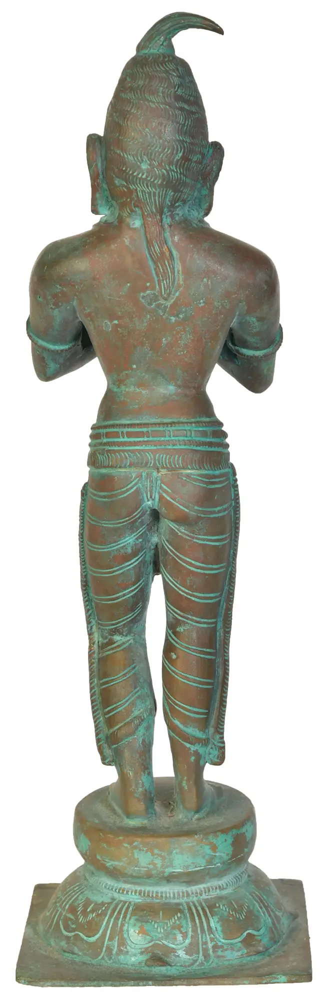 This exquisite bronze statue, hailing from the renowned artisan village of Swamimalai, captures the serene presence of a devoted Shaivite saint. Crafted from Panchaloha, a sacred five-metal alloy believed to possess auspicious properties, the sculpture embodies centuries of tradition and spiritual devotion. The artisan's skill is evident in every detail, from the gentle curve of the saint's folded hands in the Anjali Mudra, a gesture of profound respect and salutation, to the delicate rendering of the dhoti, adorned with intricate horizontal pleats. The verdigris patina that graces the bronze adds a sense of ancient wisdom and timeless beauty, hinting at the passage of ages and the enduring nature of faith.