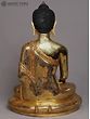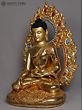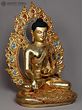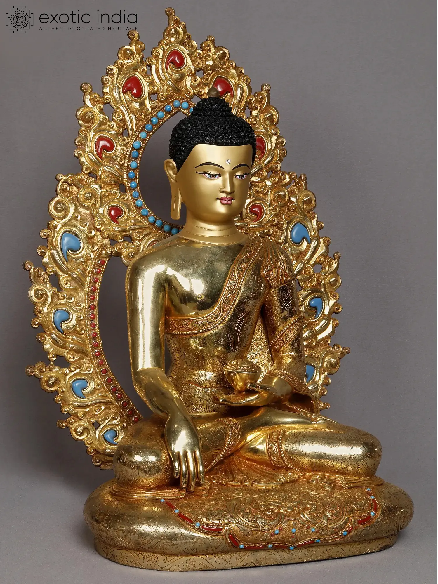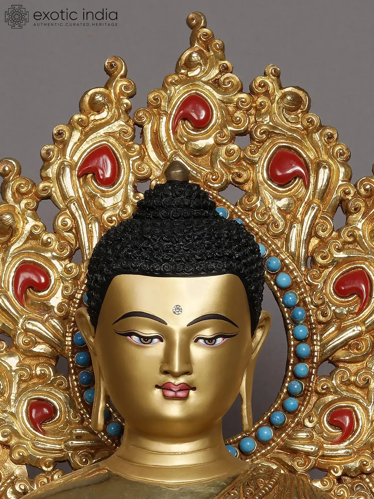 A fleshiness on his face and a balance in his posture give this Nepalese statue of Buddha a true-to-life quality, which is rare in sculptures. The gilded aureole behind this Bhumisparsha Buddha statue is studded with beautifully cut coral and turquoise and is shaped like blossoming vines which represent auspiciousness and the origin of life.
