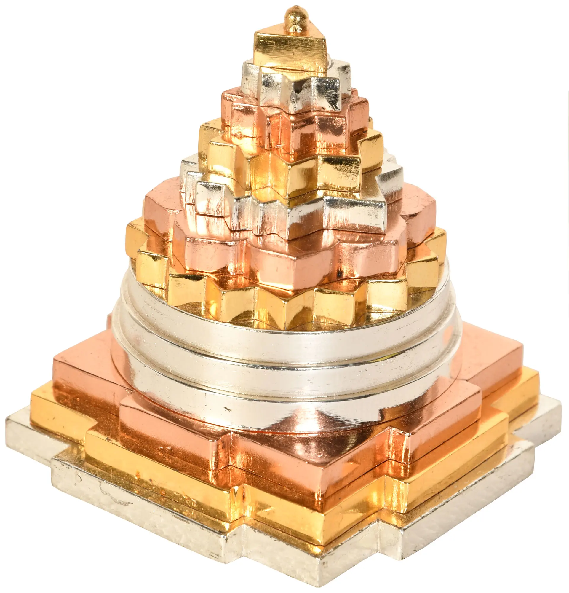 This meticulously crafted brass Yantra is a testament to the timeless art of sacred geometry. Each layer and angle is precisely formed to honor the spiritual significance of the Shri Meru Chakra. The interplay of gold, silver, and copper tones symbolizes the three Gunas (Sattva, Rajas, and Tamas) as well as the universal elements. Its compact size makes it ideal for placement in your home altar, meditation space, office, or any area where you wish to invite positive energy and amplify abundance. This brass Yantra is not merely an artifact but a potent tool for spiritual growth and material manifestation.