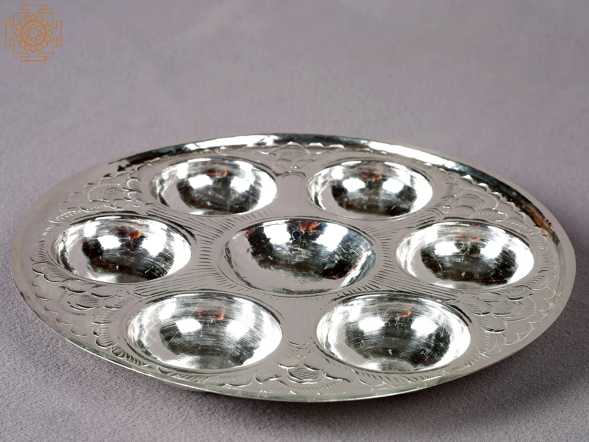 Nepal's artistic legacy shines through this Silver Carved Puja Thali (Saptapala). In this vibrant culture, rituals and offerings are an integral part of daily life. This exquisite plate serves as a canvas for devotion. The seven compartments, each provided to be filled with symbolic offerings like rice, flowers, and incense, represent the divine presence in various forms. In the center, the 'Sri Yantra' signifies the cosmos' geometric perfection. As you engage in your daily puja rituals with this thali, may it serve as a conduit to connect with the divine, and may its intricate designs remind you of the harmonious balance in the universe.