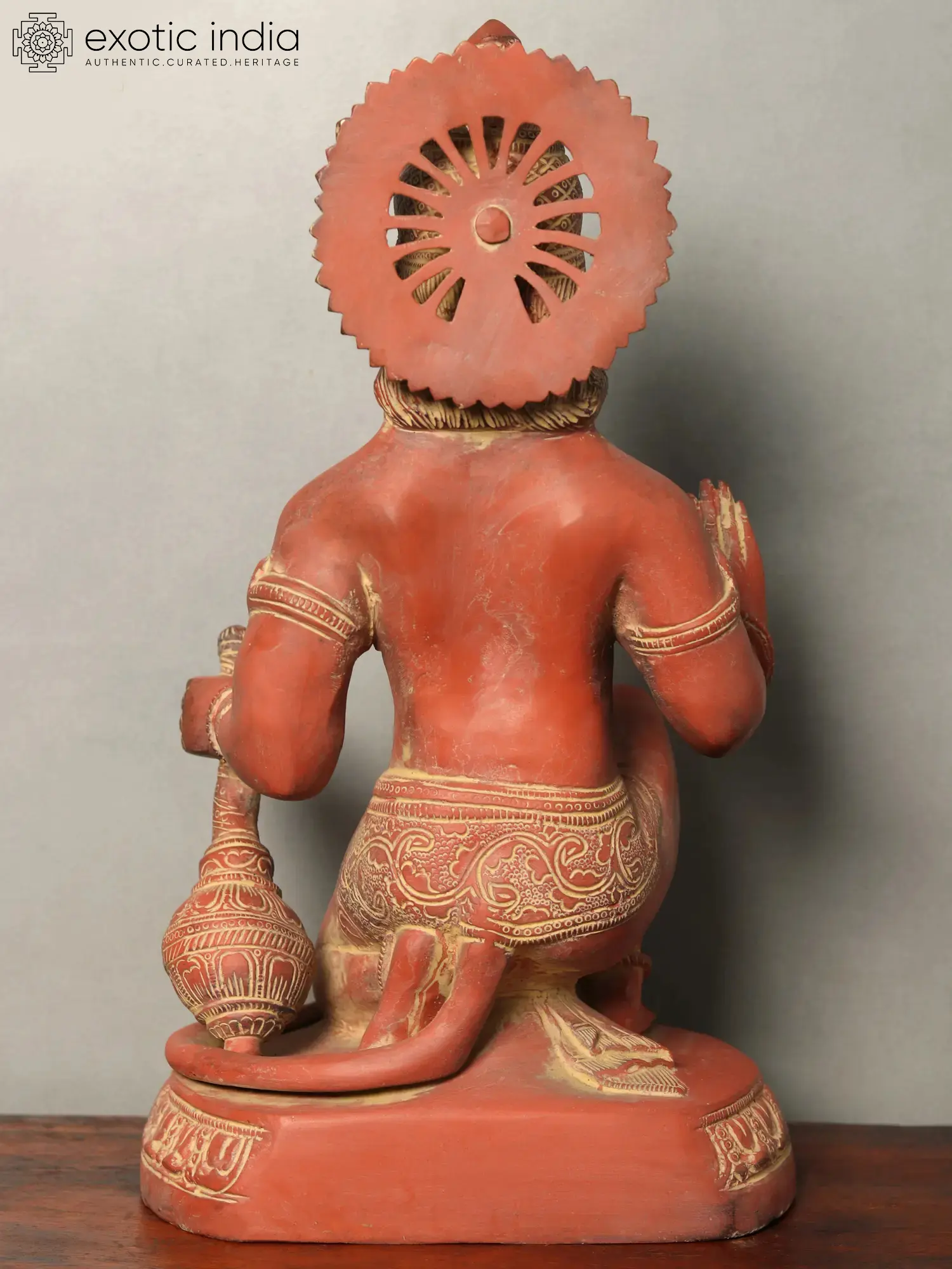 Kneeling as he sits, Lord Hanuman, the epitome of devotion and strength, graces this remarkable sculpture. With his hand raised in the Abhaya Mudra, the gesture of fearlessness and protection, and firmly holding his mighty Gada (mace), Lord Hanuman exudes an aura of power and unwavering resolve. The vibrant red color, symbolizing vitality and strength, emphasizes his powerful presence and serves as a visual reminder of the fiery energy that lies within. As you bring this resplendent sculpture into your space, prepare to embark on a transformative journey of divine protection and inner fortitude.