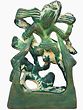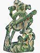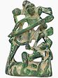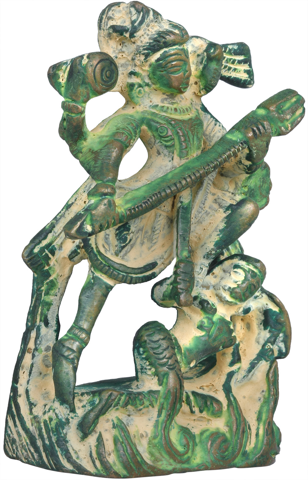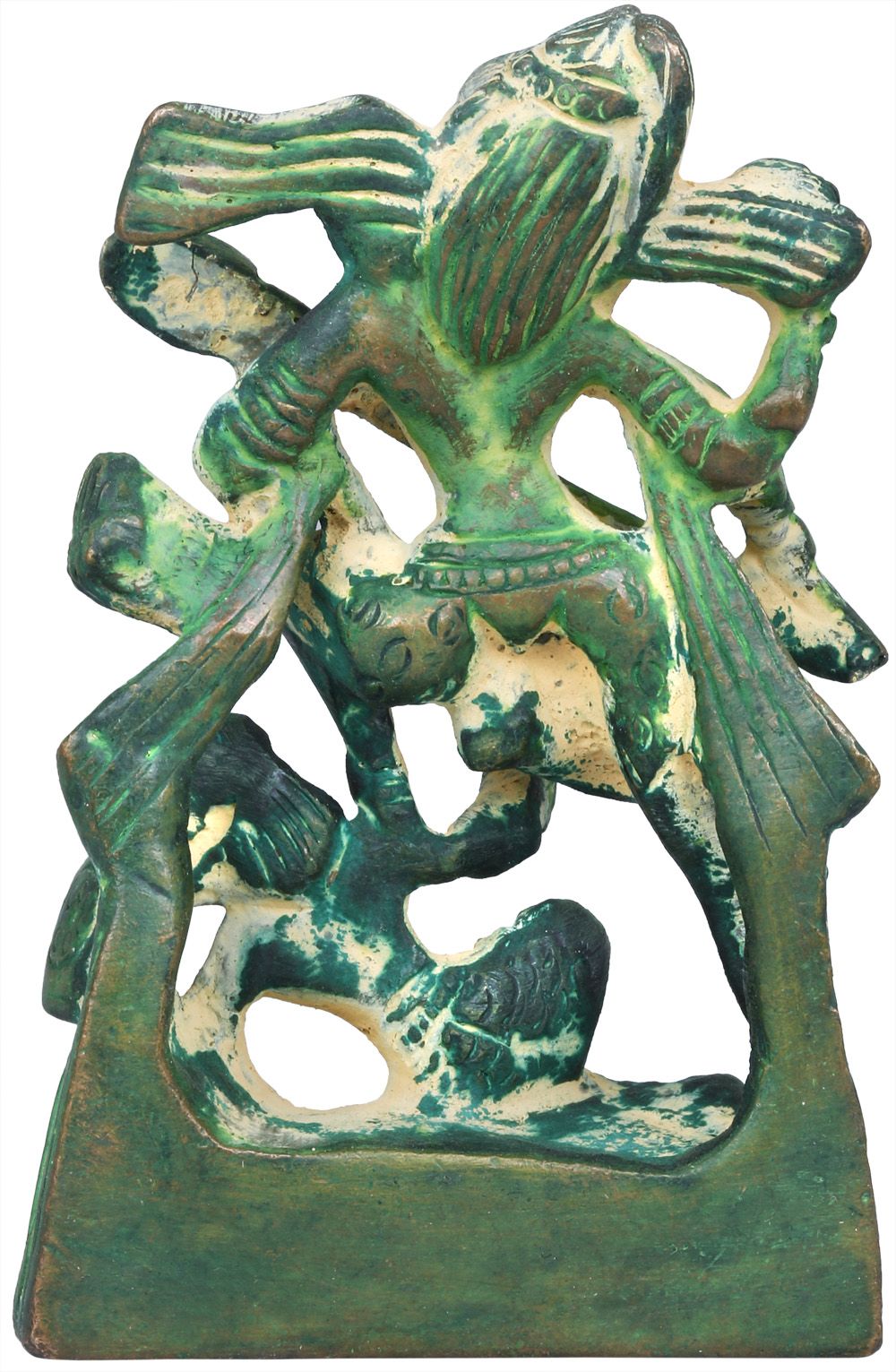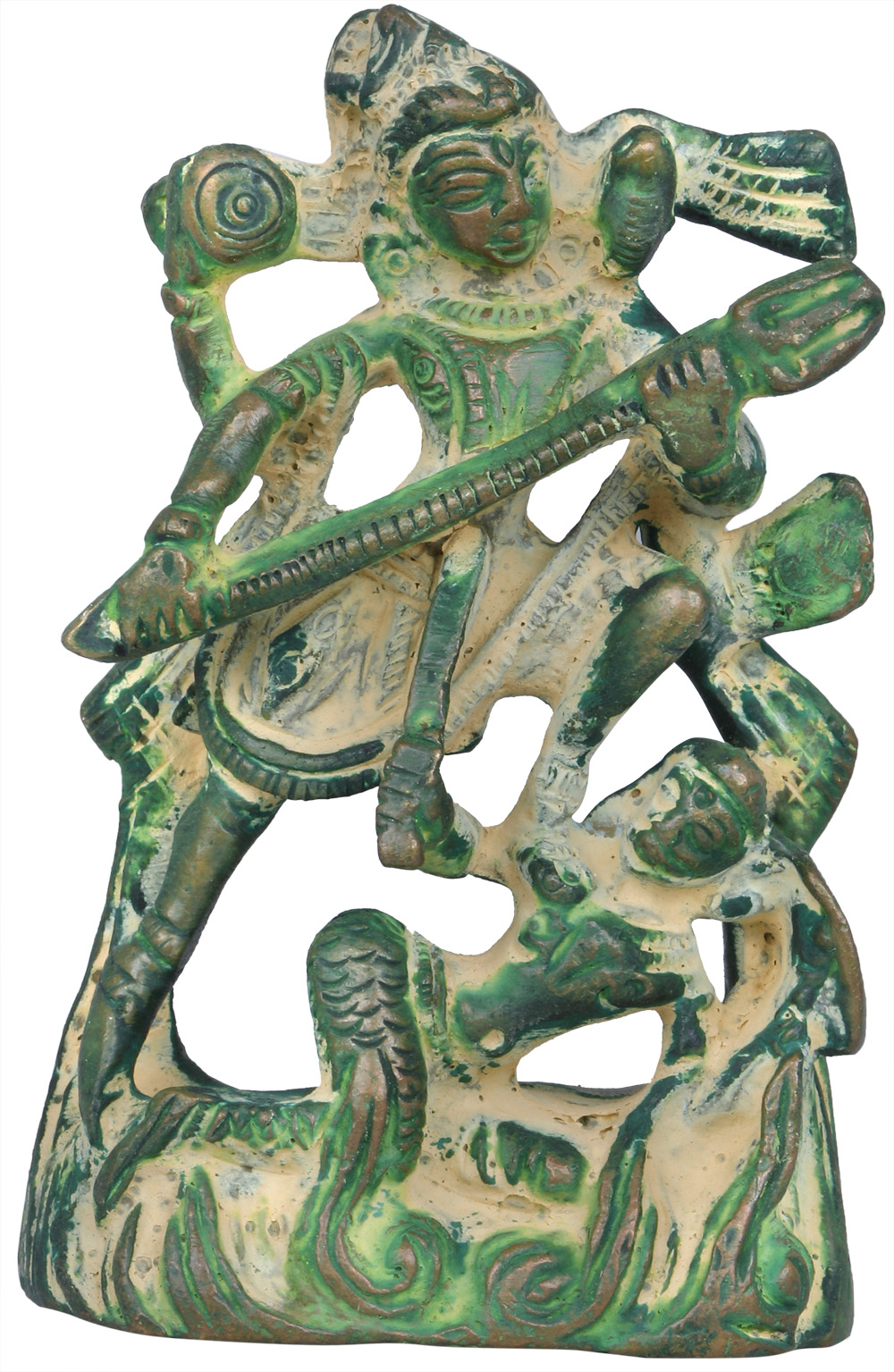 This brass image represents Shiva punishing Andhakasur for his grave sin. Shiva is shown in his Samharamurti (slaughtering the demon) form. Similar to the popular Andhakasurvadh sculpture at Ellora, this metal image shows Shiva taking a ferocious stance, holding his trident in an attacking mood, one leg placed on the chest of Andhak while the other one rests firmly on the ground. His open locks of hair are swinging in the air adding to the sense of movement in the scene. Andhakasur represents ignorance to natural facts and Shiva as the destroyer, erases all darkness that emerges out of ignorant minds.