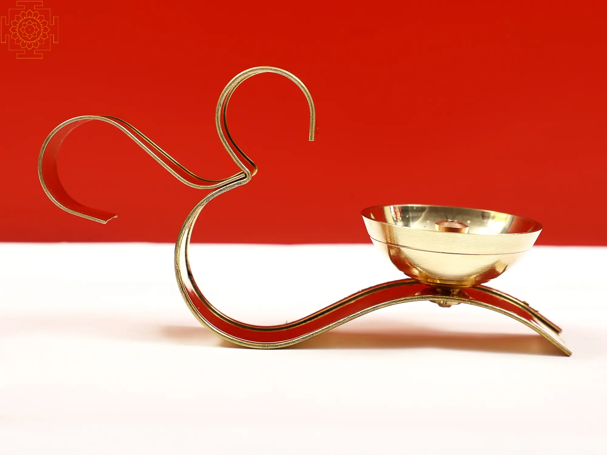 Aum, Om, Pranava, and Eka Akshara are all words found in Hindu, Buddhist, Jains, and Sikh literature. The sign has been blended with other ritual objects to improve the item's favorable impact. A handle portraying the OM (Aum) has been added to a brass diya. In Hindi, the Om sign is composed of three elements. The massive bottom curve symbolizes awake (jgrat), the higher curve represents unconsciousness (sushupti), and the middle curve represents dreaming (swapna). The handle is incredibly cleverly created by placing the diya on the bottom curve (jgrat) and using the symbol's tail as the grip.