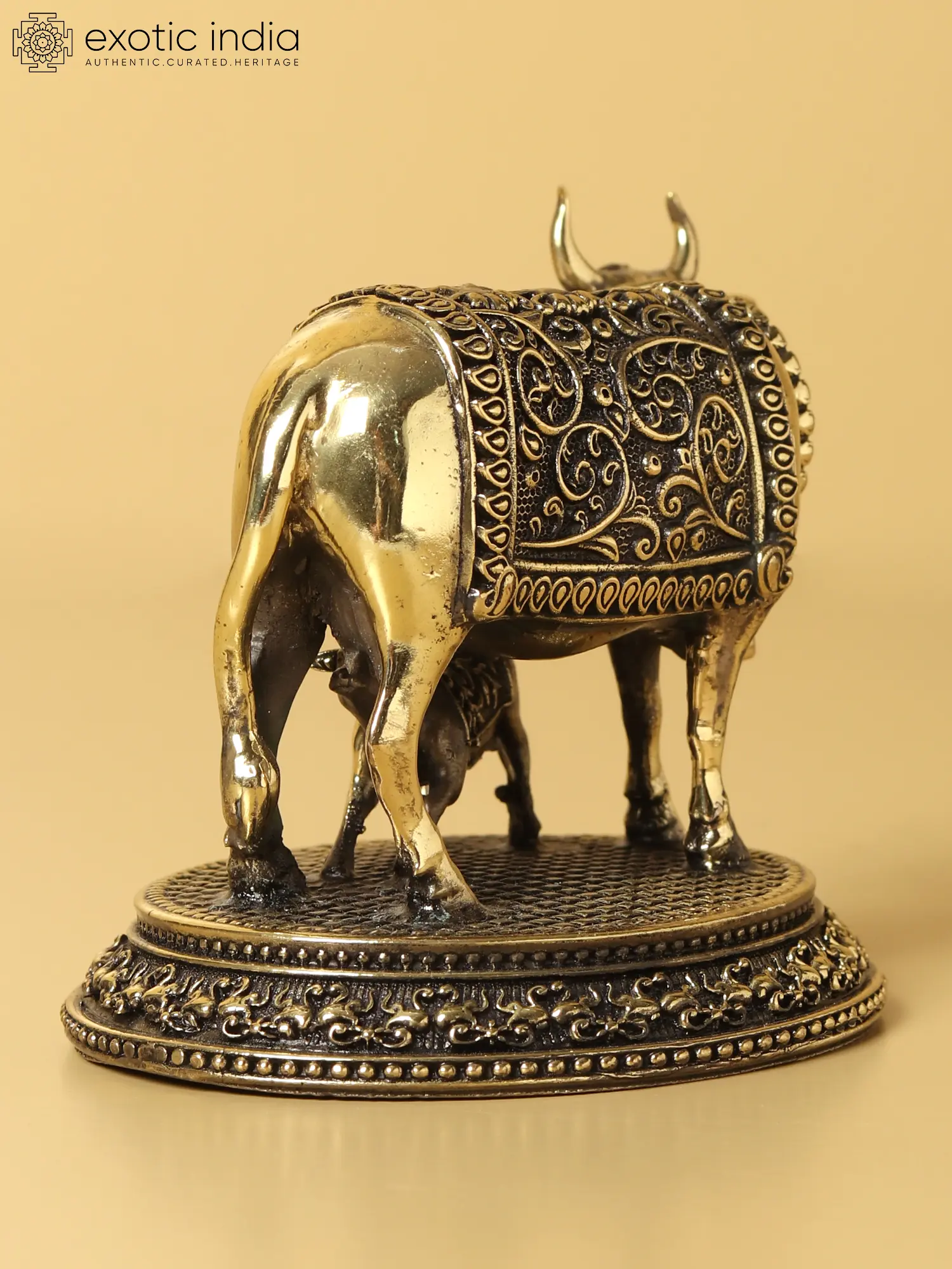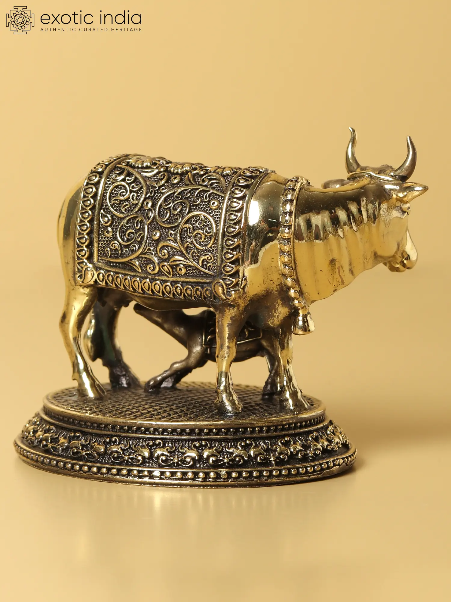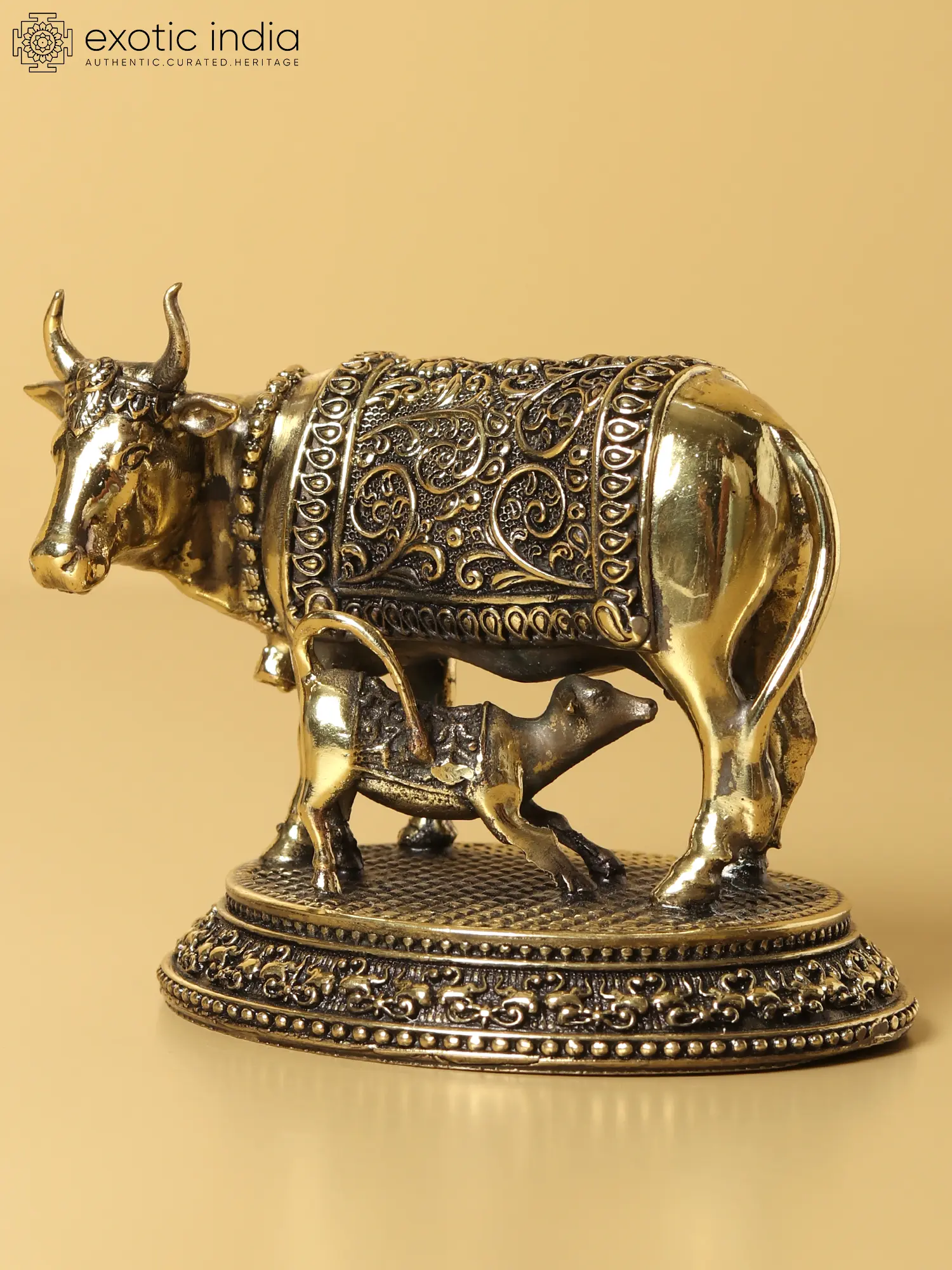 Small Brass Fine Kamdhenu Cow with Calf Figurine (Multiple Sizes)