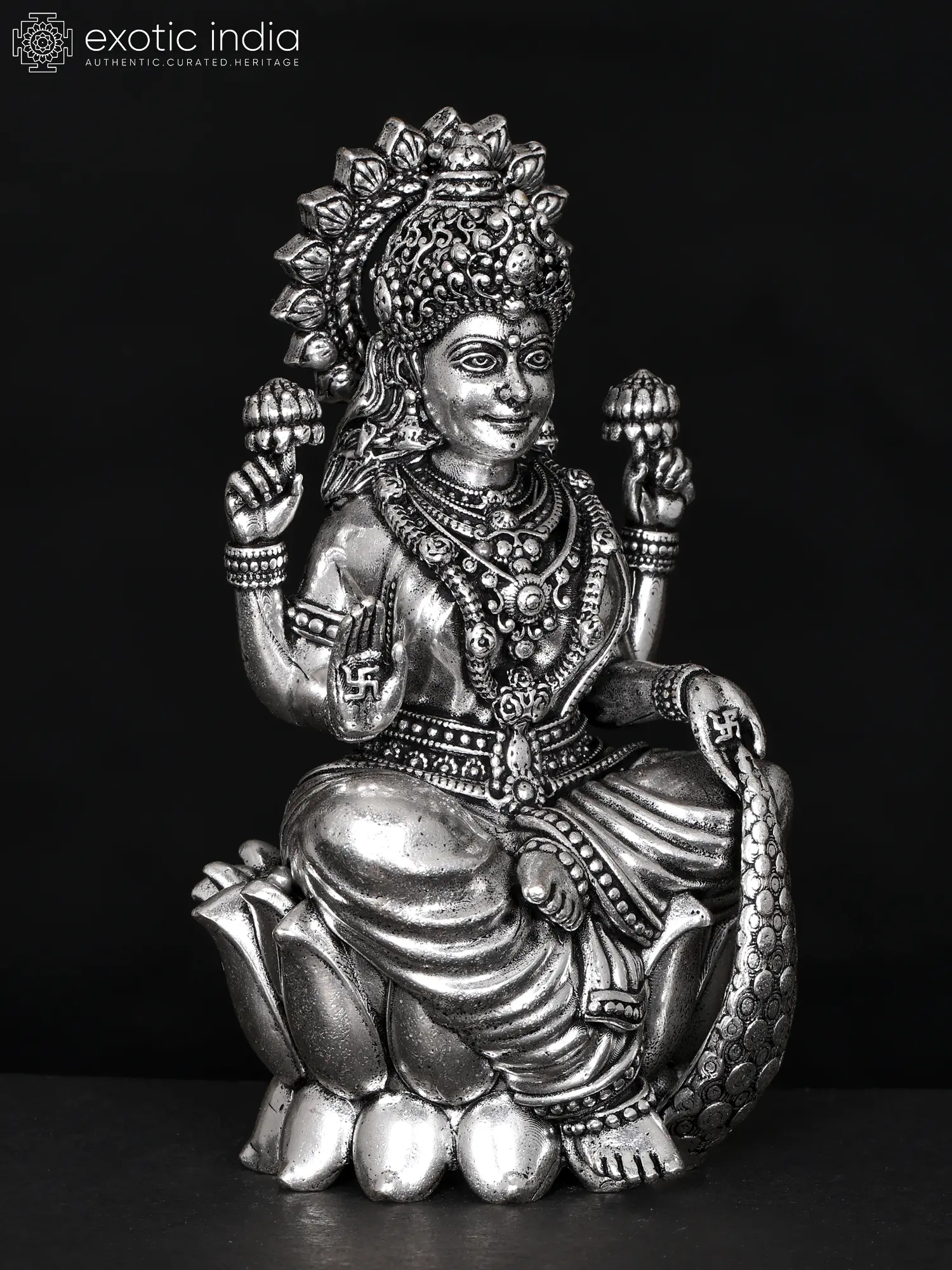 The form of goddess Lakshmi, represented in this superfine brass statue with grace atop an open lotus blossom, is known in Hindu texts as Dhana Lakshmi. In all of her manifestations, goddess Lakshmi is connected to prosperity; but, as Dhana Lakshmi, she removes all debts and guarantees her devotee will always have wealth.