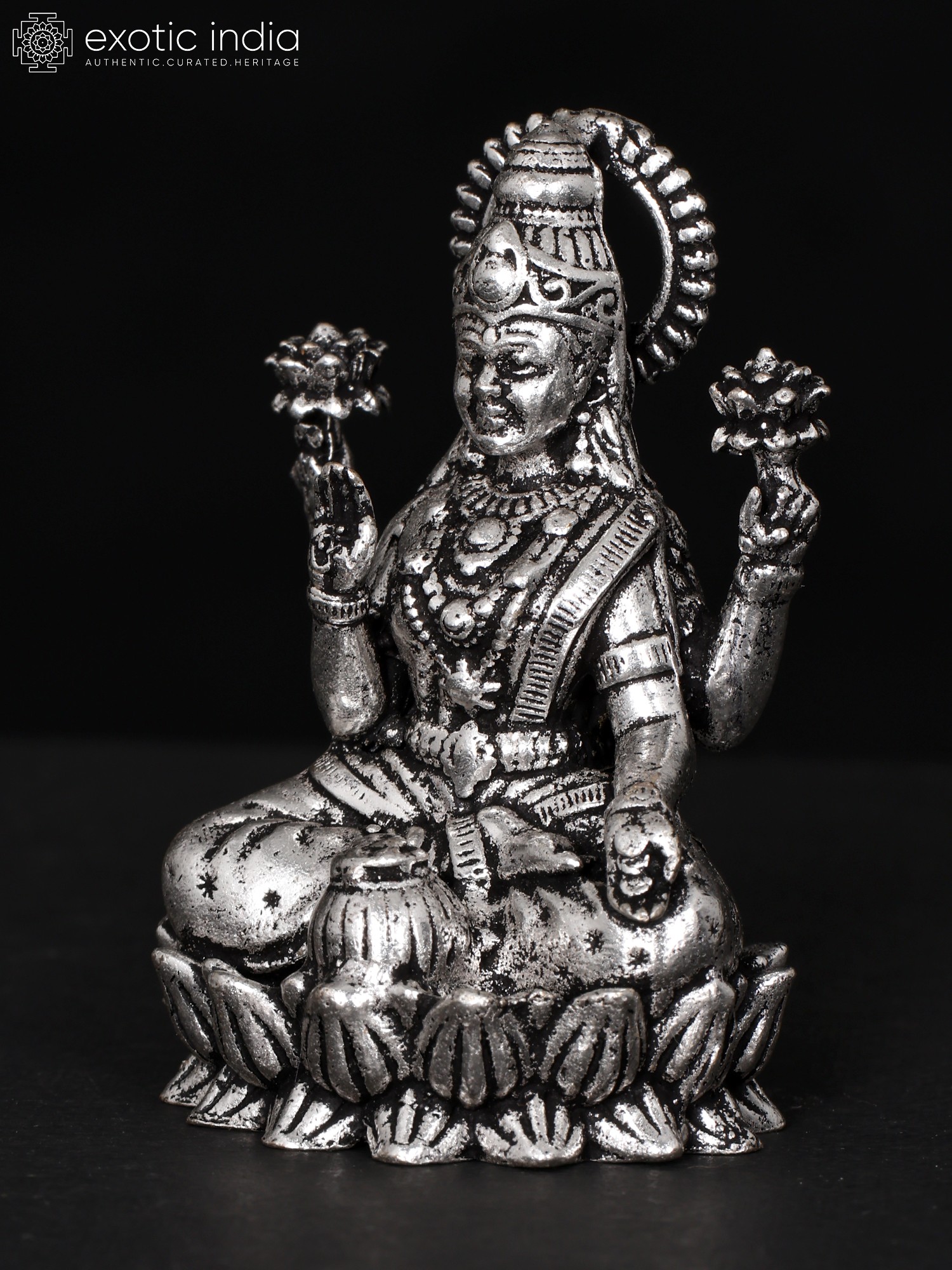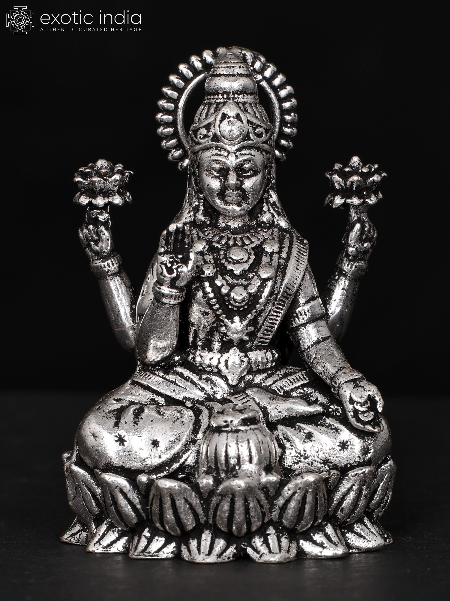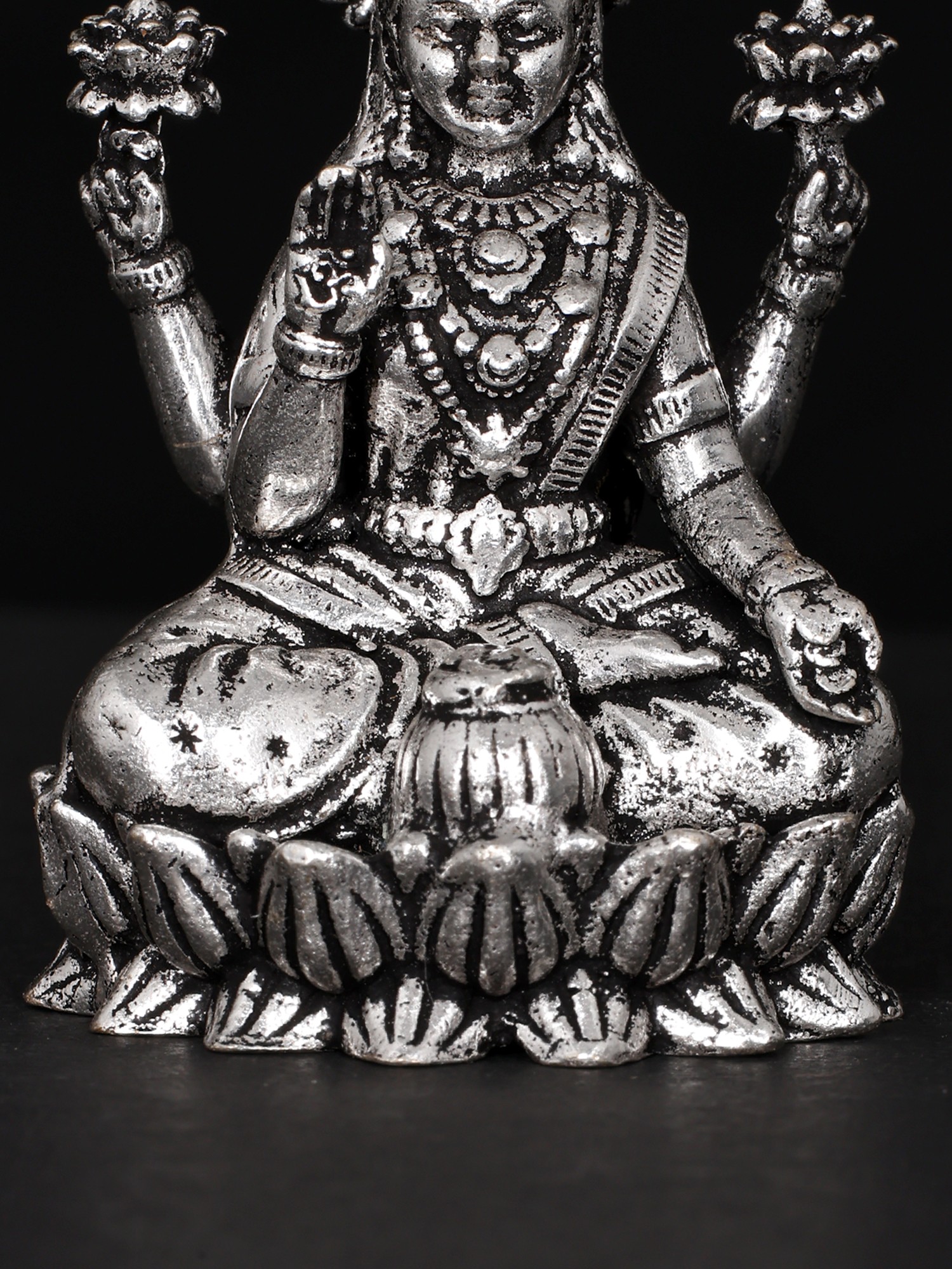 Goddess Lakshmi, a divine vision in Padmasana, radiates grace and opulence. Her upper hands cradle the lotus, symbolising purity, and transcendence, while her right hand is poised in Abhaya Mudra, signifying fearlessness and courage. Her left hand is in Varada Mudra imparts blessings. Draped in regal attire, she embodies beauty and prosperity. At her feet lies a pot of wealth, promising abundance to those who seek her blessings. This brass statue, a masterpiece of artistry, signifies the embodiment of wealth, both material and spiritual. It invites us to embrace her presence and invokes the blessings of prosperity and grace into our lives. Goddess Lakshmi, the eternal symbol of abundance, illuminates our souls.