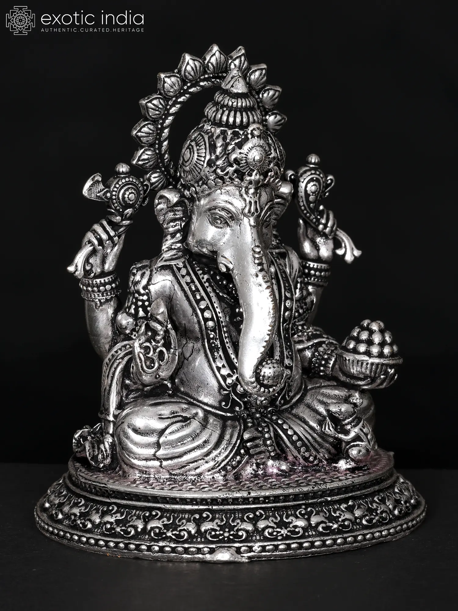 With a mesmerising aura, Lord Ganesha, also known as “Vinayaka” or “Lambodara”, assumes the Utkutakasana posture, radiating benevolence. He carries a goad and noose, tools for guiding and binding life’s intricate threads. His right hand, poised in “Abhaya Mudra”, assures protection and fearlessness. In his left hand, “a bowl of Modaks”, his favorite treats, symbolises sweet rewards for the faithful. His coiled trunk, defying gravity, gently balances another Modak, a testament to his dexterity and wisdom. A trident (Trishul) mark on his forehead signifies supreme power. Adorned in regal attire, this brass statue, serene and majestic, represents the remover of obstacles and the bestower of blessings, inviting seekers to embrace life’s intricate dance with unwavering faith and courage.