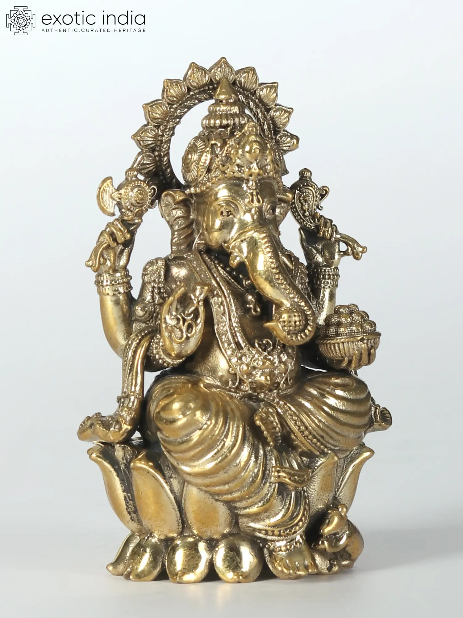 Cast in premium brass, Lord Ganesha is depicted seated in lalitasana on a lotus flower (padma), symbolising his grounding presence and spiritual growth. His four hands hold various symbolic objects, typically including a sweet modak (dumpling) for wisdom, an axe (parashu) to overcome obstacles, a lotus (padma) for spiritual abundance, and a rope (pasha) to capture negativity, accompanied by his mount (mushaka).