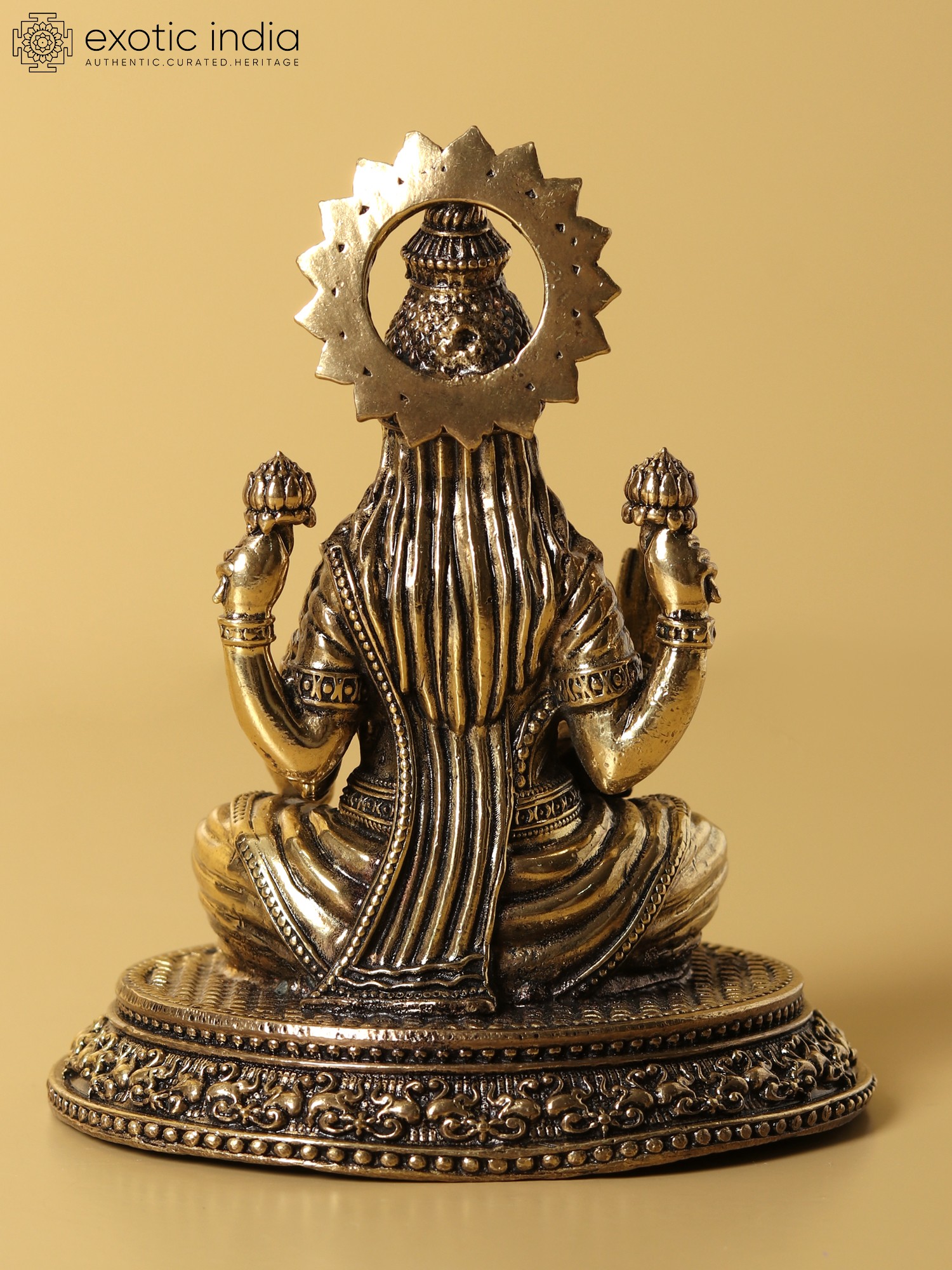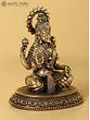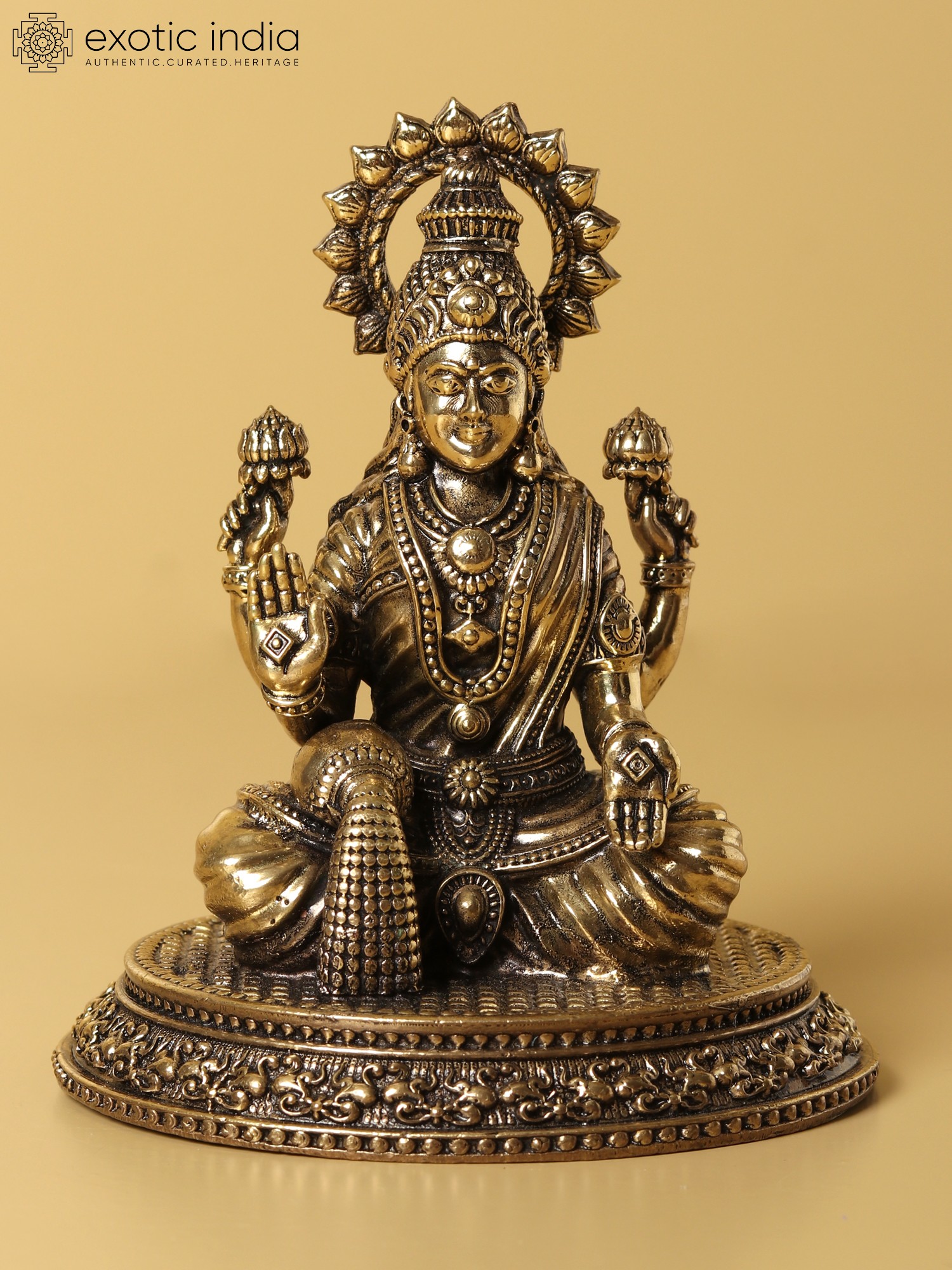 Goddess Dhana Lakshmi, the manifestation of “Mother Goddess Lakshmi”, resplendent in her divine glory, graces her ornate podium with an enchanting presence. With lotus flowers delicately cradled in her upper hands, she emanates purity, prosperity and grace. Her right hand, poised in “Ashirwad Mudra”, bestows blessings upon all who seek her favour, while her left, in “Varada Mudra”, showers the gift of abundance upon her devoted followers. Adorned in regal attire, her magnificence captivates all who lay eyes on her. She cradles the sacred pot of wealth, symbolising her boundless generosity. Crafted in brass, this statue embodies the essence of prosperity and the awe-inspiring power of Dhana Lakshmi.