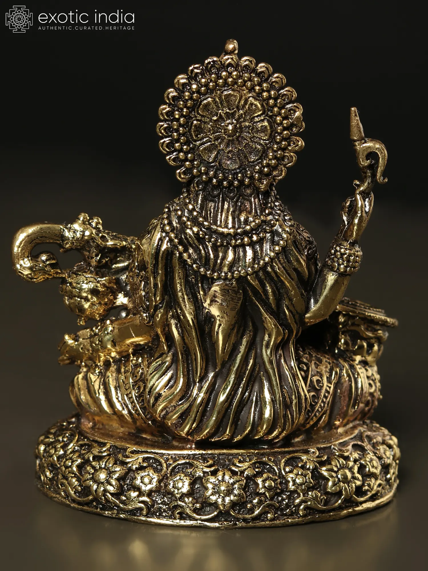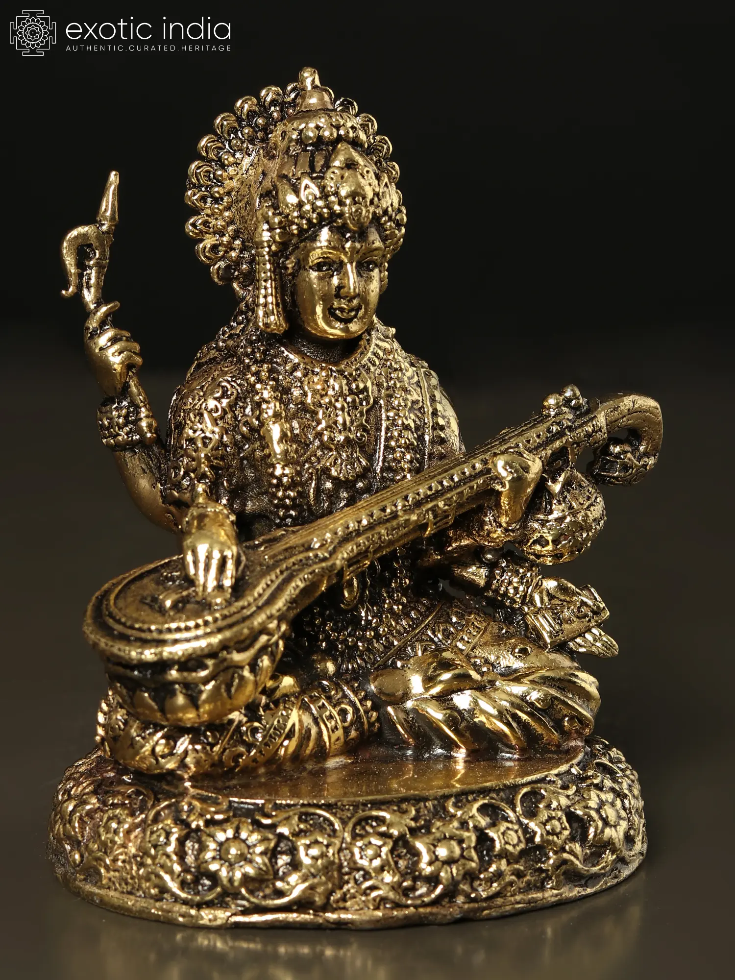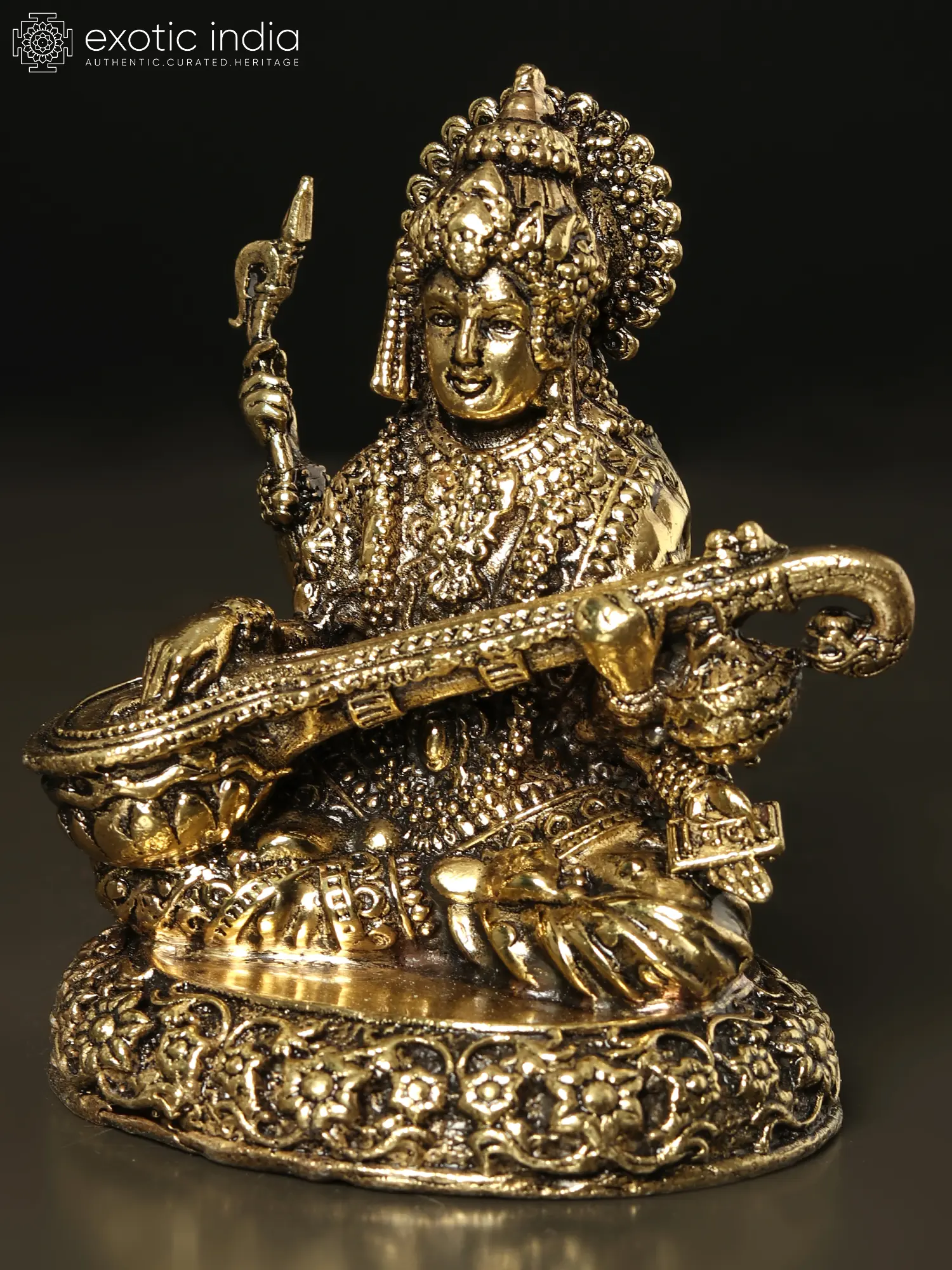 Gleaming as if dipped in pure gold, this small brass statute presents a unique form of the Hindu goddess of wisdom, Saraswati.