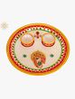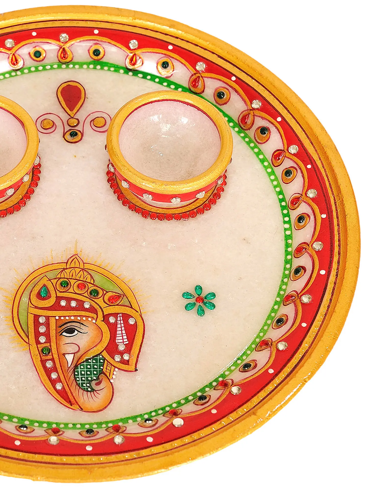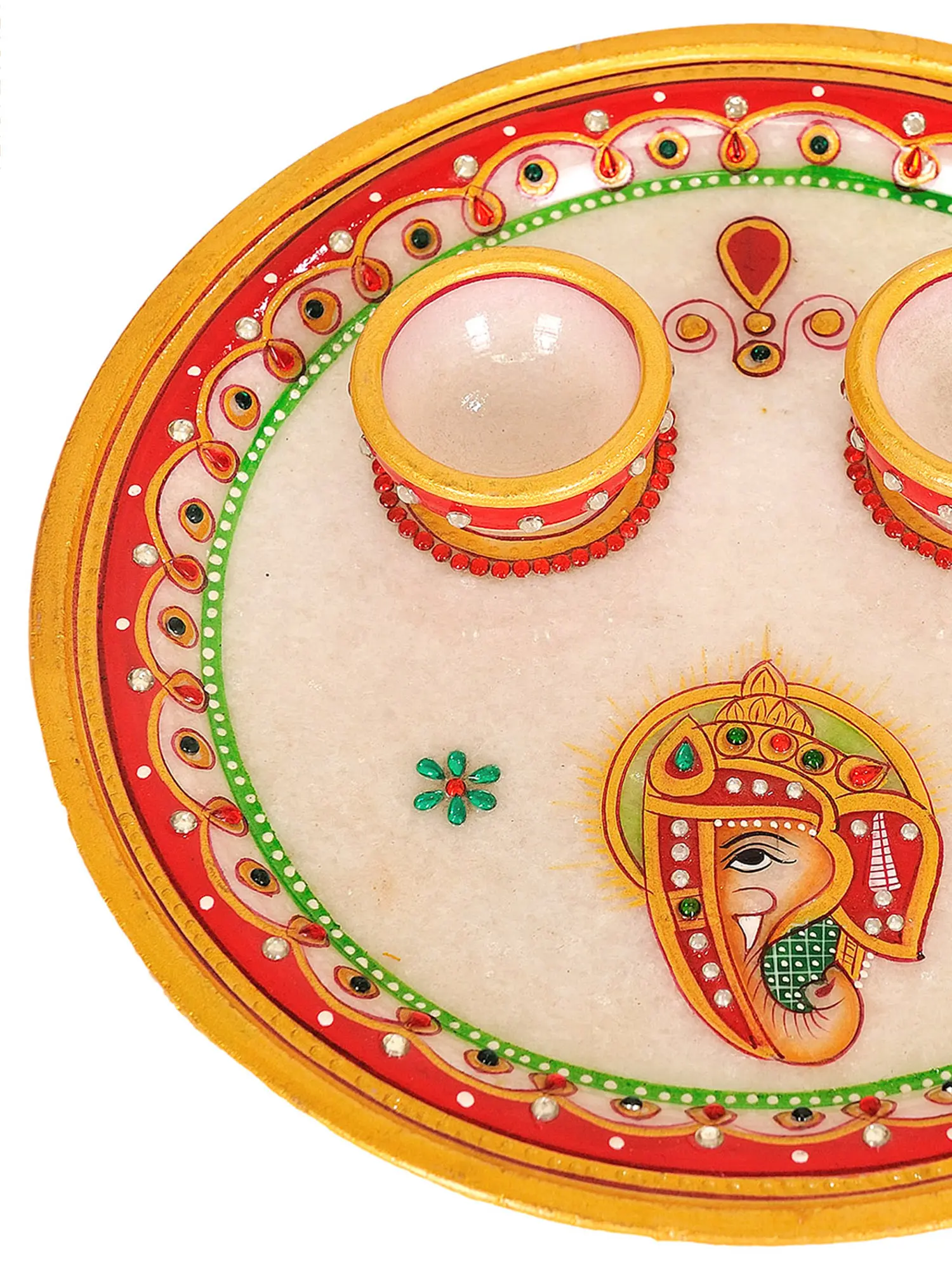 Crafted from marble, the Small Puja Thali echoes the ancient tradition of offering. Within its contours, a mosaic of symbols converges - the diya representing illumination, the incense holding prayers, the water for cleansing, and the vibrant colors invoking vibrancy. As it cradles offerings, this thali becomes an altar of gratitude, an intimate conversation with the divine. The delicate veins in marble speak to the passage of time, much like our spiritual journey. In its cool touch, we're reminded of life's transient nature, inviting us to kindle the flame of devotion, even as the world changes around us."