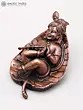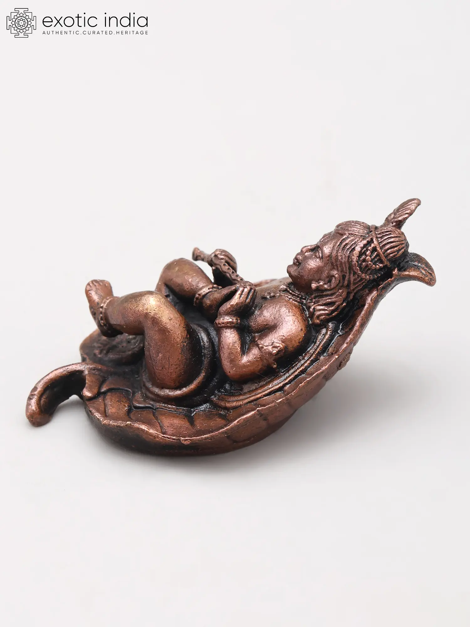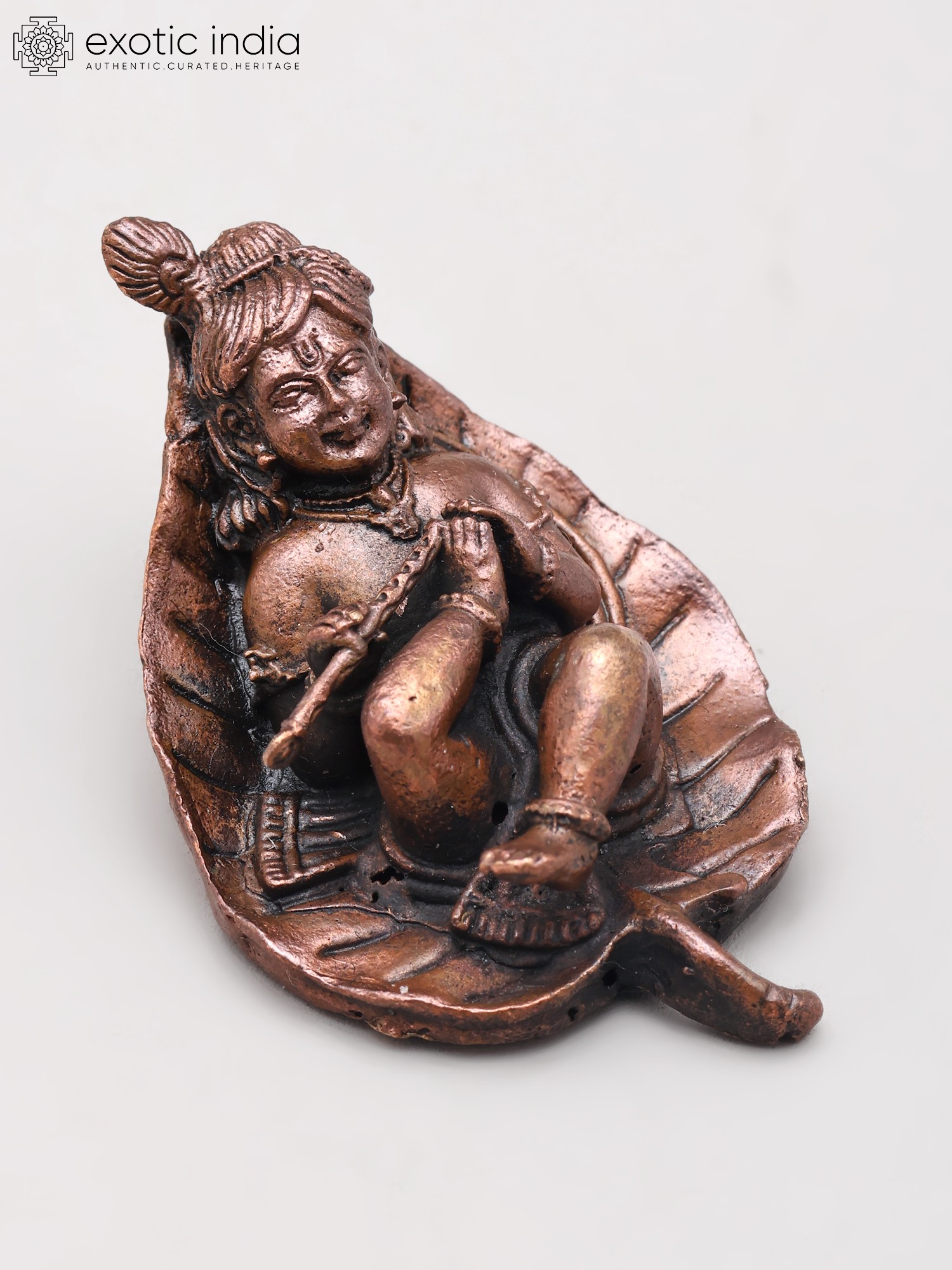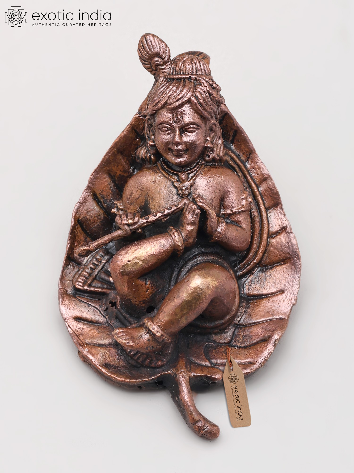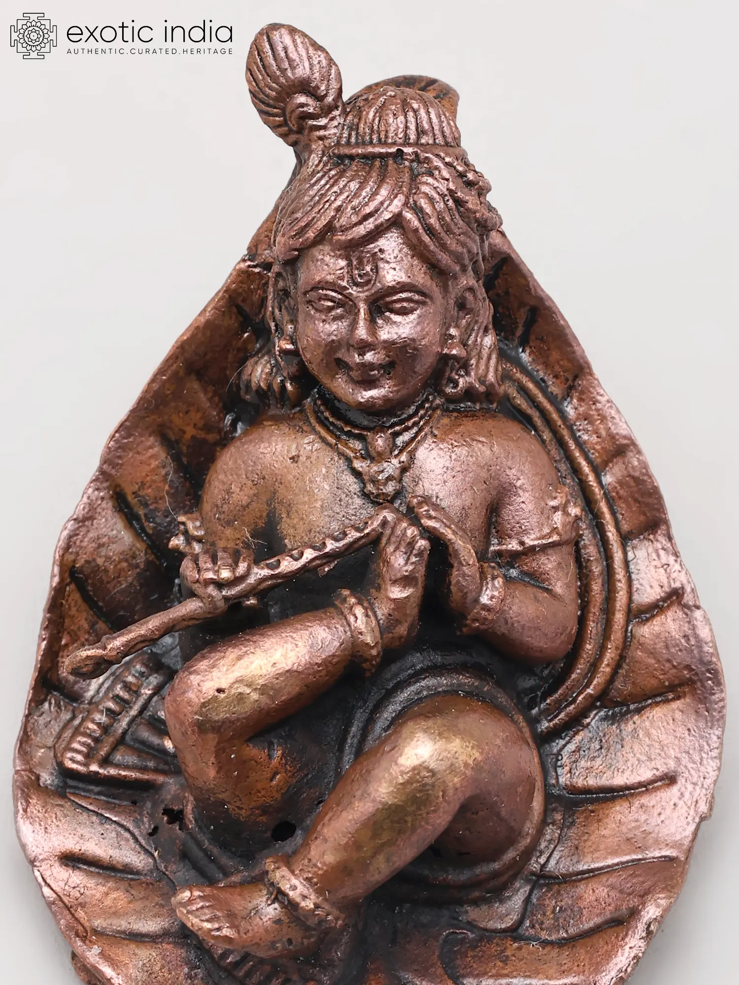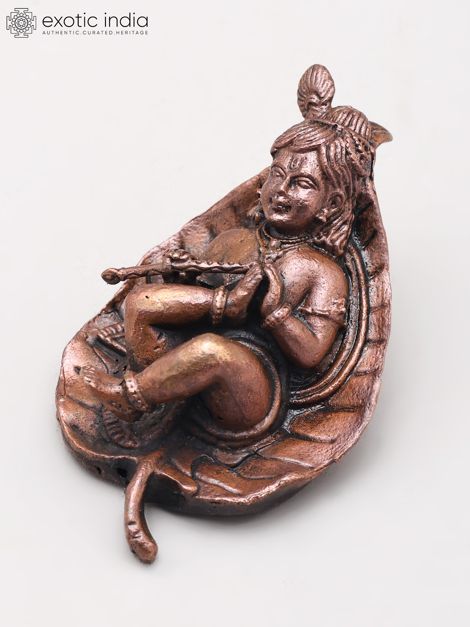 You'll appreciate the delicate rendering of the divine figure, seated gracefully upon a textured leaf that serves as both a natural perch and a symbolic element. The sculptor has masterfully captured the serene expression and the gentle posture, with the signature flute held ready to play its enchanting melody. The subtle gleam of the copper, accented by hints of brass and silver, draws the eye to the intricate jewelry and the lifelike details of the hands and feet, all within a compact, charming scale.