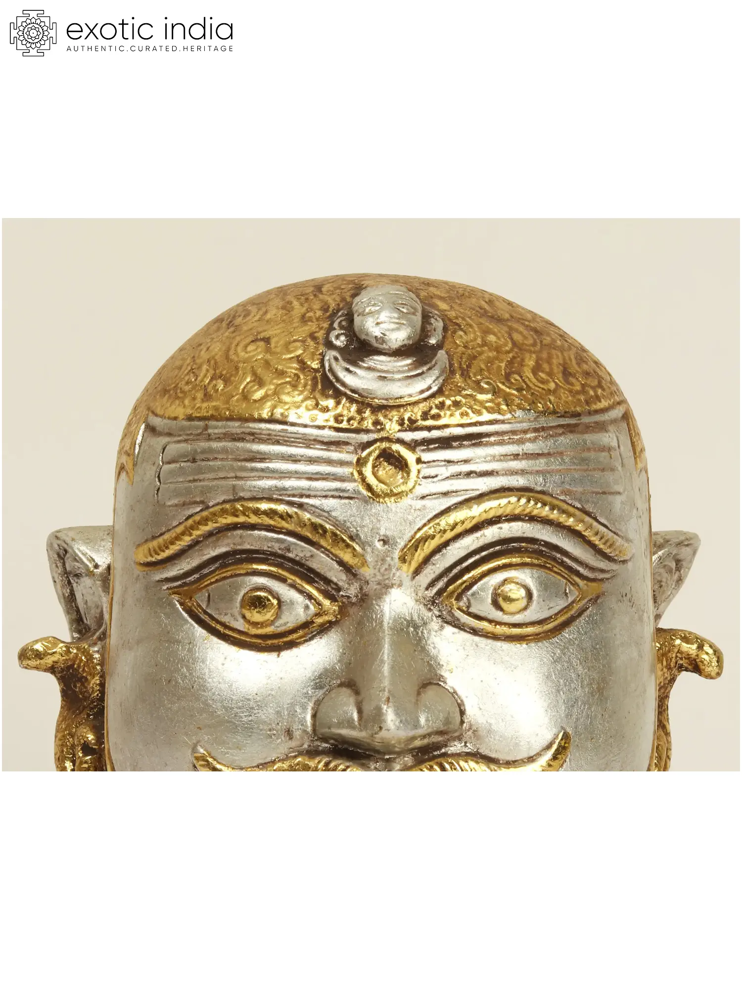This exquisite brass representation captures the multifaceted essence of Lord Shiva, one of the principal deities of Hinduism, revered as the Supreme Being. The artisan has skillfully rendered the divine face, imbuing it with a profound sense of calm and power. The metallic sheen of the brass, expertly contrasted with accents of gold, lends an aura of ancient grandeur to this piece. Each line and curve speaks of devotion and meticulous craftsmanship, a testament to the rich artistic heritage of India. The head is adorned with the characteristic third eye, a symbol of Shiva's immense wisdom and insight, capable of destroying ignorance and illusion. The flowing, textured hair, rendered in rich gold, hints at the untamed cosmic energy that Shiva embodies. Upon his forehead, a miniature representation of the crescent moon, Chandra, is visible, a celestial ornament that signifies his control over the mind and his eternal nature. The finely chiseled moustaches add a touch of regal dignity, while the prominent markings of Vibhuti, sacred ash, on the forehead and across the temples, denote his ascetic nature and his association with cremation grounds, a reminder of impermanence and detachment. From the ears, serpentine ornaments, likely representing Vasuki, the king of serpents and a cherished companion of Shiva, dangle with an artistic flourish. Serpents are deeply symbolic in Hinduism, representing cosmic energy, immortality, and the cyclical nature of creation and destruction – all themes intrinsically linked with Shiva. The layered, beaded patterns at the base of the head evoke the divine ornaments that Shiva is often depicted wearing, further enhancing the spiritual resonance of the statue. The overall impression is one of divine grace, immense power held in check by profound tranquility, a paradox that defines the very character of the Great Yogi, Mahadeva.
