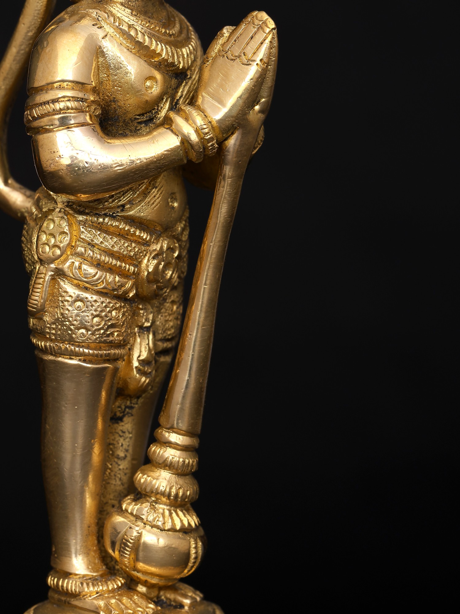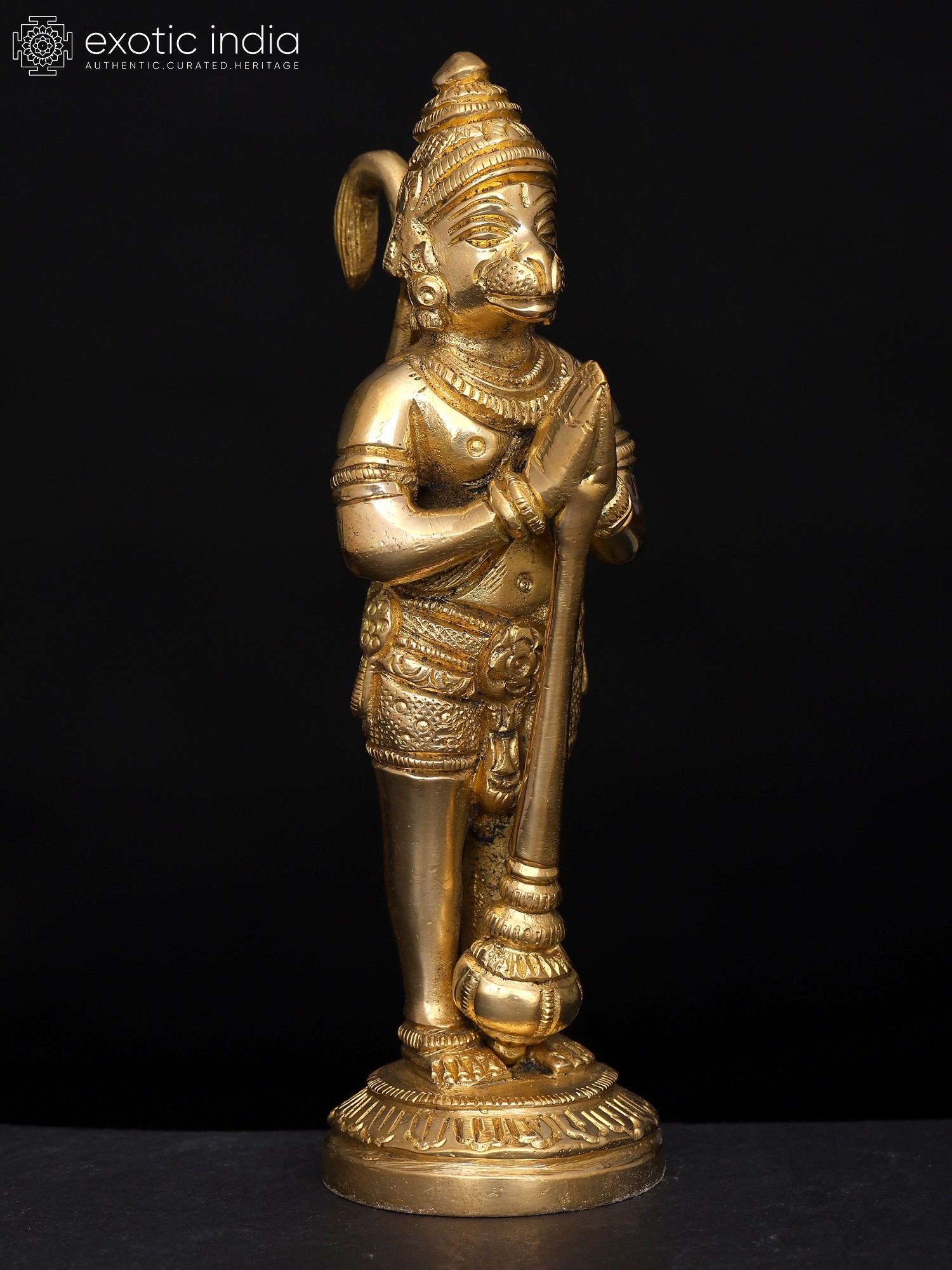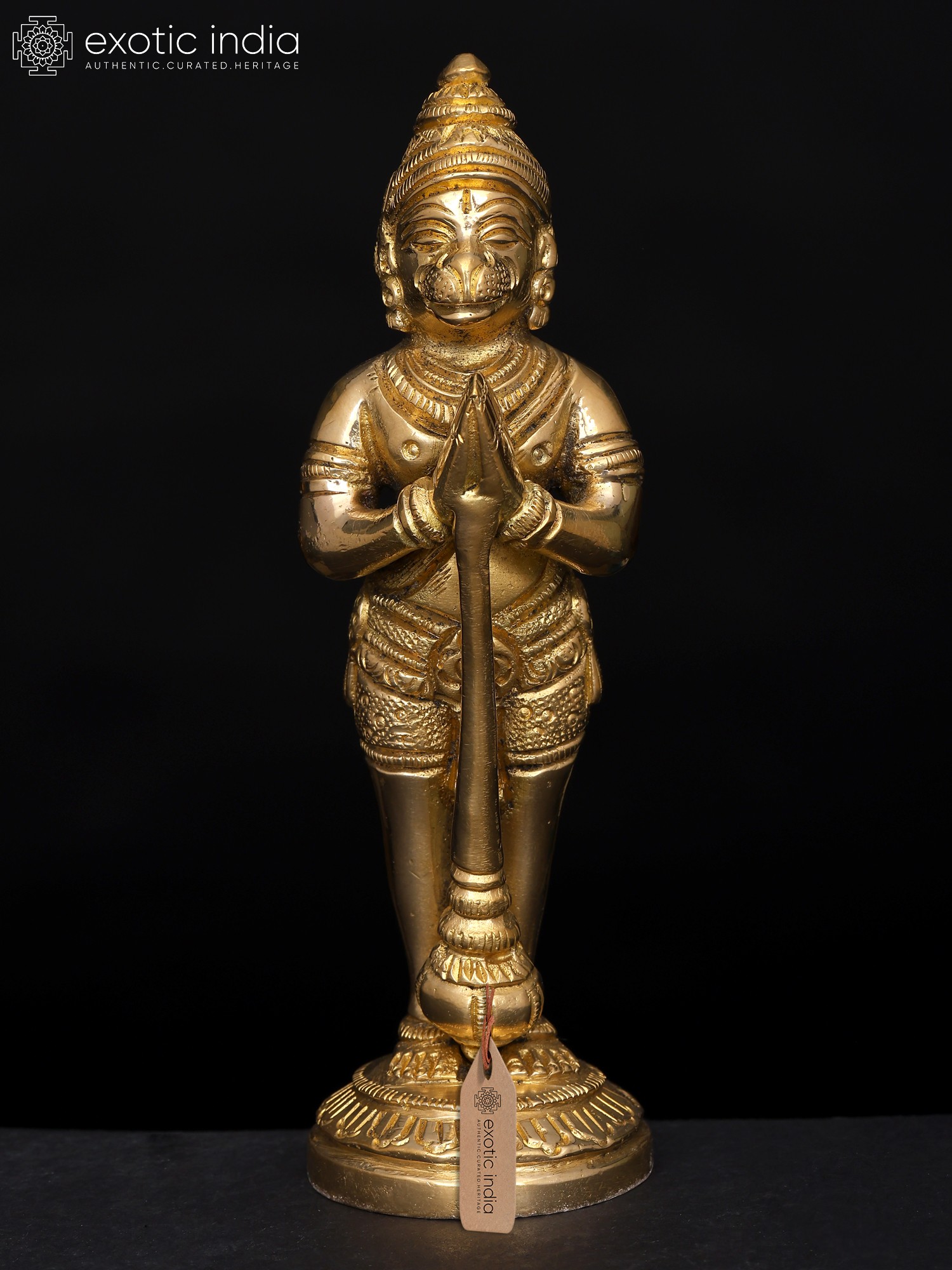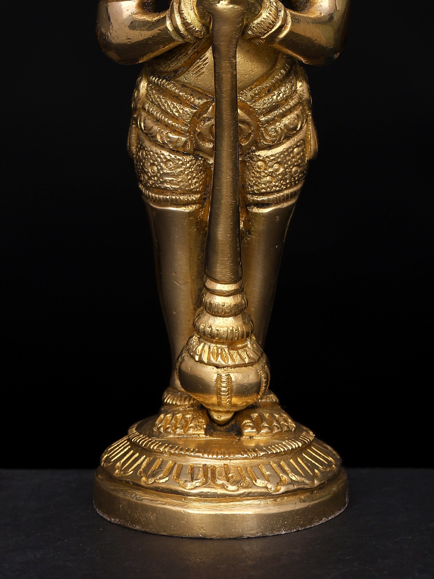 Lord Hanuman, the ardent devotee of “Lord Rama”, and the embodiment of unwavering devotion and unmatched strength, stands on a podium, radiating an aura of divinity. In his divine form, Hanuman assumes “Anjali Mudra”, a symbol of humility, respect, and deep reverence. With folded hands, He beckons the devotees to seek solace and guidance. His mighty mace, “the Gada”, rests in his grip, an emblem of valour and protection. Carved in brass, this form of Hanuman signifies the harmonious fusion of humility and might, a reminder that true strength lies not in aggression, but in using One’s power to safeguard and uplift others, a mesmerising testament to his eternal grace.