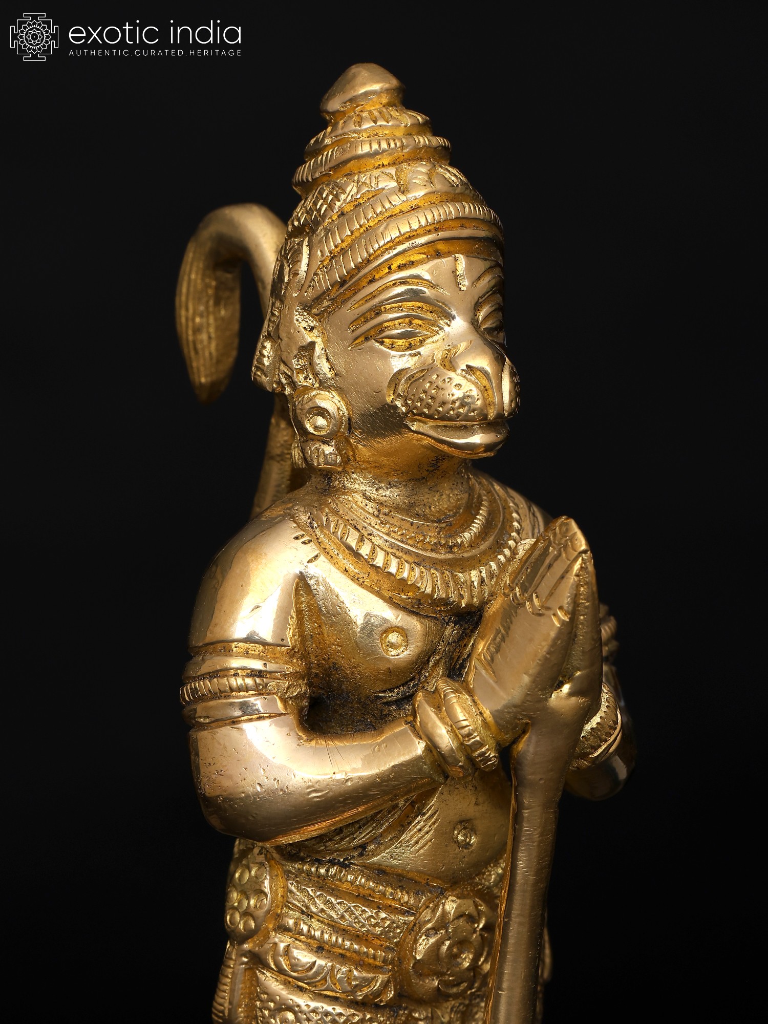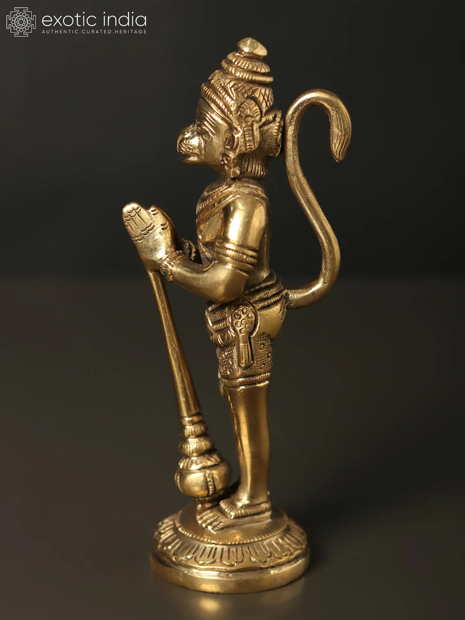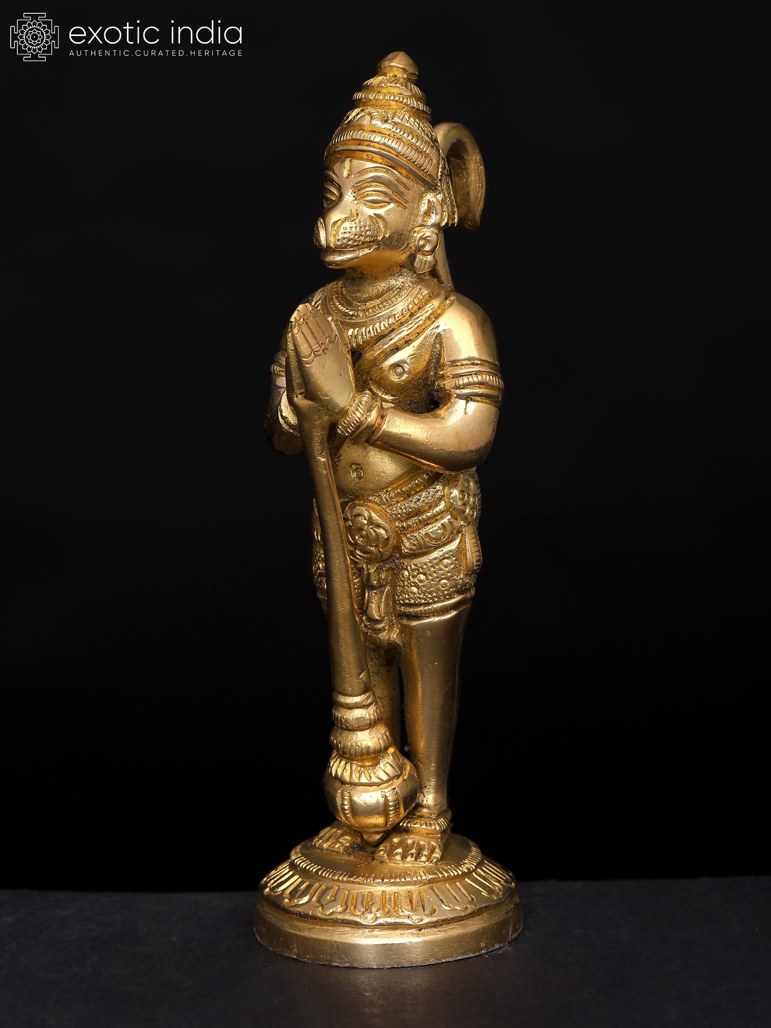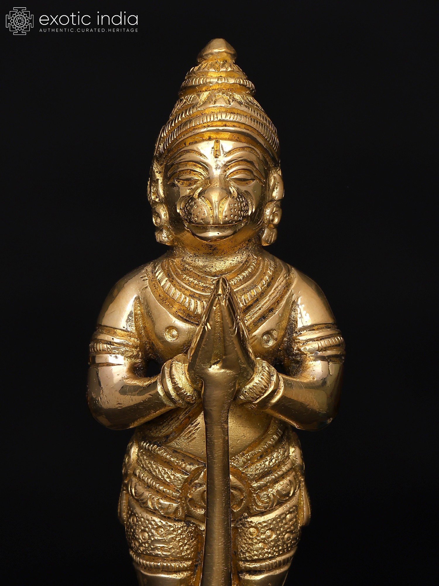 Lord Hanuman, the ardent devotee of “Lord Rama”, and the embodiment of unwavering devotion and unmatched strength, stands on a podium, radiating an aura of divinity. In his divine form, Hanuman assumes “Anjali Mudra”, a symbol of humility, respect, and deep reverence. With folded hands, He beckons the devotees to seek solace and guidance. His mighty mace, “the Gada”, rests in his grip, an emblem of valour and protection. Carved in brass, this form of Hanuman signifies the harmonious fusion of humility and might, a reminder that true strength lies not in aggression, but in using One’s power to safeguard and uplift others, a mesmerising testament to his eternal grace.