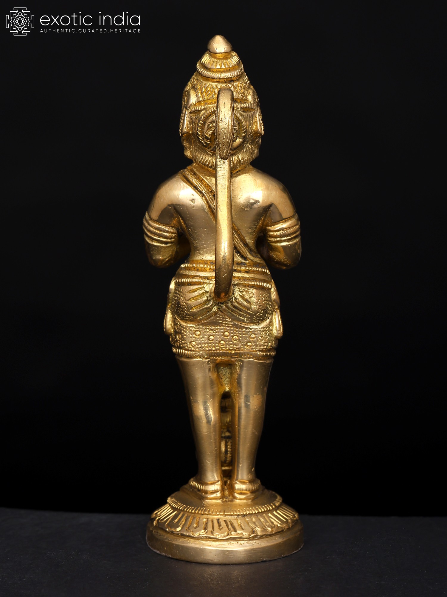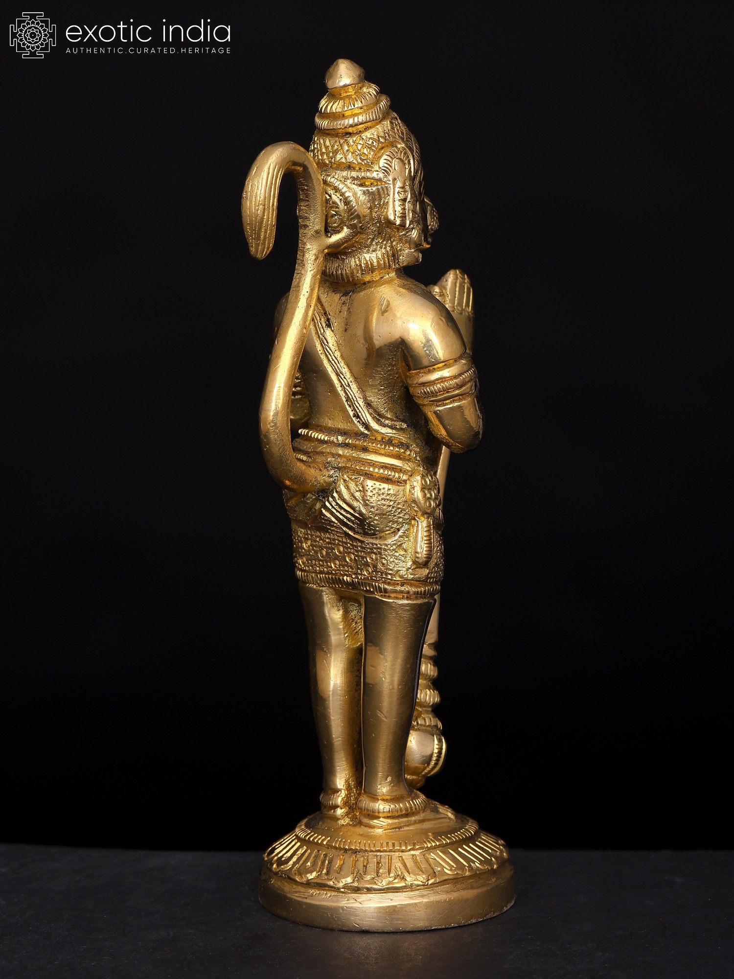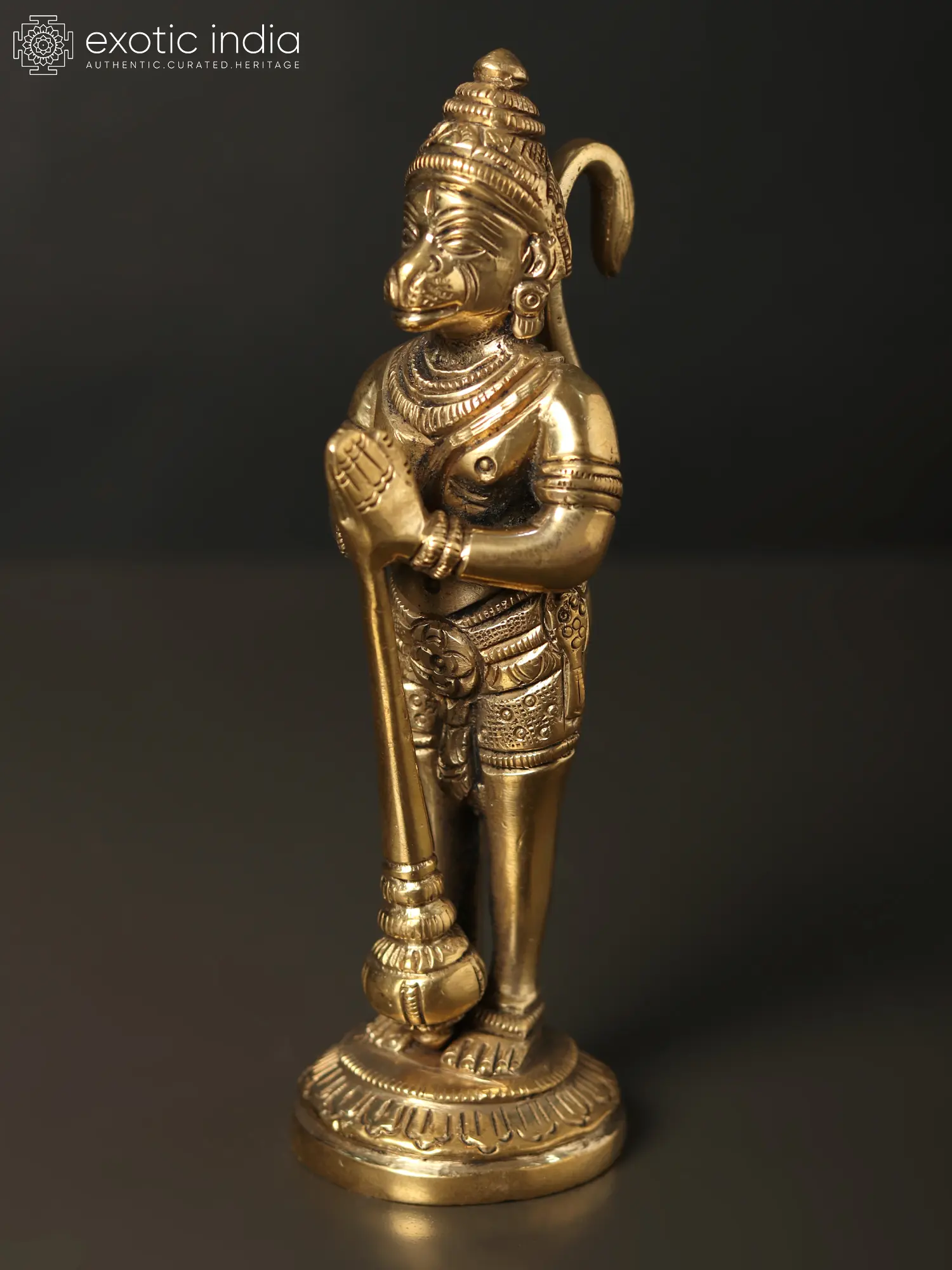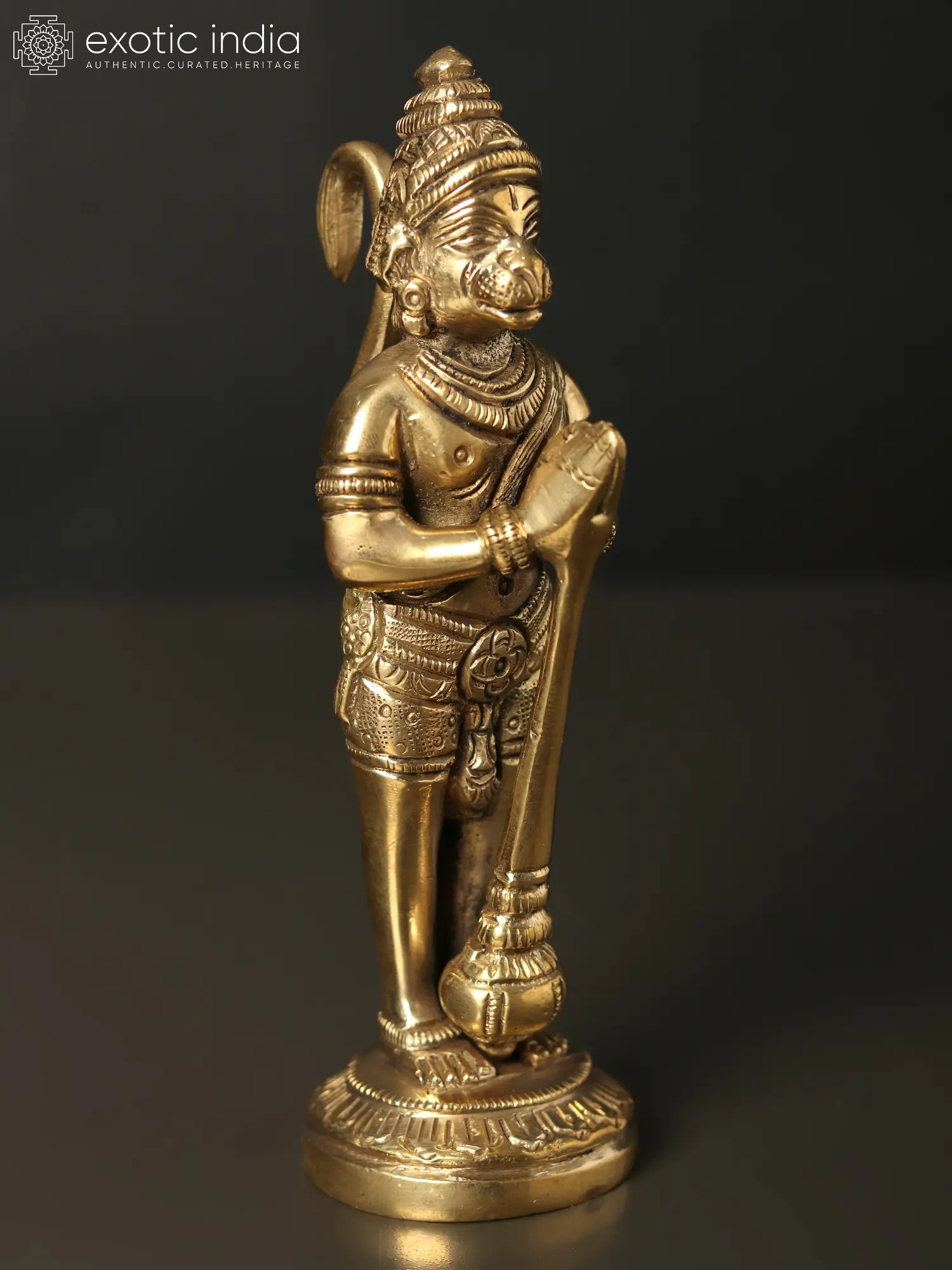 Lord Hanuman, the ardent devotee of “Lord Rama”, and the embodiment of unwavering devotion and unmatched strength, stands on a podium, radiating an aura of divinity. In his divine form, Hanuman assumes “Anjali Mudra”, a symbol of humility, respect, and deep reverence. With folded hands, He beckons the devotees to seek solace and guidance. His mighty mace, “the Gada”, rests in his grip, an emblem of valour and protection. Carved in brass, this form of Hanuman signifies the harmonious fusion of humility and might, a reminder that true strength lies not in aggression, but in using One’s power to safeguard and uplift others, a mesmerising testament to his eternal grace.