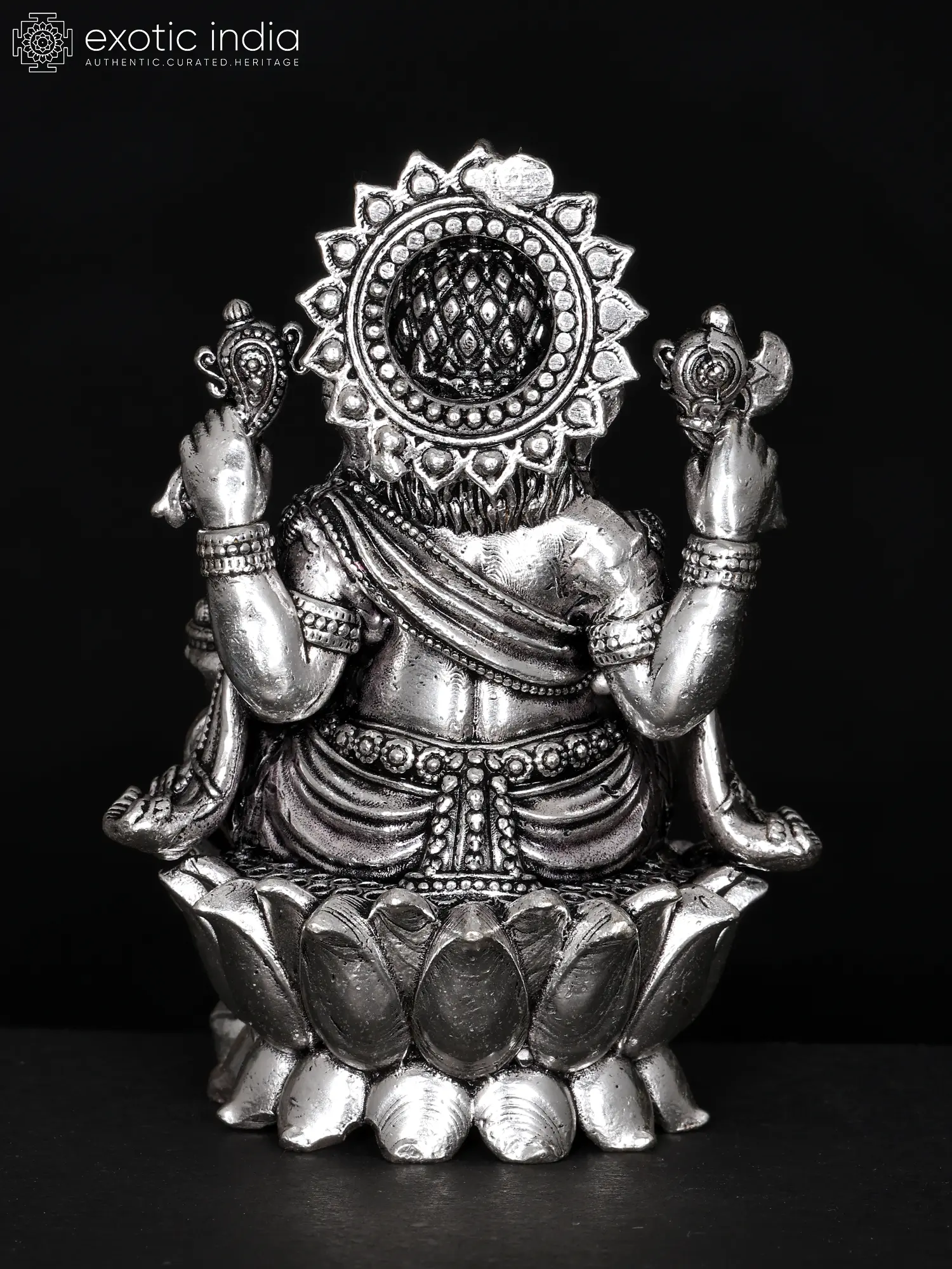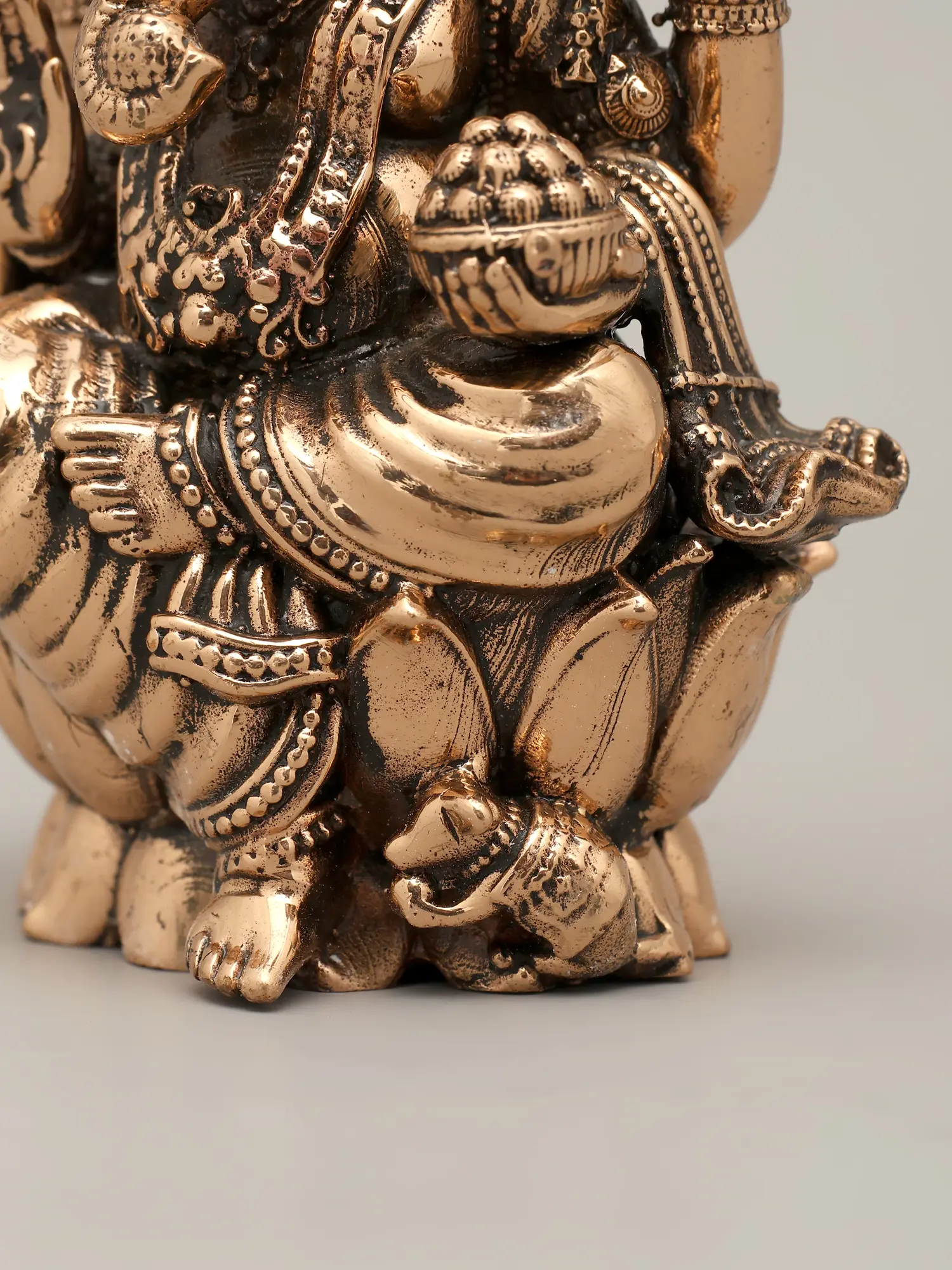 A perfect idol for your Puja temple, this superfine brass icon is dedicated to Chaturbhuja Ganesha, the Lord of auspiciousness.