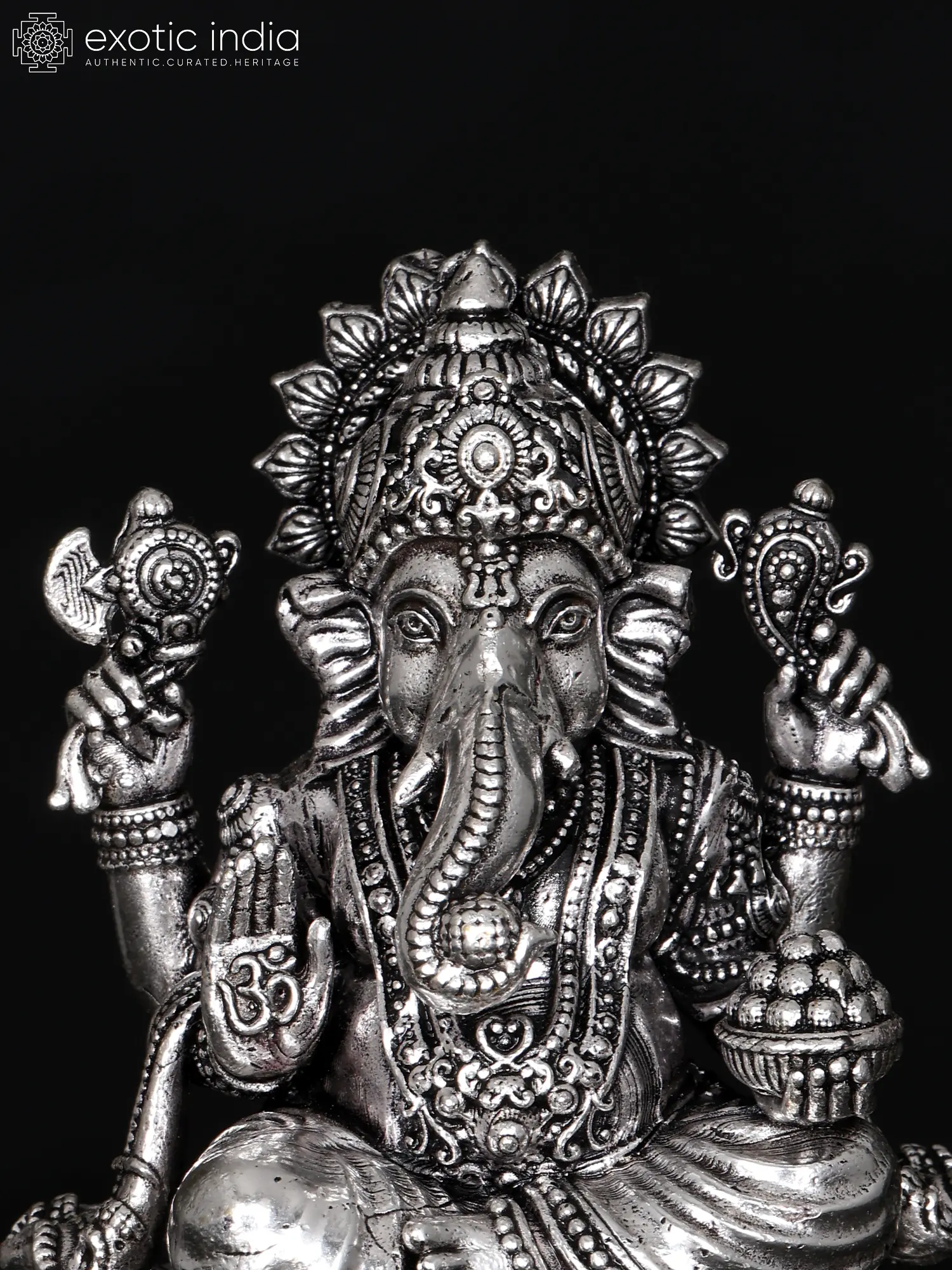 With a serene expression on his animated face, Ganesha holds Modak, goad, noose, one tusk, and the gesture of Abhaya, revealing “Om”, the primordial sound and the origin of the Universe on his palm.