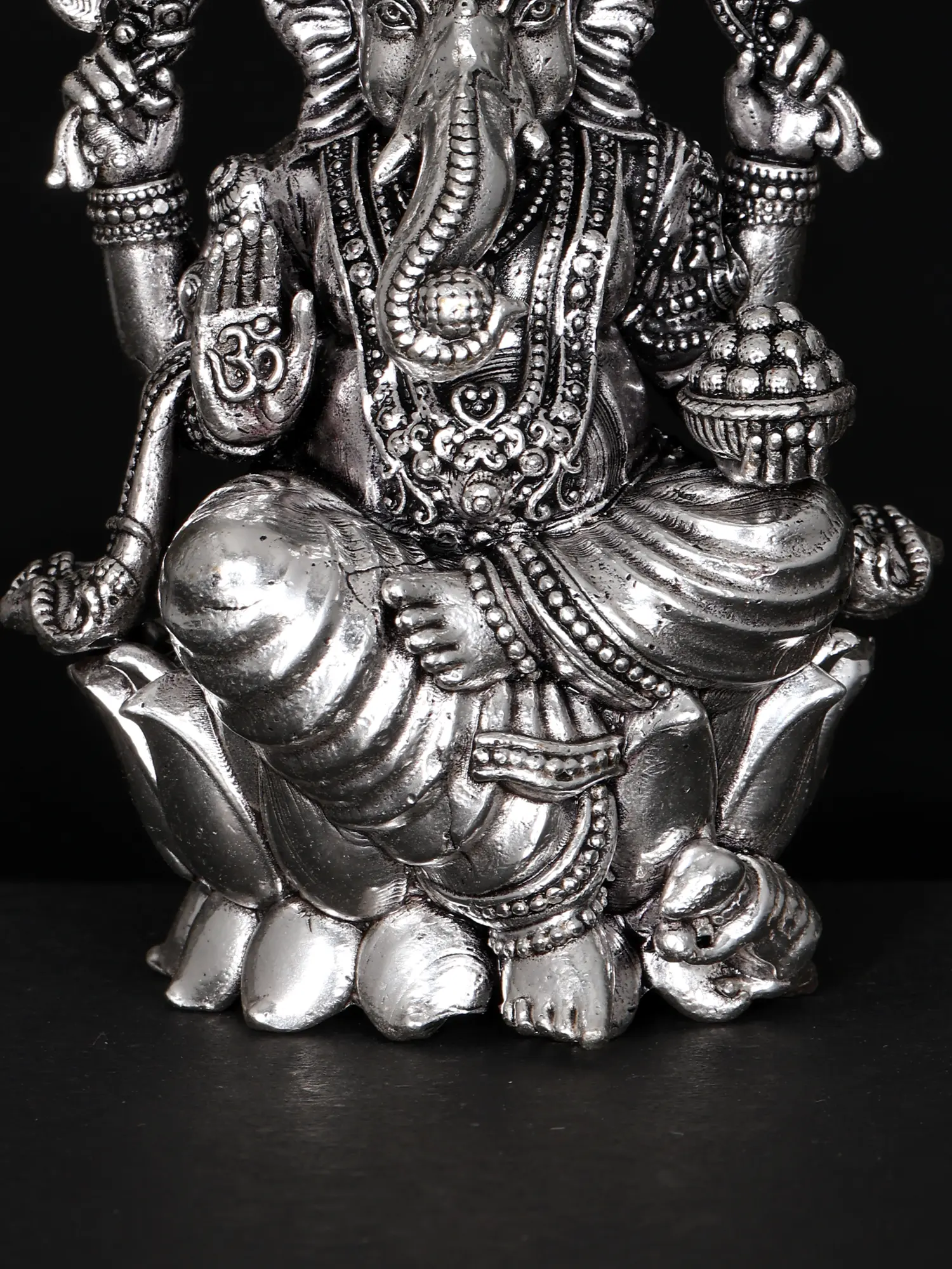 A beautifully delineated lotus is the throne of Ganesha, who is adorned with an exquisite crown, the mark of Trishula (a symbol of Shiva and Parvati, his divine parents), intricate ornaments, and dhoti.