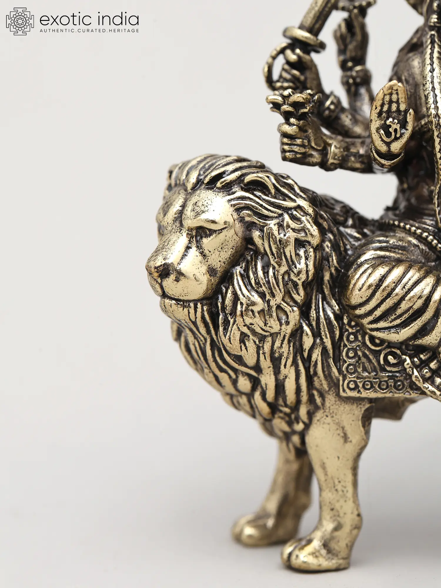 This ornate brass Durga statue, depicts Devi in her warrior’s form, in her Ashtabhuja or eight-armed roopa. She is adorned by a lovely saree and exquisite ornaments which are delineated with a mesmerizing detail. Sitting on the back of a Solomon and tranquil lion, Devi Durga smiles blissfully, filling the aura with her celestial presence.