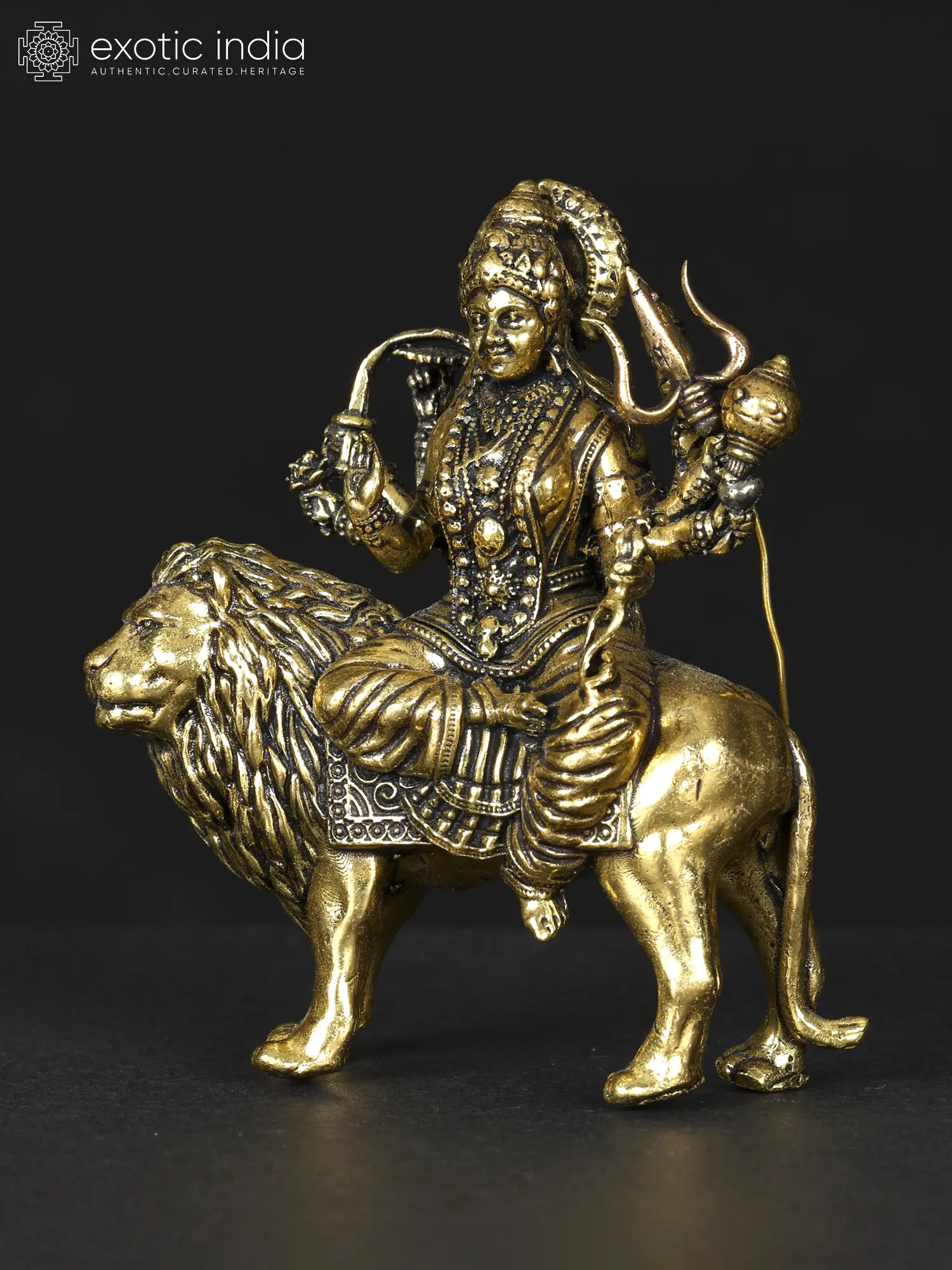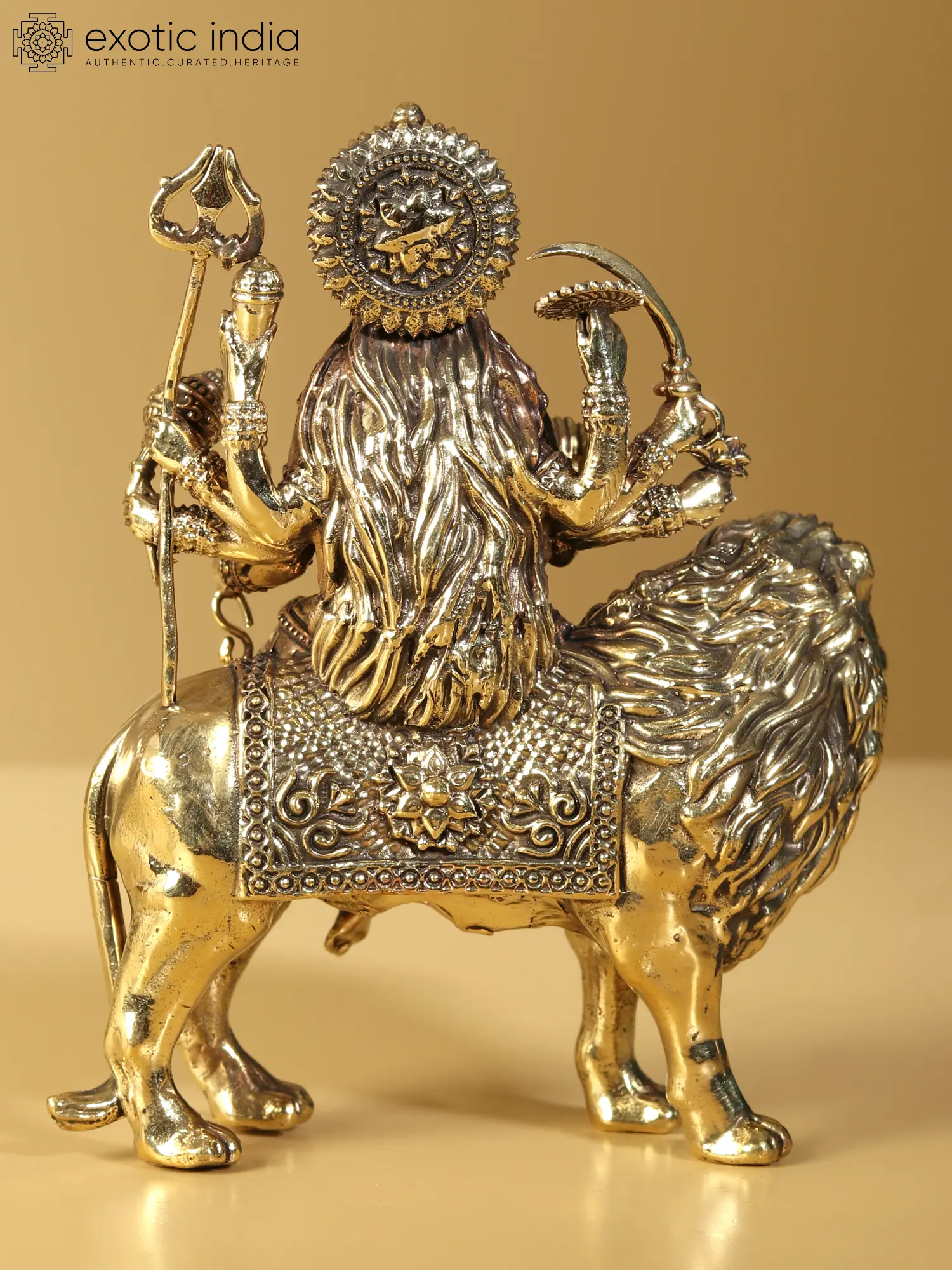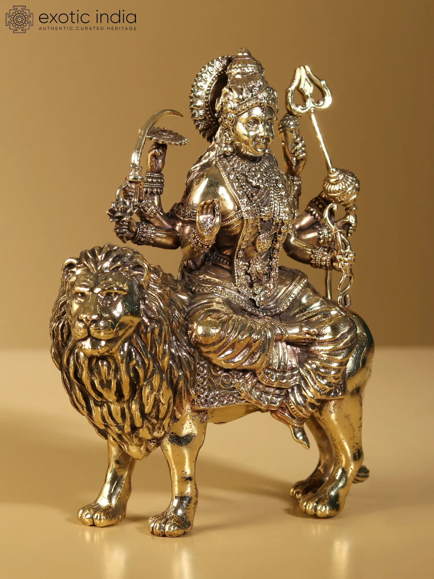 This ornate brass Durga statue, depicts Devi in her warrior’s form, in her Ashtabhuja or eight-armed roopa. She is adorned by a lovely saree and exquisite ornaments which are delineated with a mesmerizing detail. Sitting on the back of a Solomon and tranquil lion, Devi Durga smiles blissfully, filling the aura with her celestial presence.