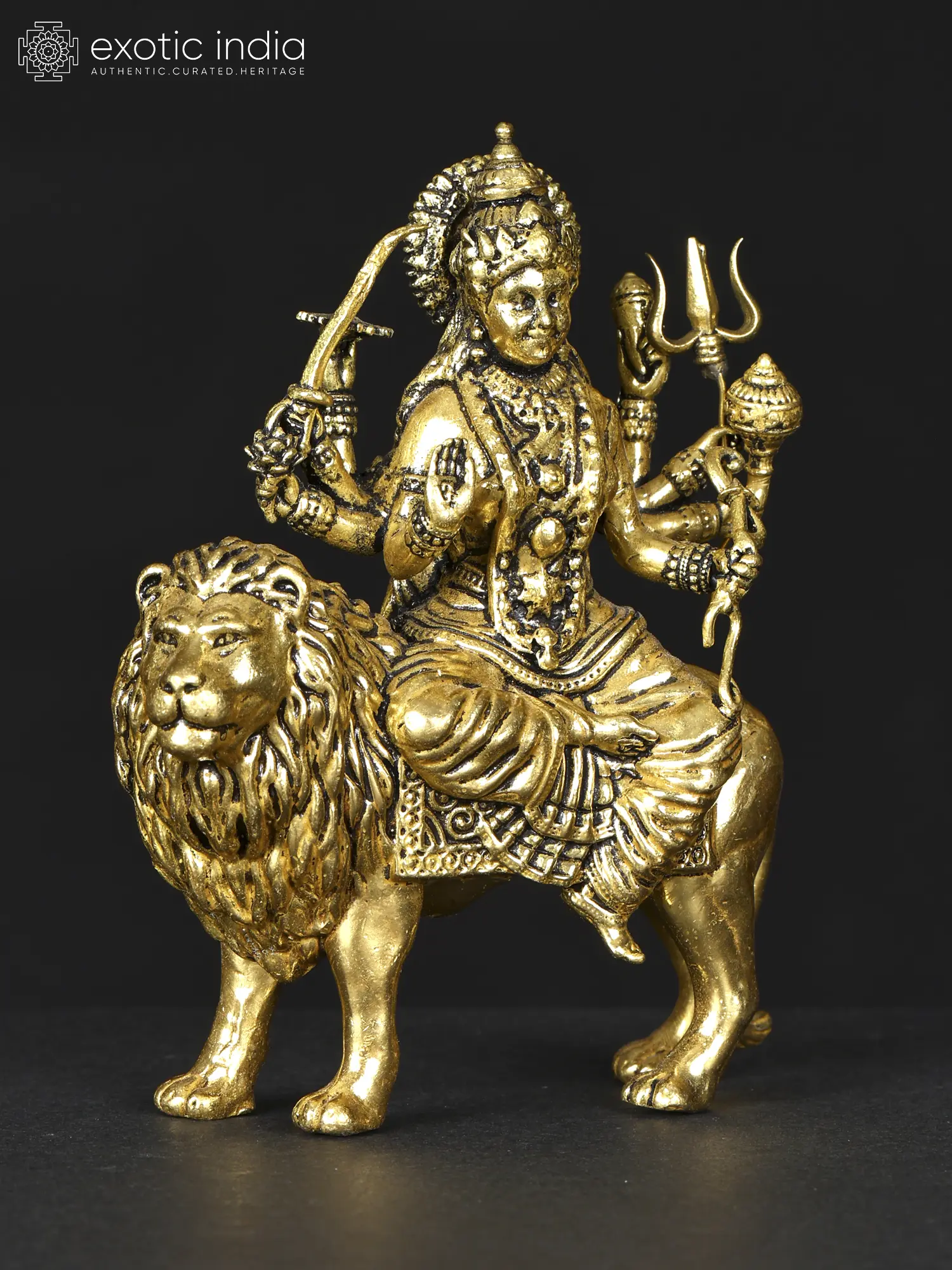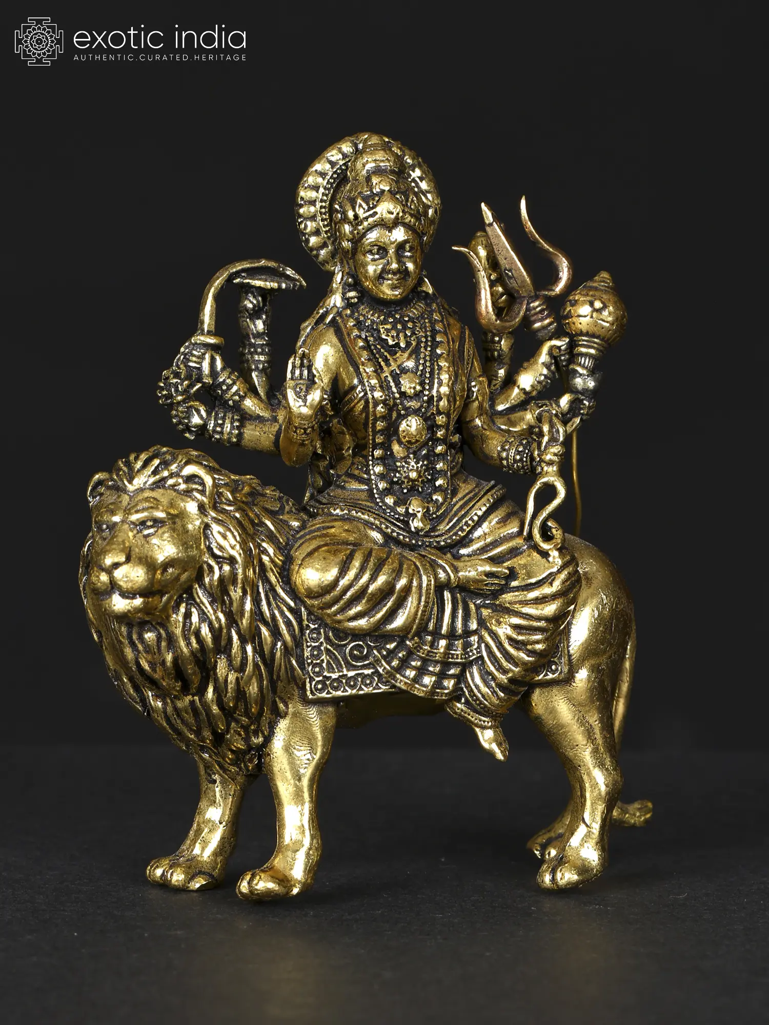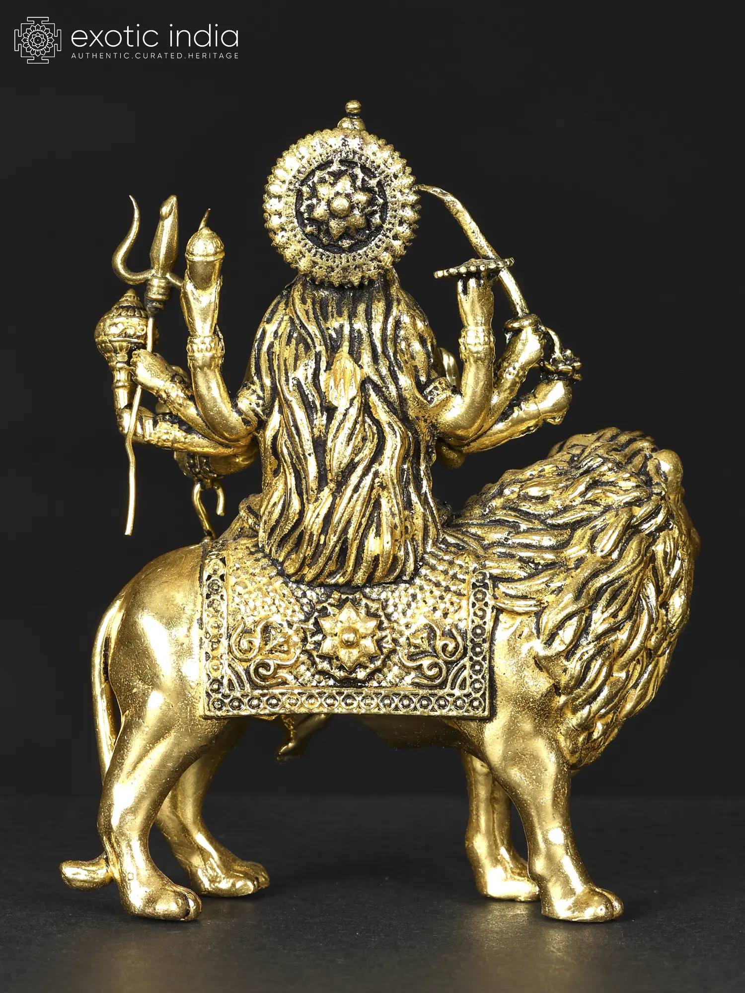 This ornate brass Durga statue, depicts Devi in her warrior’s form, in her Ashtabhuja or eight-armed roopa. She is adorned by a lovely saree and exquisite ornaments which are delineated with a mesmerizing detail. Sitting on the back of a Solomon and tranquil lion, Devi Durga smiles blissfully, filling the aura with her celestial presence.