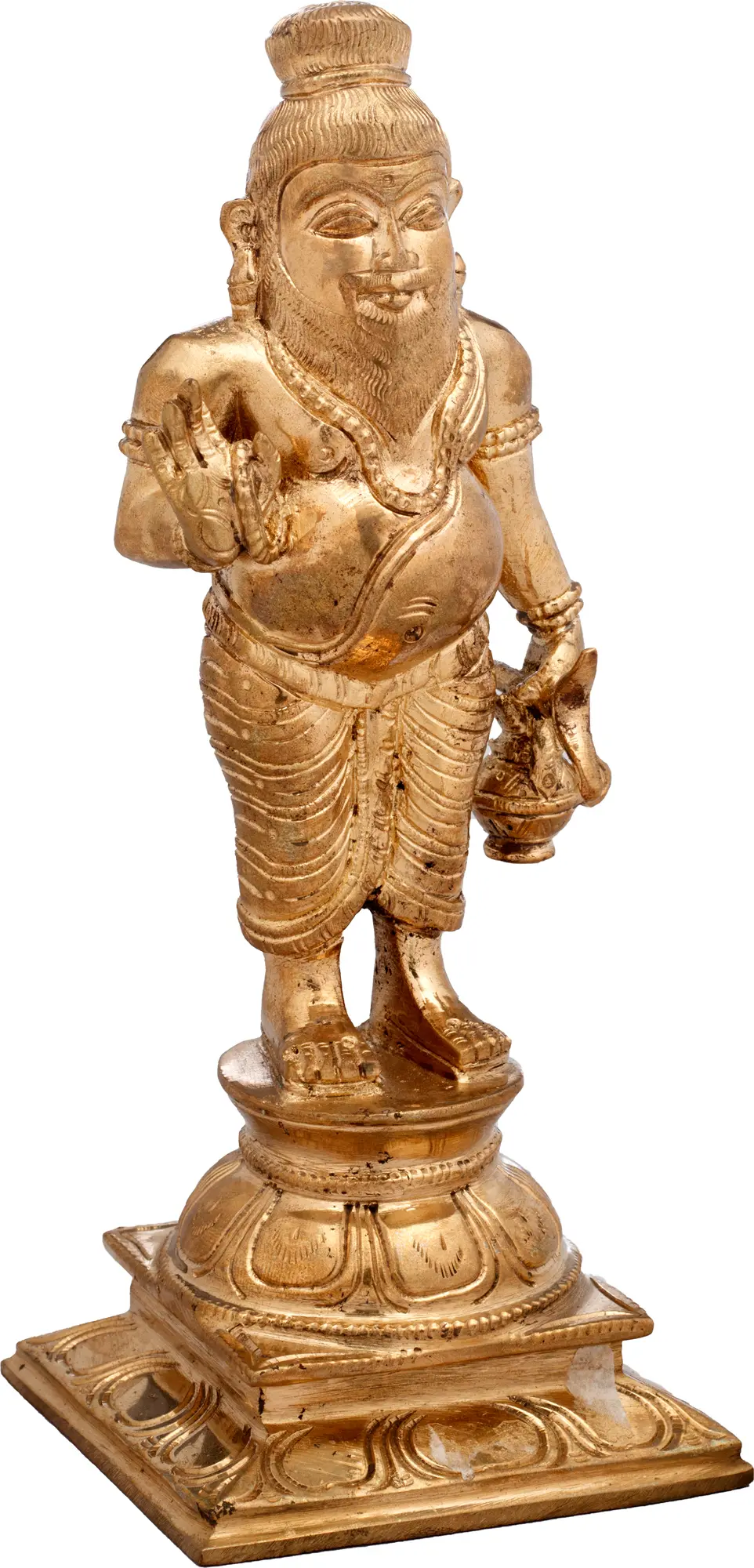 This exquisite bronze statue captures the essence of Sage Agastya, a revered figure in Hindu mythology, known for his wisdom, scholarship, and immense spiritual prowess. The artist has masterfully rendered Agastya with a serene and joyful countenance, his gentle smile radiating an aura of peace and benevolence. The statue, crafted in the traditional Panchaloha (five metals) technique from Swamimalai, a renowned center for South Indian metal craftsmanship, embodies centuries of artistic tradition and devotion.