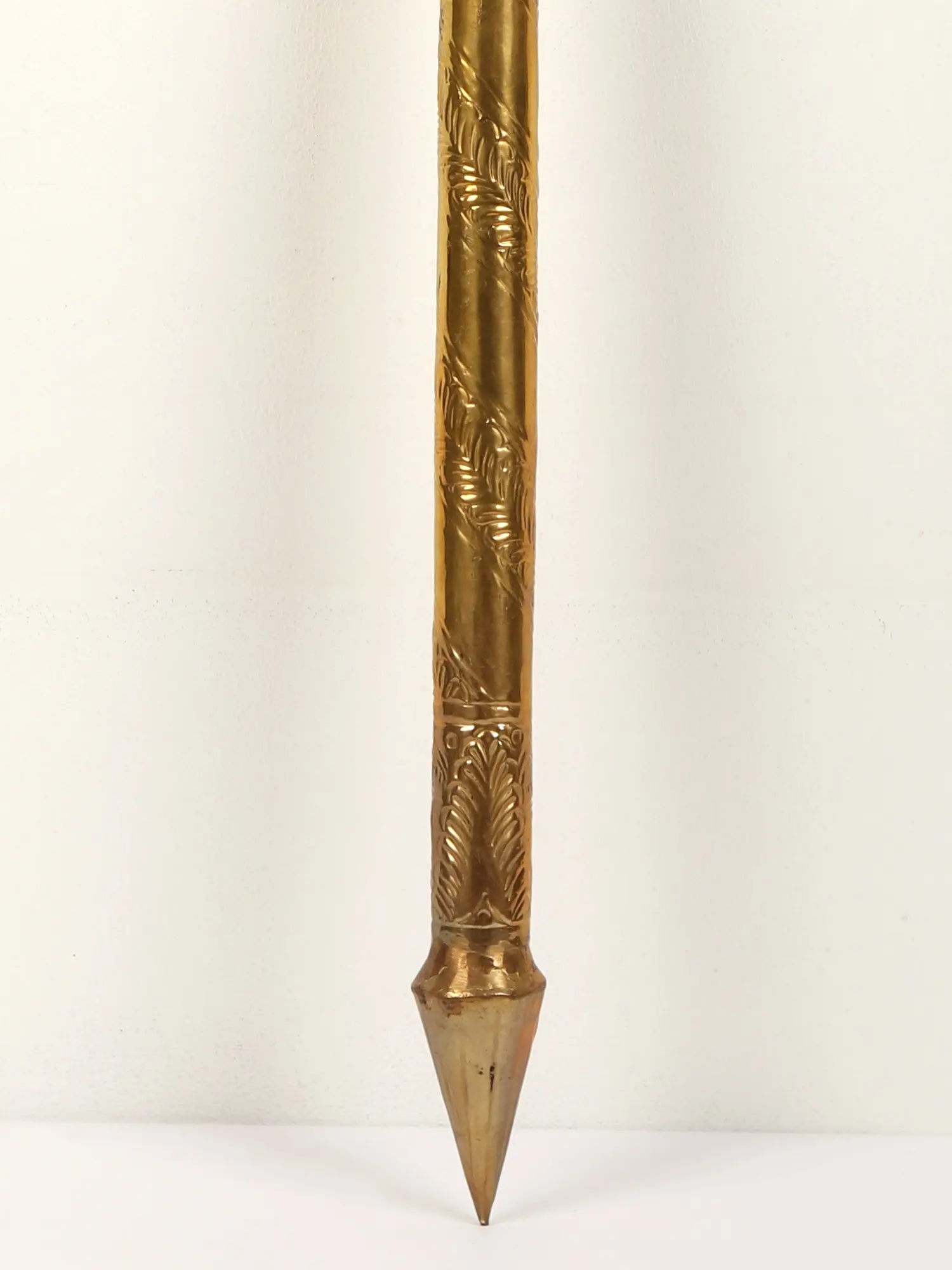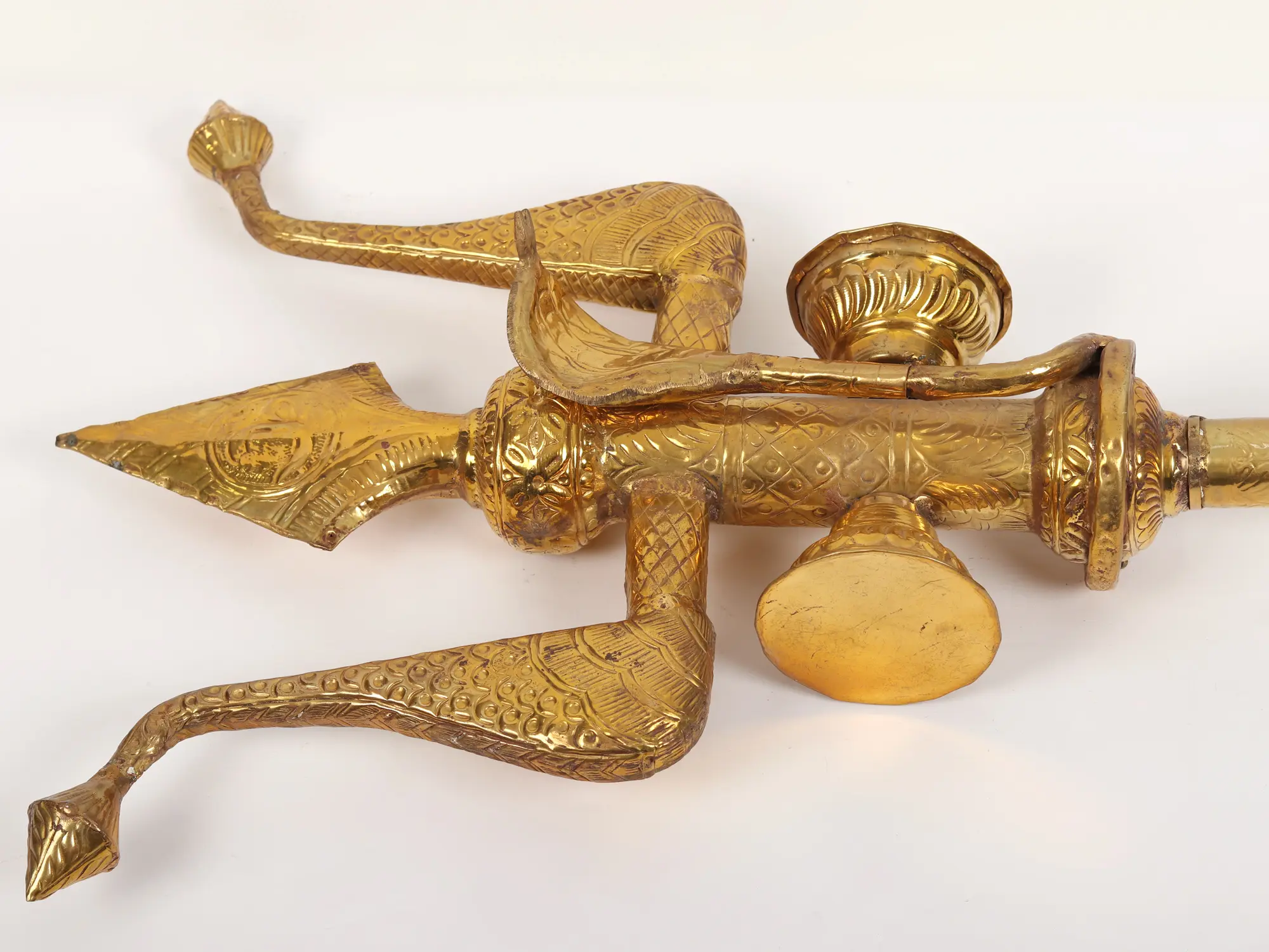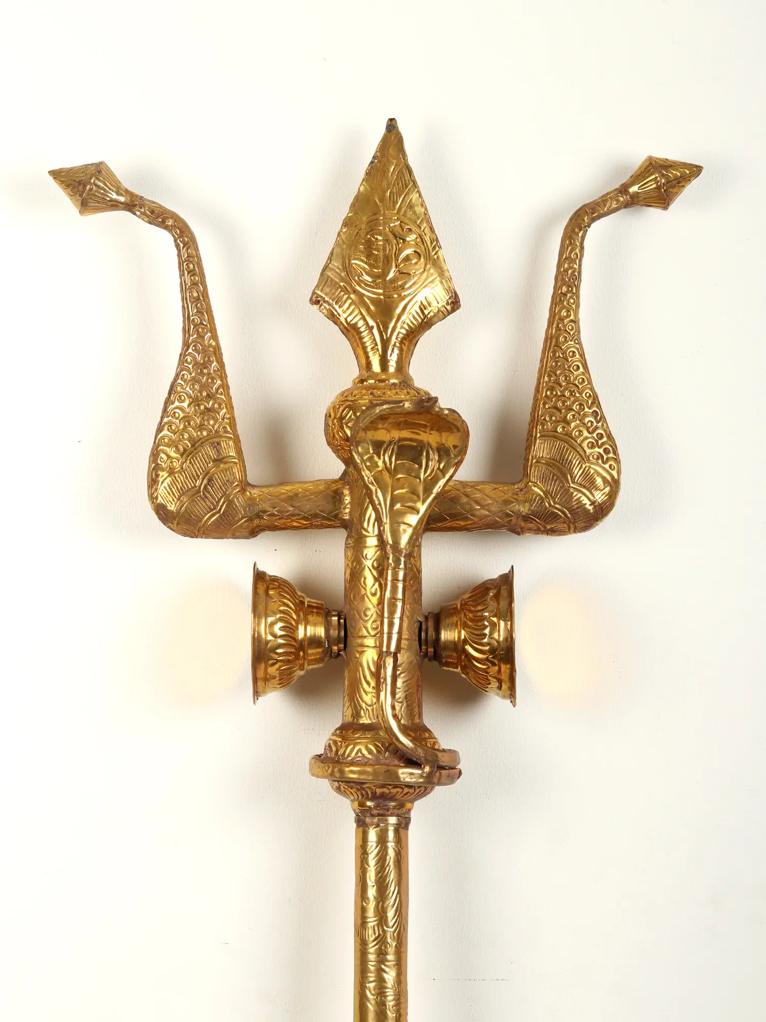 "In the serpent's embrace, wisdom unfolds." This Brass Trishul, adorned with intricately detailed snakes, weaves a tale of ancient wisdom. The serpent, often linked with Lord Shiva, symbolizes his transcendence over fear. Wrapped around the Trishul, it signifies the unison of primal energy and divine consciousness. The trident's prongs, like the three phases of time, underscore the cyclical nature of existence. This sculpture is a testament to the eternal dance of life and death, where transformation is celebrated, and fear is conquered—an invitation to embrace the unknown with courage.