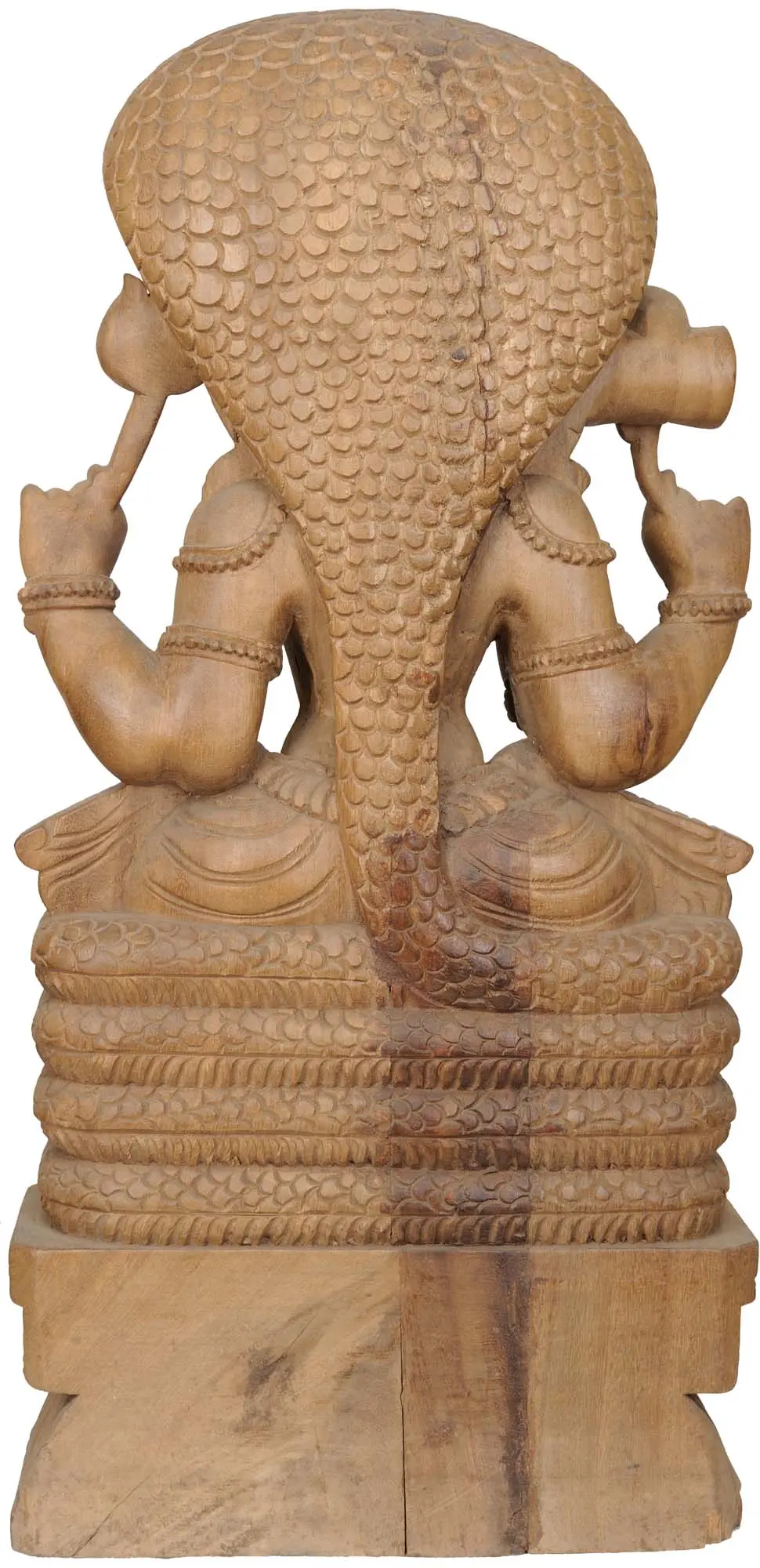 This exquisite South Indian temple wood carving depicts a formidable and benevolent goddess, seated regally upon a coiled serpent. The carving is a testament to the rich artistic traditions of South India, where wood has been a favored medium for centuries, used to create sacred objects and adorn temples. The deity is rendered with meticulous detail, showcasing the skill of the artisan who brought this powerful form to life. The texture of the wood itself adds a tactile dimension, inviting contemplation and reverence.