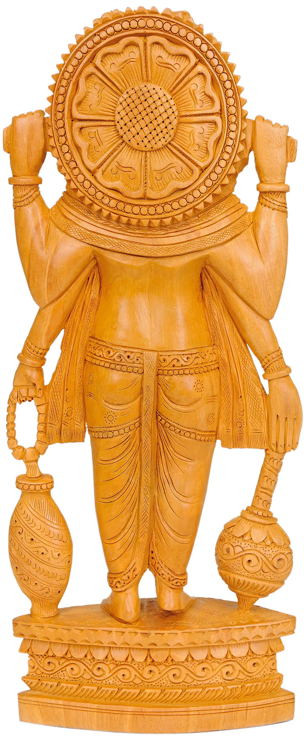 The sculpture is a testament to the rich iconography associated with Lord Brahma. In his hands, he holds symbolic objects that further elucidate his role in the cosmic order. One hand grasps a mace (gada), representing his power and authority to uphold Dharma, the cosmic law. The other hand holds a water pot (kamandalu), signifying the primordial waters from which creation emerged and the essence of life itself. The finely detailed floral garlands adorning his neck and the intricately patterned lower garments speak to the artistry and reverence with which this deity is worshipped. The stance of the deity, standing firmly on an elaborately carved base, further emphasizes his stable and foundational role in the universe. The choice of Kadamba wood, a favored material for intricate carvings in Jaipur, lends a warm and inviting aura to the sculpture. The natural grain of the wood enhances the depth and texture of the carving, making each detail stand out. Jaipur, known for its centuries-old tradition of wood carving, imbues this piece with a sense of heritage and authentic craftsmanship.