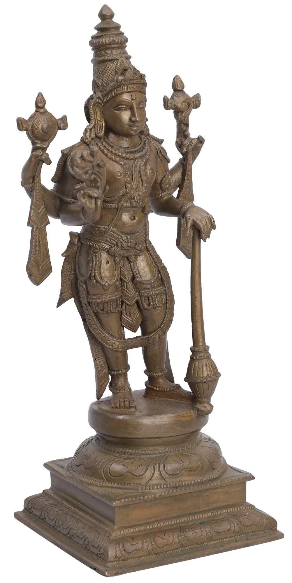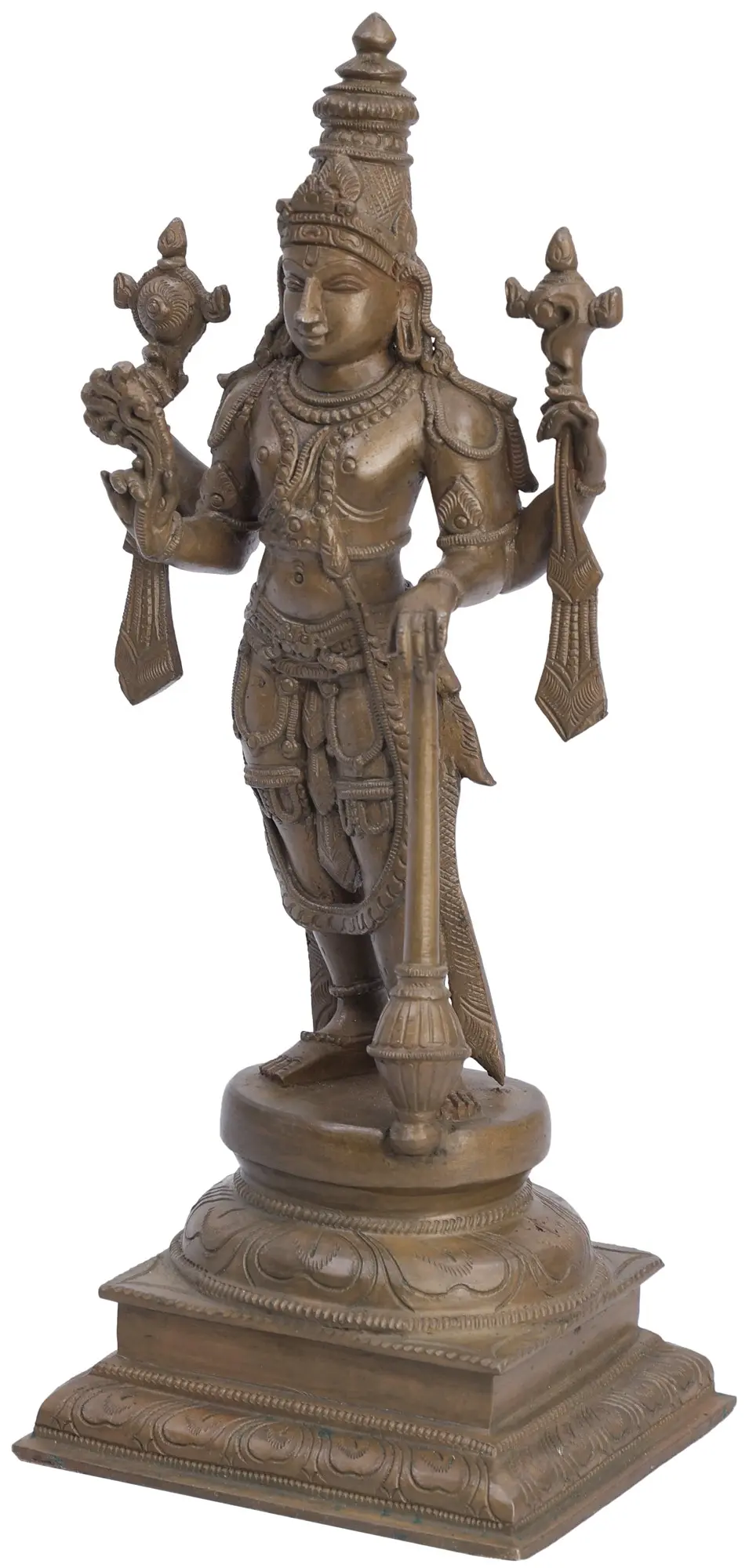 This exquisite bronze statue captures the essence of Lord Vishnu, the preserver and protector of the universe in Hindu tradition. Depicted in a dignified standing posture, the deity embodies cosmic order, grace, and boundless compassion. Crafted from high-quality bronze, the sculpture showcases intricate detailing that speaks to the artisan's mastery and the sacredness of the subject. Lord Vishnu is often visualized with four arms, each holding a significant attribute that symbolizes his divine powers and responsibilities. In this portrayal, his upper hands are raised, holding what appear to be the Sudarshana Chakra (discus) and a conch shell, while his lower right hand is in a gesture of blessing (abhaya mudra), and his lower left hand rests gently on a mace (gada). This powerful iconography is a testament to Vishnu's role in maintaining dharma and vanquishing evil. The attire of Lord Vishnu is rendered with remarkable precision, featuring a richly ornamented dhoti secured by a belt, and elaborate necklaces and armbands that adorn his divine form. The elaborate headdress, or mukuta, is a symbol of royalty and spiritual authority, pointing towards the celestial realms. The serene expression on his face, with his eyes gently cast forward, suggests a state of profound contemplation and unwavering vigilance over the cosmos. The sculpture is presented on an ornate pedestal, adding to its grandeur and emphasizing its divine presence. The base itself is intricately carved with decorative motifs, signifying the solid foundation upon which the universe is built and the meticulous care with which Vishnu upholds it.