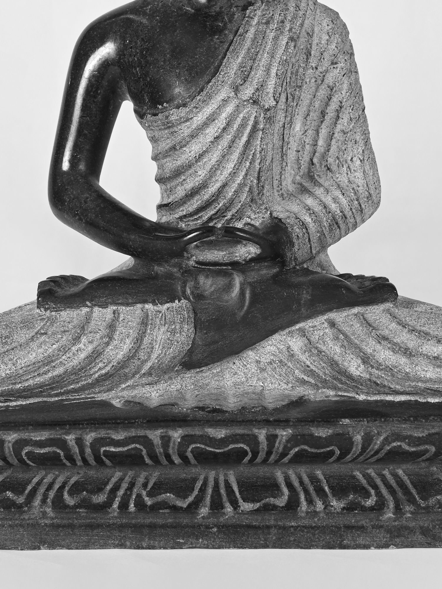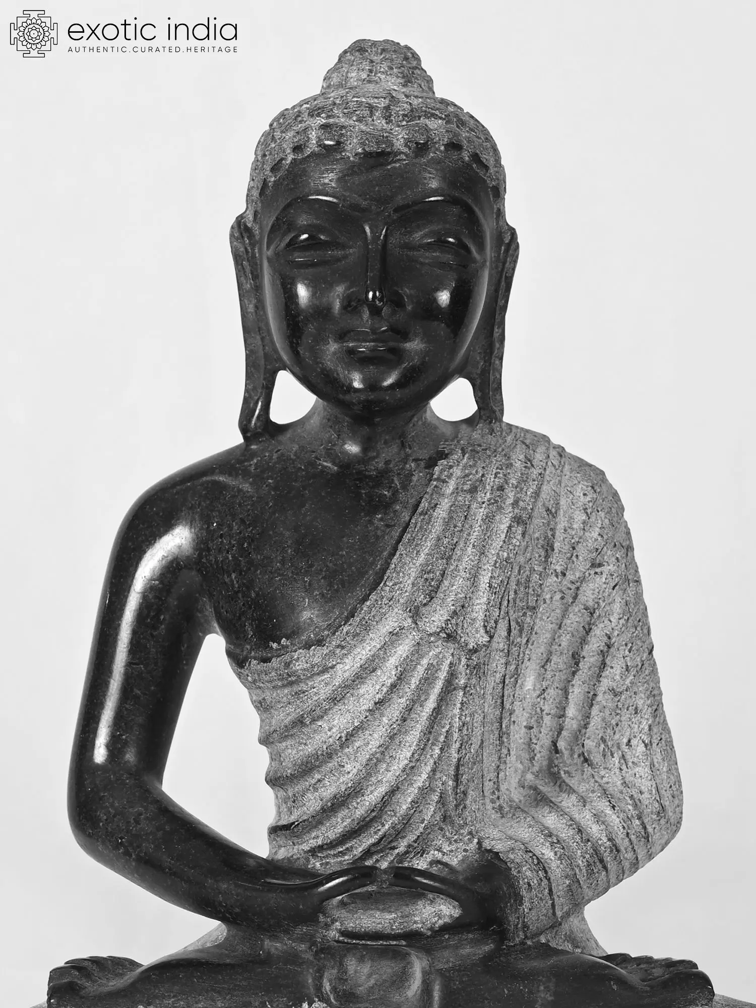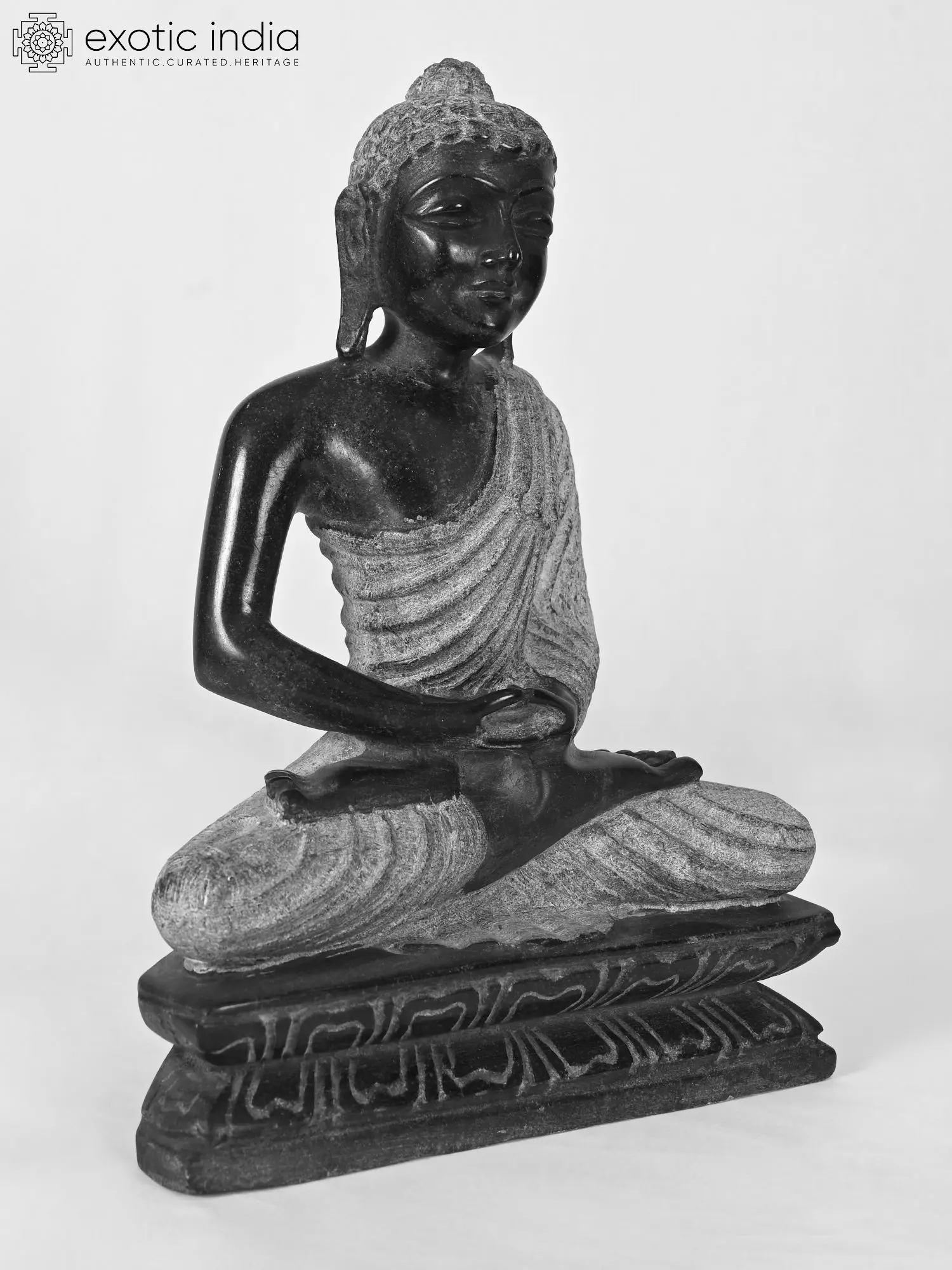 Standing at ten inches tall, this artwork possesses a commanding yet delicate presence. You will appreciate the subtle variations in the marble's texture, which bring a lifelike quality to the sculpted drapery and the figure's form. The artist's choice to depict the Buddha in a classic seated meditation pose, with hands resting in his lap, evokes a profound sense of stillness and concentration. The intricately carved lotus pedestal further enhances its visual appeal, providing a stable and dignified foundation.