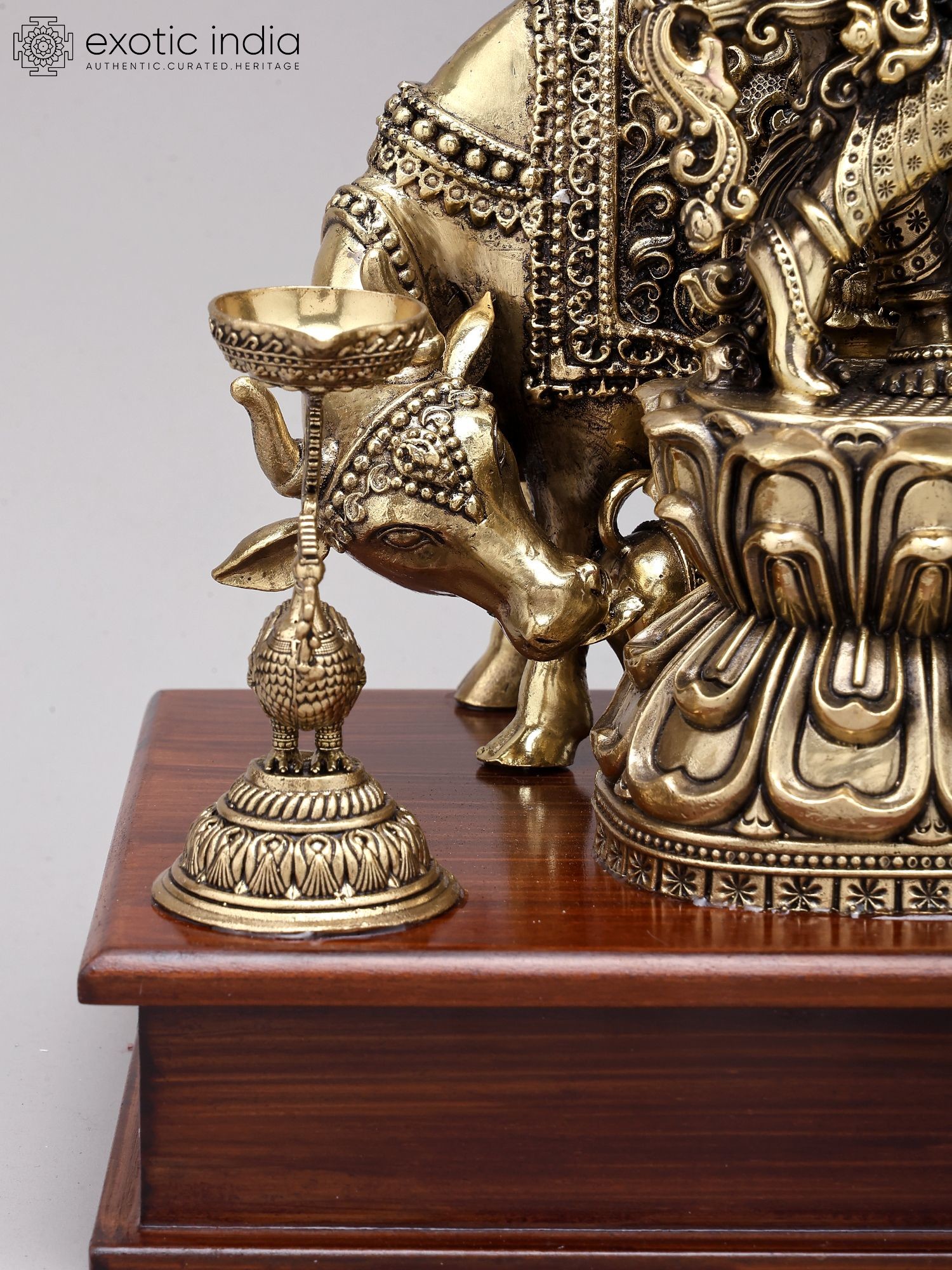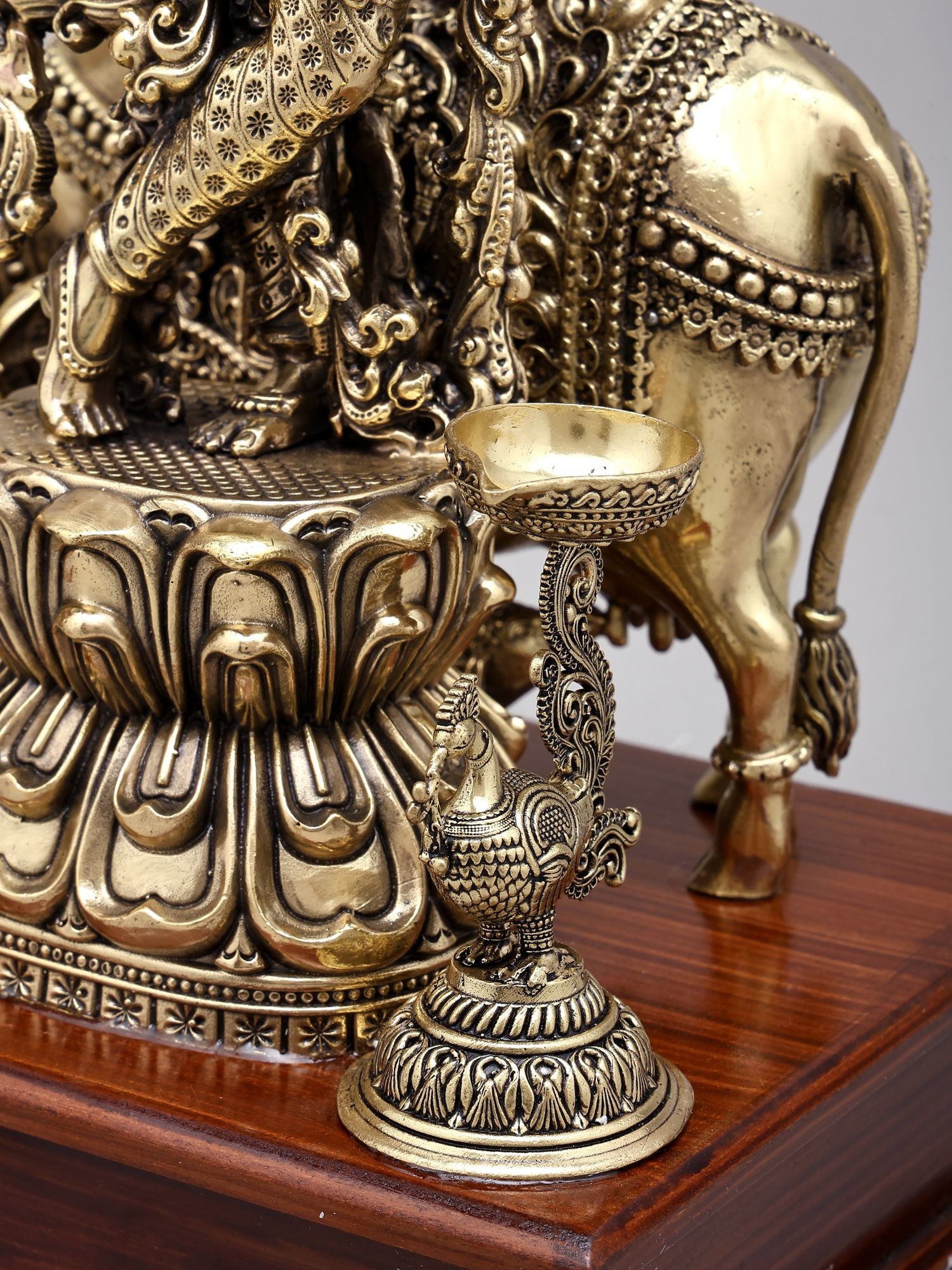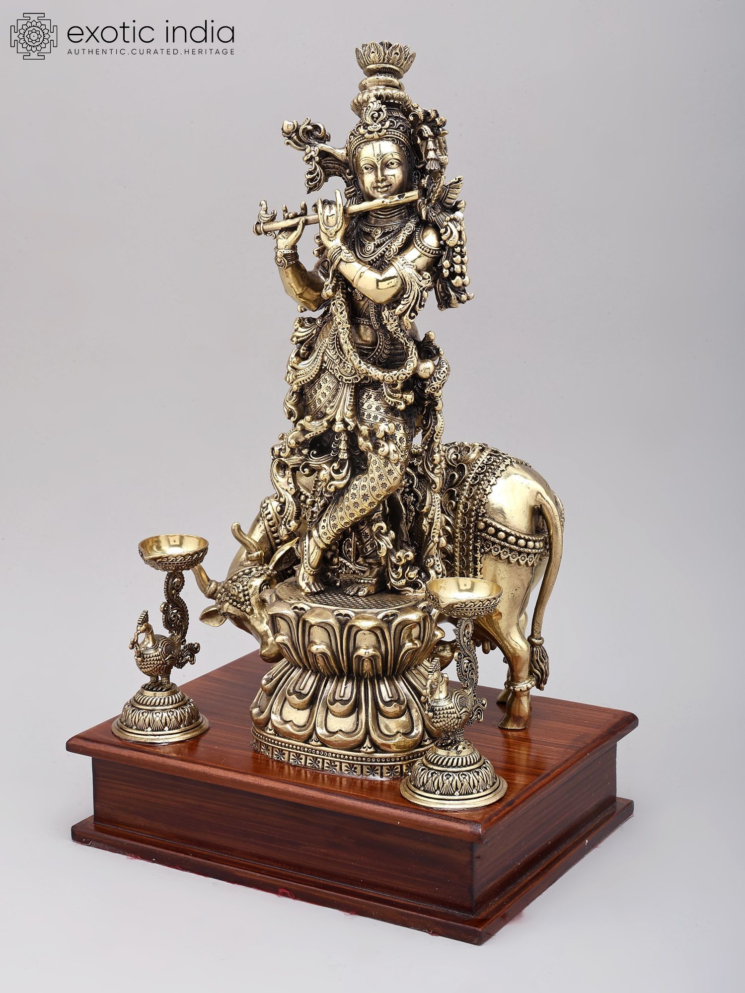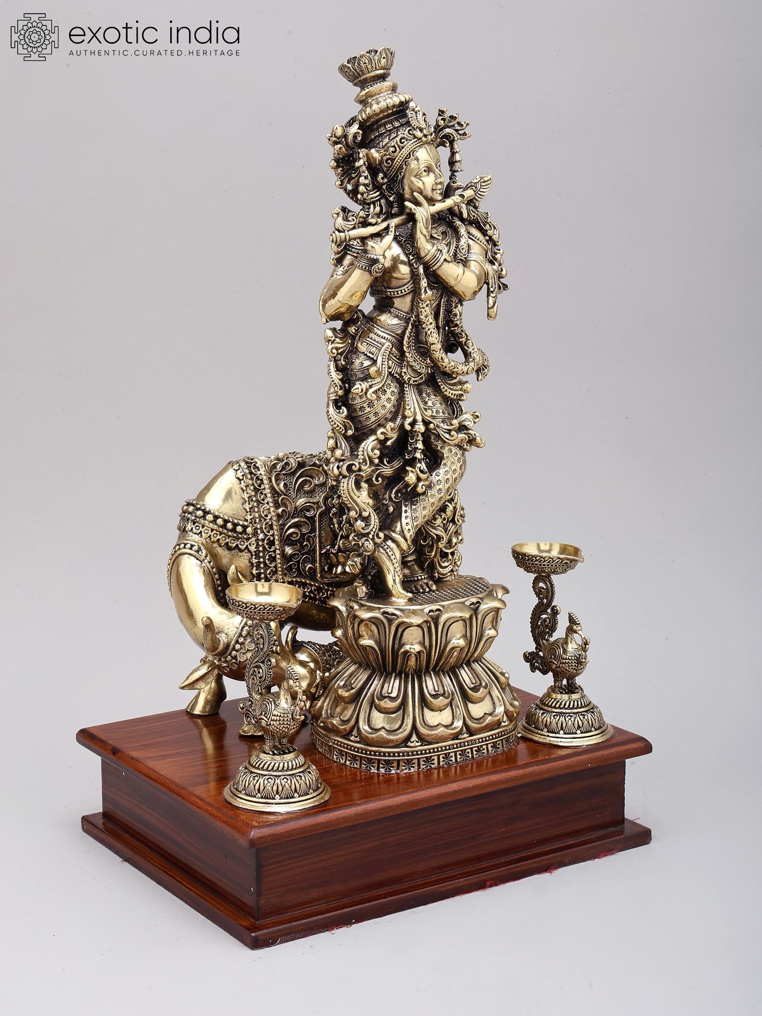 12" Superfine Fluting Krishna with Cow and Calf and Oil Lamps | Brass Statue on Wood Base