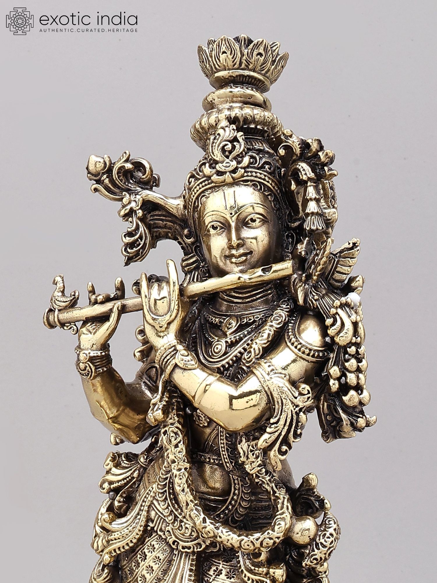 Brass Statue of Fluting Lord Krishna with Cow and Peacock - 5 Inches
