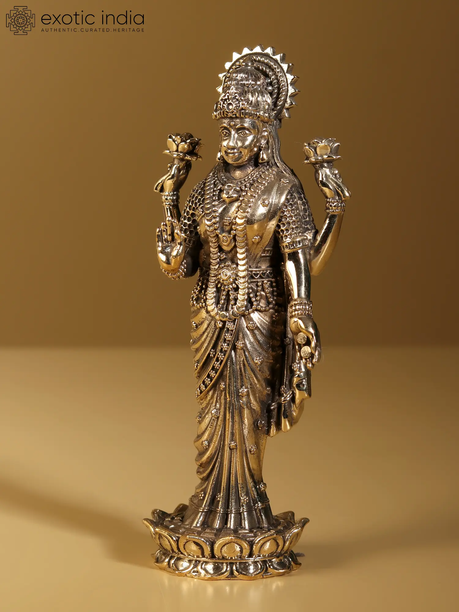 A murti of goddess Lakshmi in your place of worship is a powerful presence of the great goddess and a source of auspiciousness eternal. This superbly crafted, superfine brass statue makes for a divine icon for your Puja ghar, depicting the heavenliness of Sri Lakshmi in the most exquisite iconography. Goddess Lakshmi stands on a finely delineated lotus, wrapped in a lovely saree whose folds are realistically captured in metal. Charming floral motifs, a bejwelled girdle, a necklace of gold coins, gemmed ornaments, an ornate waistband, and the regal crown of the goddess are depicted with such meticulousness, that the icon achieves an iconic effect not because of their scale but because of its elaborateness.