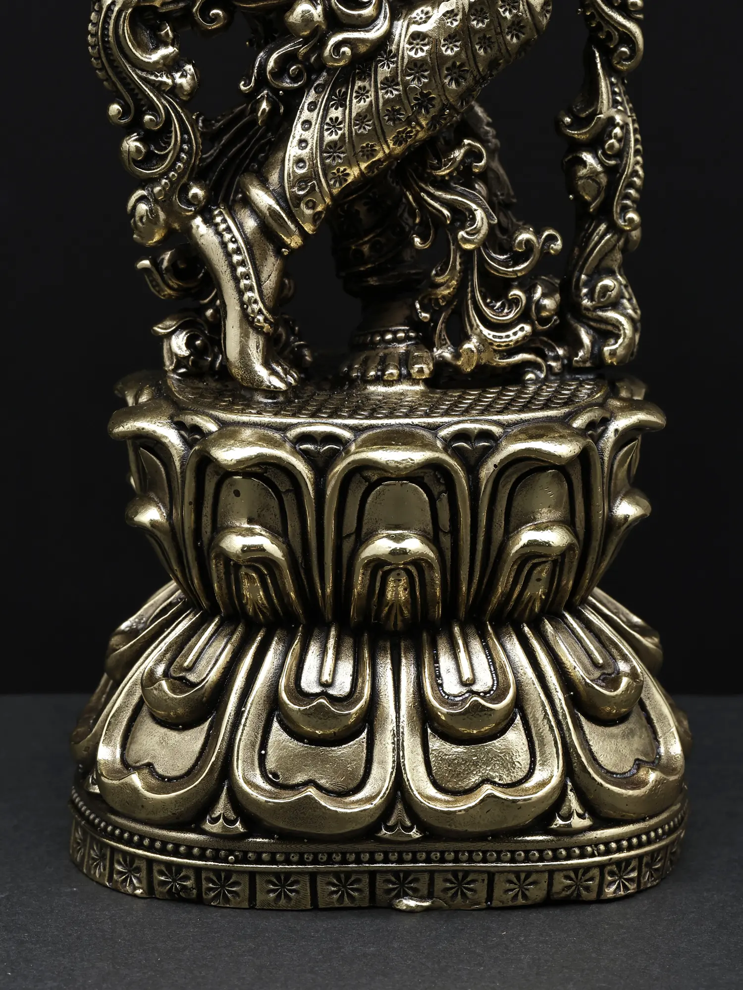 This statue showcases the exceptional craftsmanship of skilled artisans. The intricate fluting, the delicate detailing of Krishna's attire, and the carefully rendered features all speak to the dedication and skill involved in its creation. Made from high-quality brass, the statue boasts a rich, warm tone that enhances its inherent beauty. The lotus-shaped base adds to the statue's elegance, symbolizing purity, enlightenment, and the cycle of life. This level of artistry makes this piece not only a beautiful addition to your home but also a valuable collector's item.
