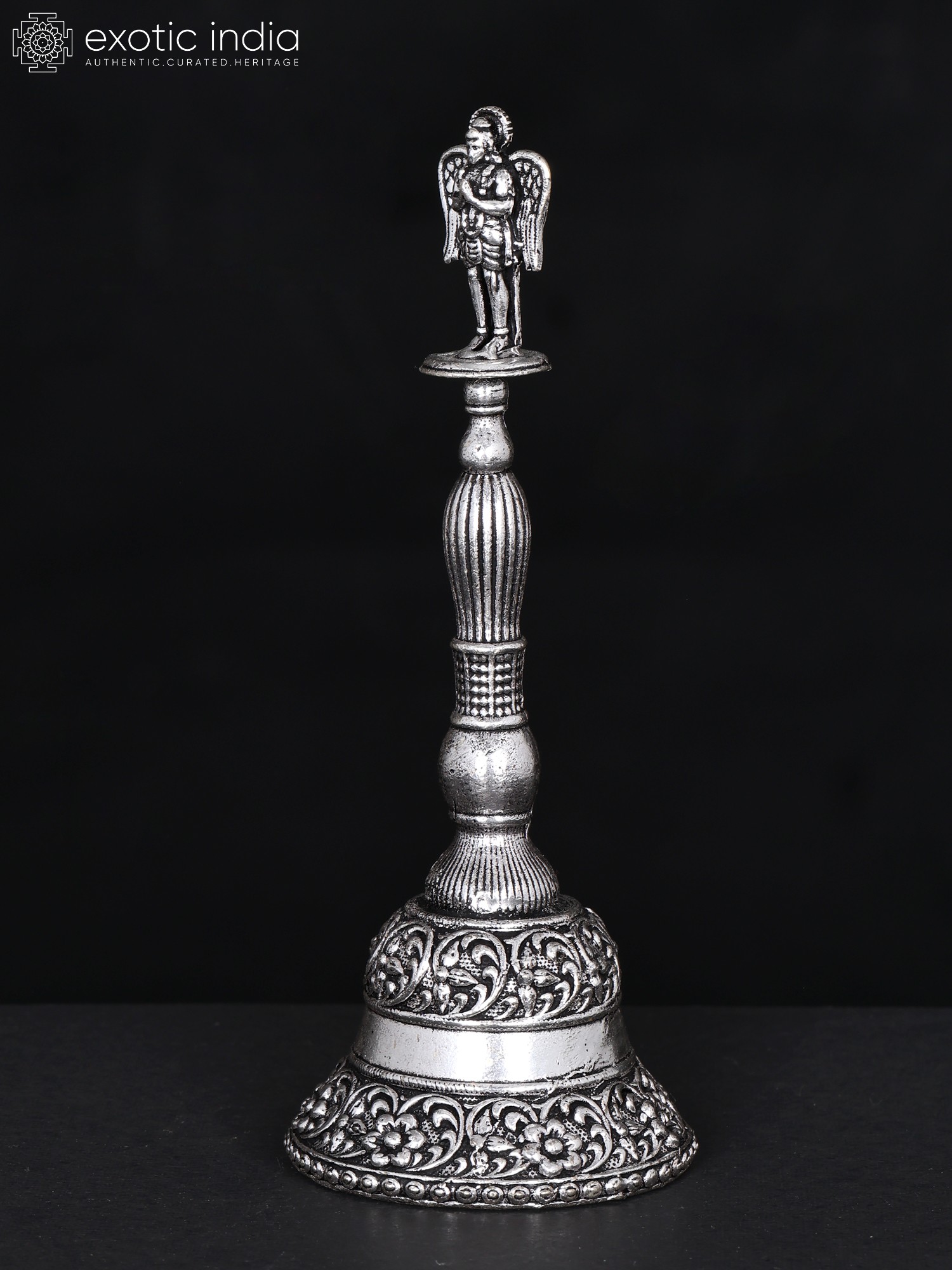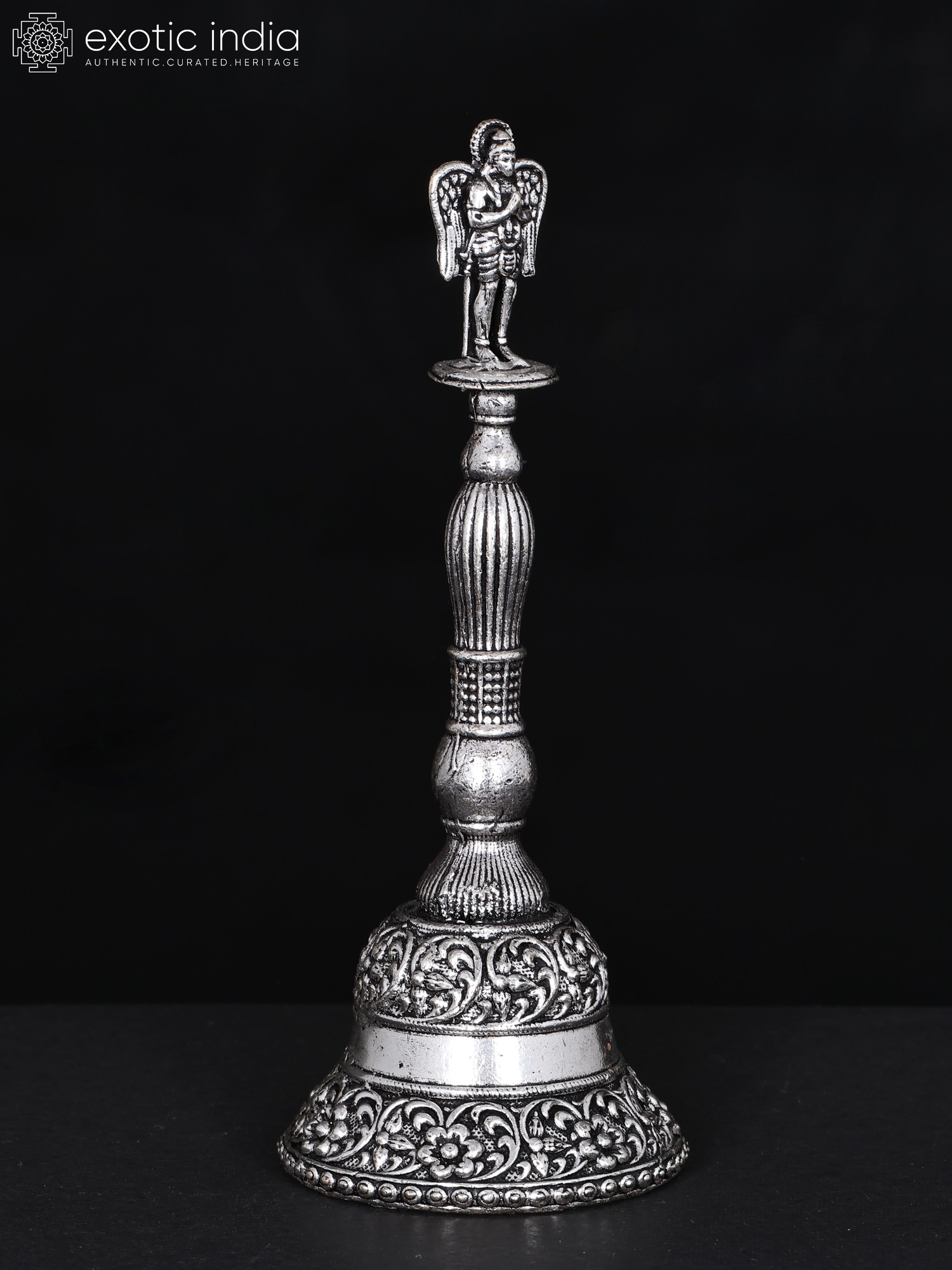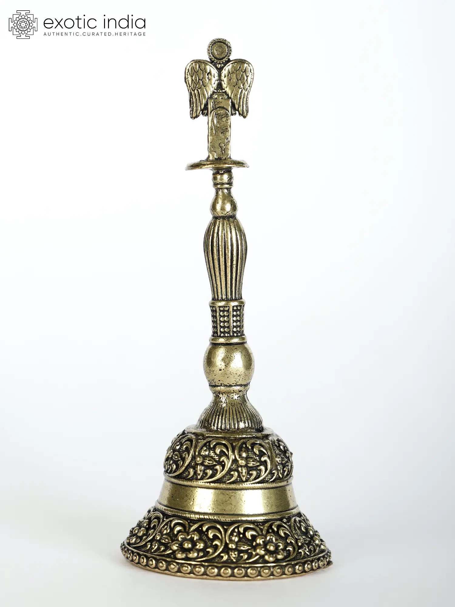 Designed in a very unique way and multiple different layers of motifs, the bell has a curved handle and the body is beautifully ornamented with decorative vines. On top of the bell, Lord Garuda stands promising protection and peace in a namaste stance.