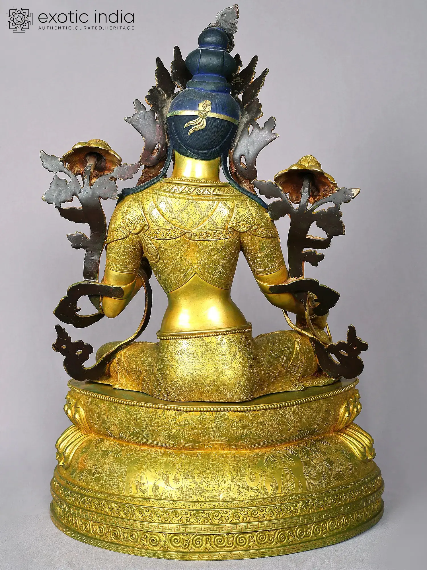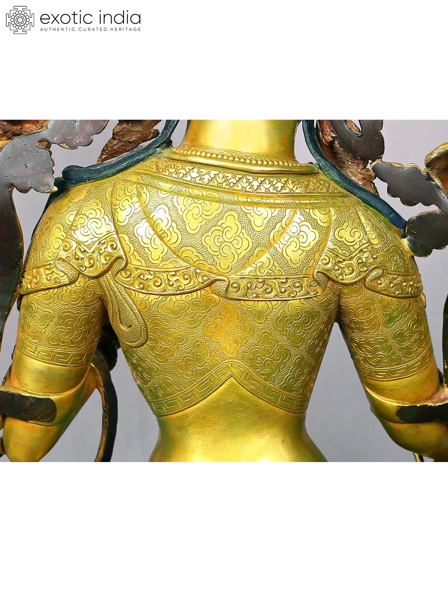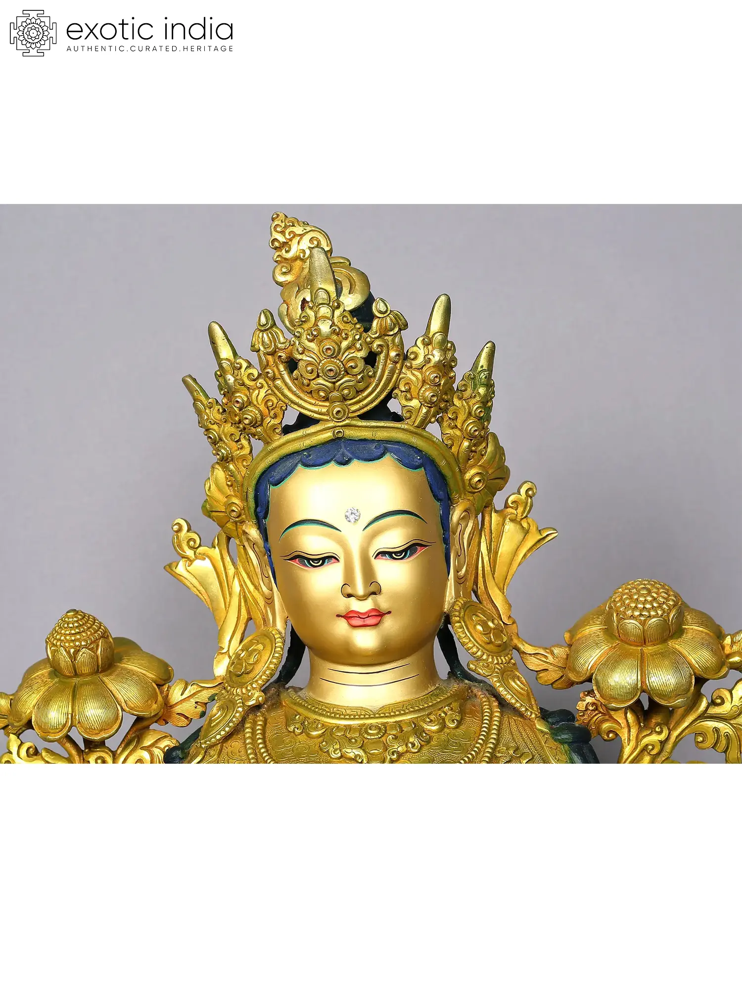 Bathed in pure gold, this Nepalese statue of goddess Green Tara is a majestic ode to the Buddhist saviouress. The icon is unbelievably animated- with the lithe limbs of Tara, diaphanous attire with detailed brocade patterns, exquisite ornaments, and the suppleness of the lotuses in her hands.
