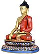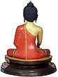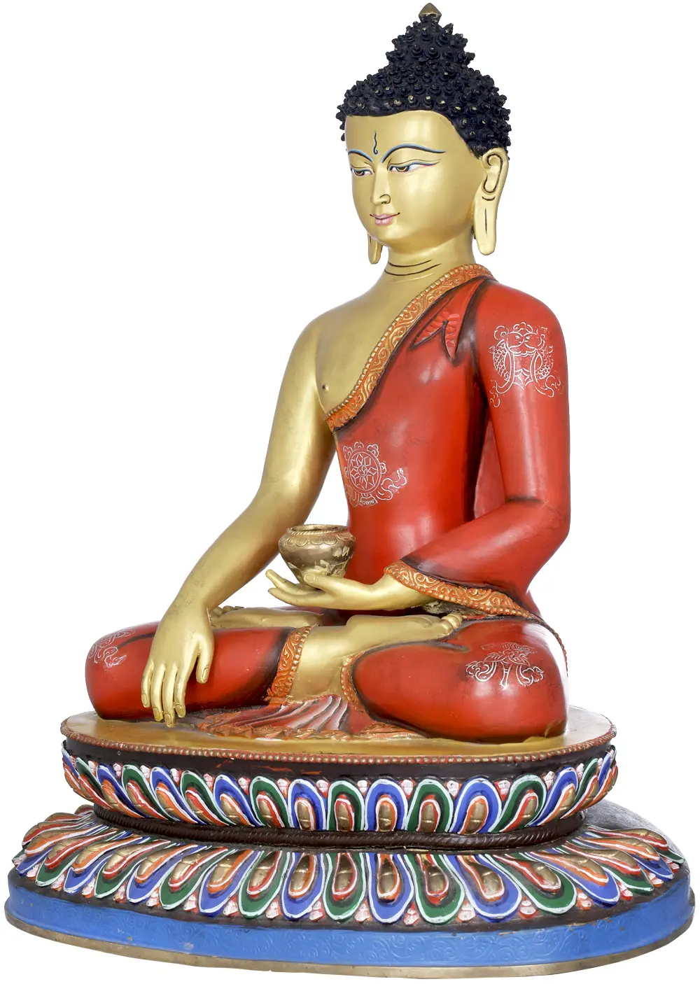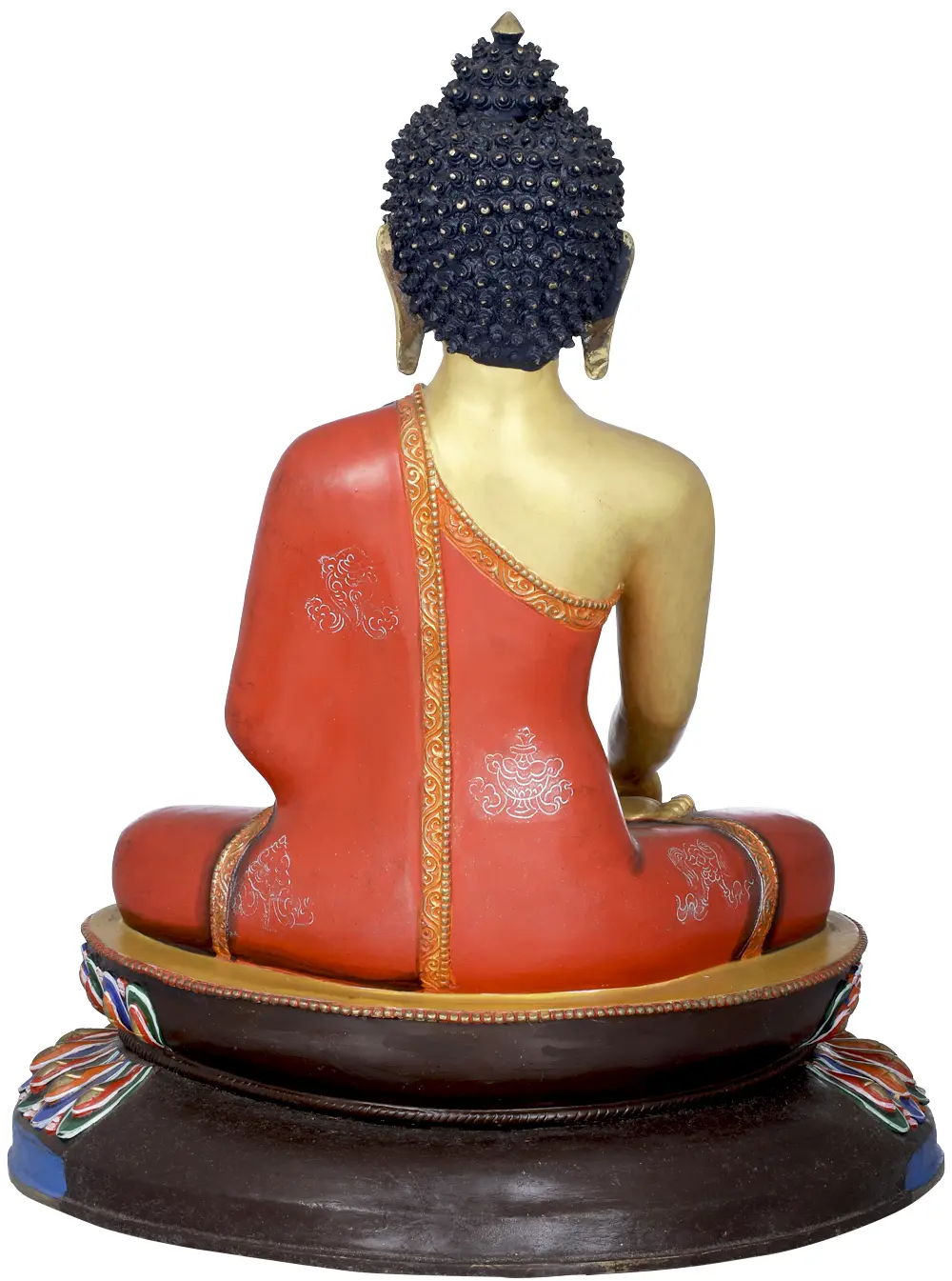 This Buddha is seated on a blue and green double lotus, contrasting beautifully with the 24 karat gold gilded sculpture, wearing an orange colored robe having a thin border with white colored Ashtamangala signs (endless knot, lotus, dhvaja, dharmachakra, bumpa, golden fish, parasol and conch) carved on it. These signs are the eight auspicious symbols endemic to various religions, Hinduism, Jainism and Buddhism representing the various teaching tools. This posture is the Bhumisparsha Mudra, where Buddha is seated in a meditation position; right hand rests on right knee and touches the earth or calls the earth to witness, left hand rests on the lap with the palm facing upward holding a pot, it represents the moment when Buddha became enlightened underneath the Bodhi tree. Long ears symbolize his ability to listen ‘all’ and hence cure ‘all’. Third eye signifies the knowledge and wisdom that one achieves through meditation. His hair are in the form of snail shell curls because it is said that he was in meditation for such a long time that snails started to slid up on his body and rested on his head. Two curved lines on his neck are symbolic of his deep and melodious voice.