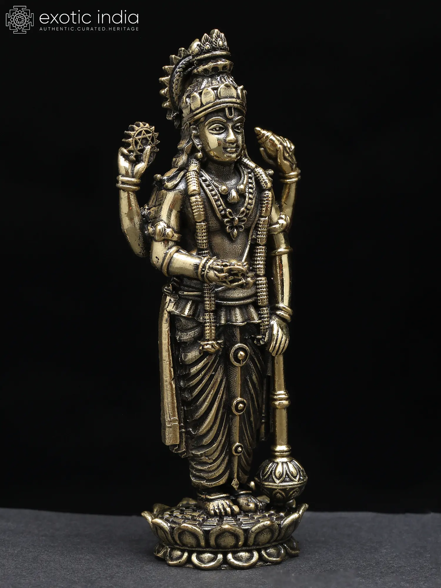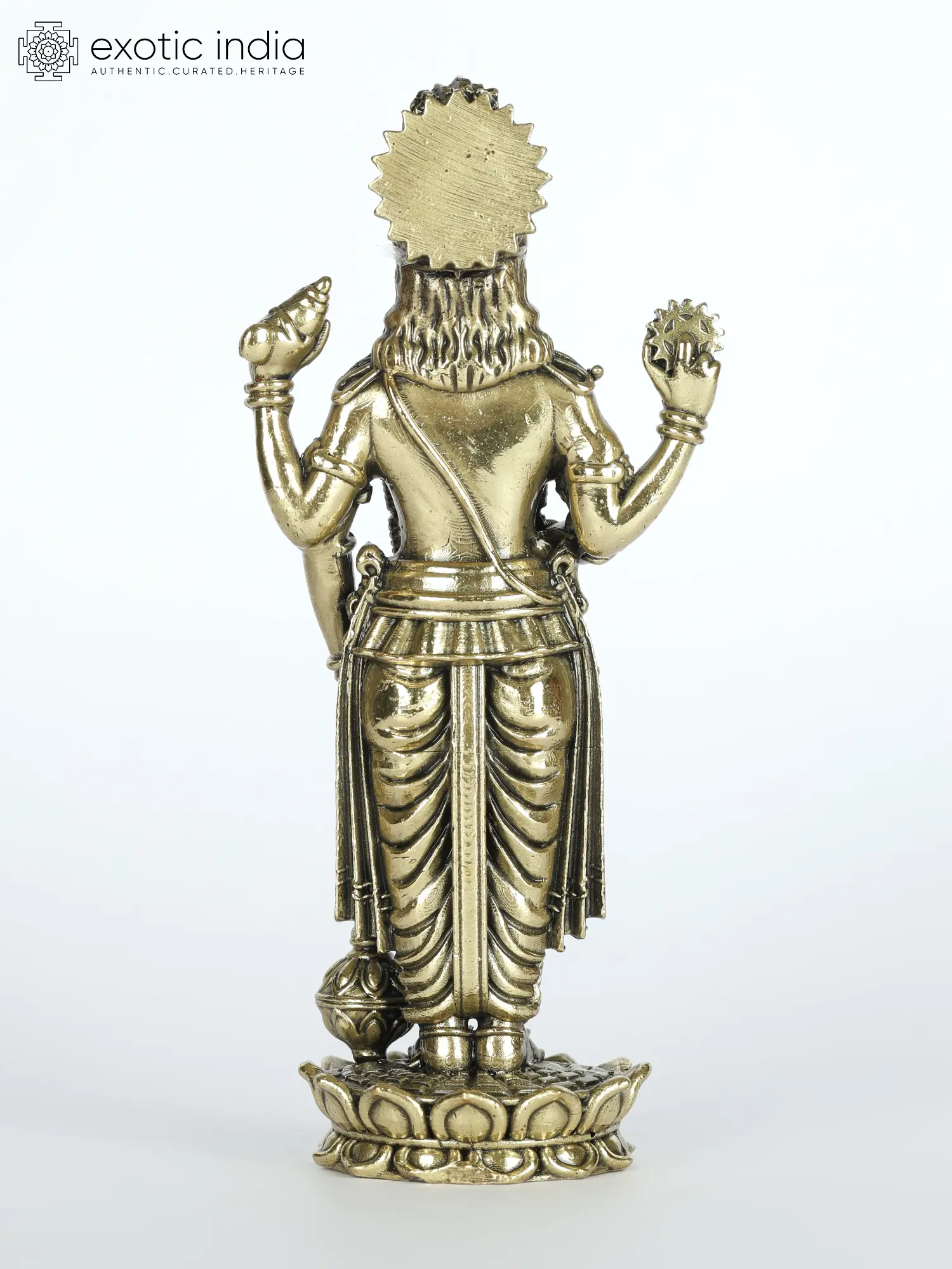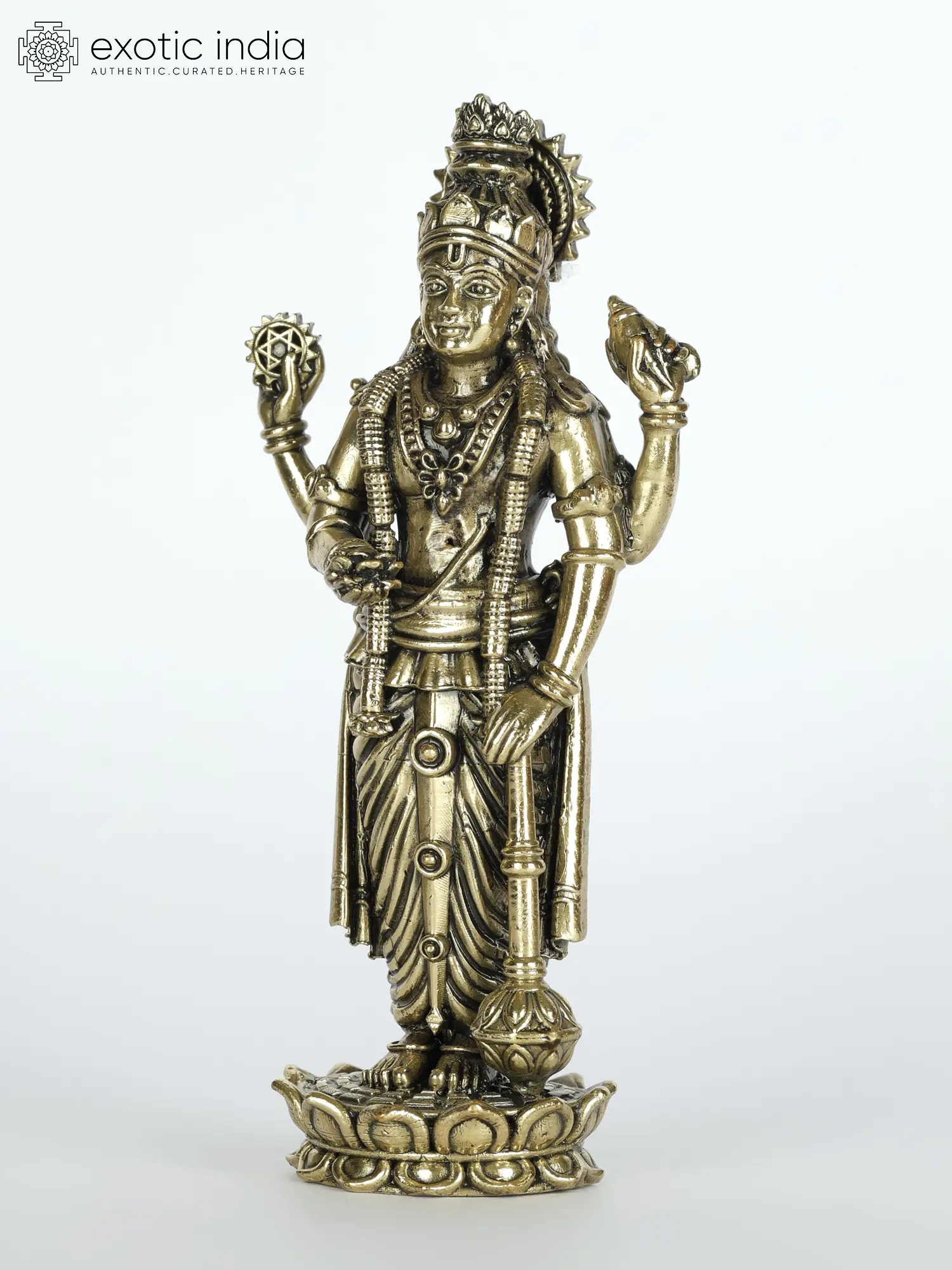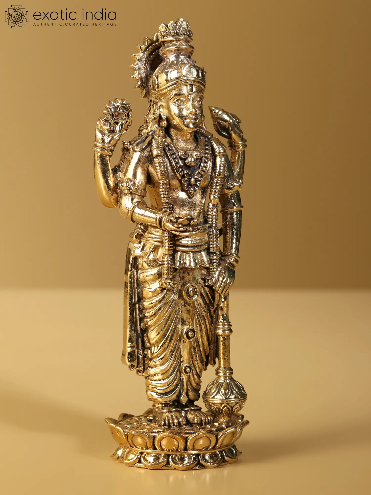 In the cosmic theater of divinity, Lord Vishnu, the preserver and sustainer of the universe, stands ethereally on a blooming lotus, a vision of sublime grace. His upper hands cradle the “Panchajanya”, a celestial Conch Shell, and the Discus named “Sudarshan”, resonating power and cosmic order. A Lotus rests delicately in his lower right hand, while the left wields the formidable Mace named “Kaumodaki”. Bedecked in regal attire, Vishnu, is adorned with the Kaustubha gem, a beacon of spiritual splendor, and a Vaijayanti garland weaves the fragrance of forest blooms.