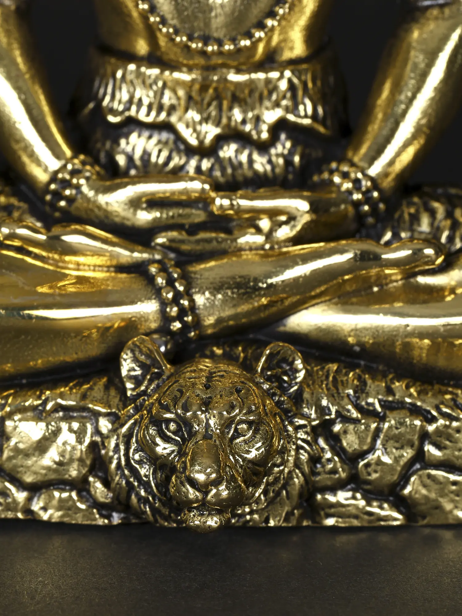 Lord Shiva sits on a tiger skin, adorned with Nagas, symbolizing his mastery over primal forces. The Trishul, adorned with the sacred symbol of Om at its juncture, signifies his connection to the cosmic energy. This exquisitely crafted statue captures the essence of Lord Shiva's divine attributes, radiating strength, serenity, and spiritual depth.