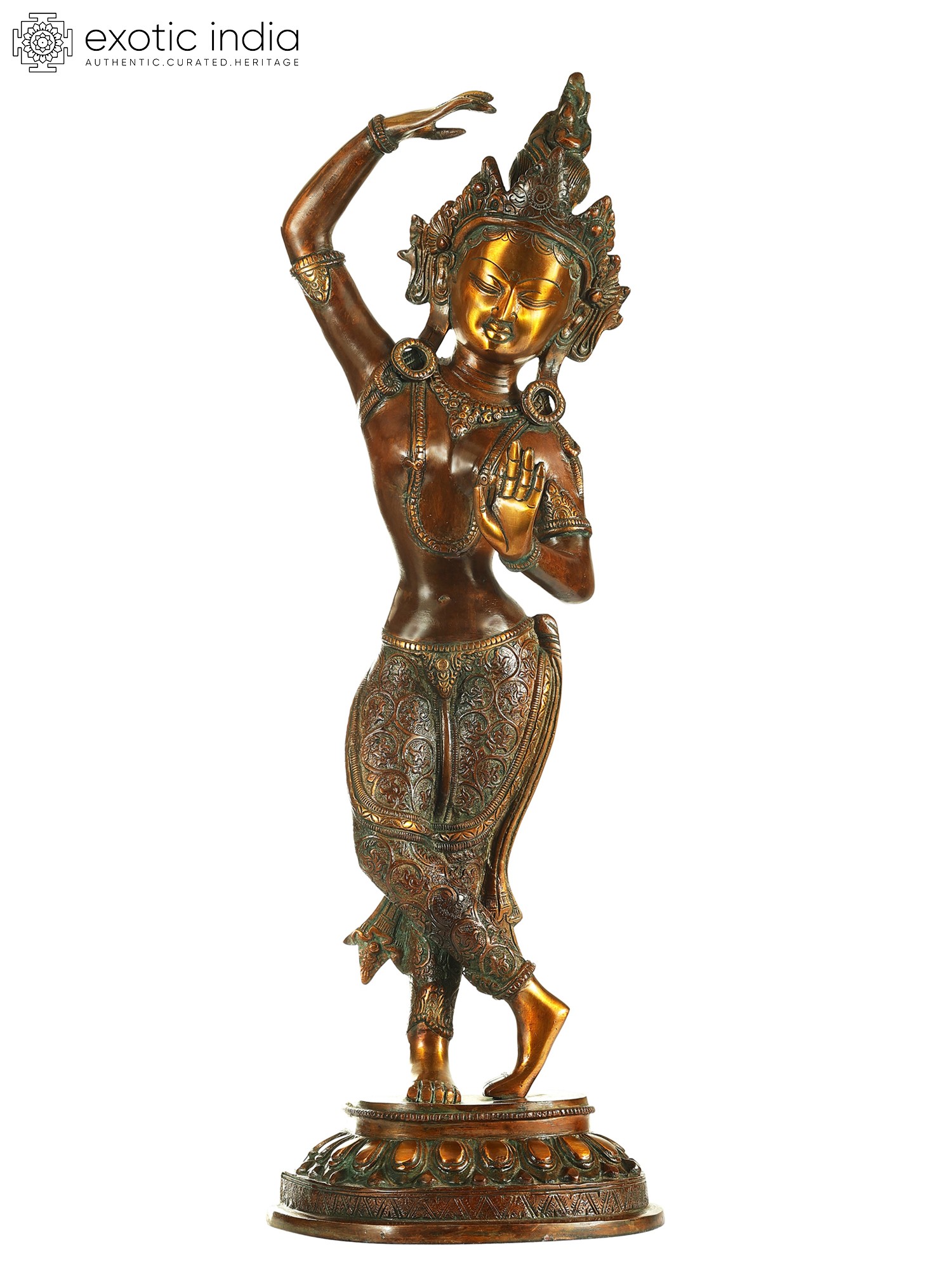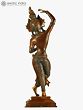 In the superb brass sculpture that you see on this page, She is depicted standing with an arm raised above Her head. She is clad in a richly embroidered dhoti tied below the navel, its hems gathered slightly above the ankles. There is nothing but shringar to clothe Her upper body, the most statement aspect of which is the gold karnakundalas grazing Her feminine clavicular structure.