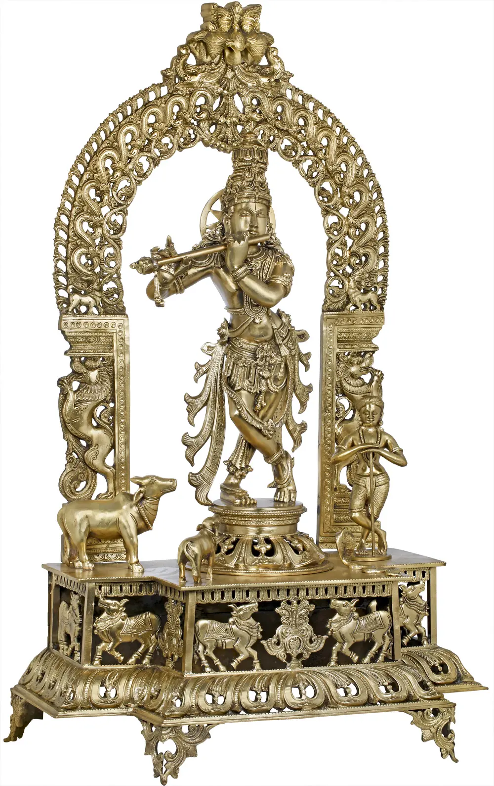On one side of the Lord is a pair of His beloved cows, both mother and calf gazing upon Him with reverence. To the other, a wide-hooded snake slithers up to His pedestal. Sudama stands to one side with His feet crossed the same way as his divine friend, His stance one of pure contentment that comes from simply being next to Him. The pedestal on which the whole arrangement lies has a panel sculpted symmetrically with more upward-gazing cows. The statement-making aureole is the grandest part of this composition. It is grounded on a pair of Yalis, which betrays the South Indian origin of the handiwork. Soft, glimmering bronze in ringlets of varying thicknesses forms an arc above the Lord’s head, culminating in an overpowering Kirtimukha motif. Such a work has the power to keep away adharma from where it is enshrined, as well as establish dharma in its stead.